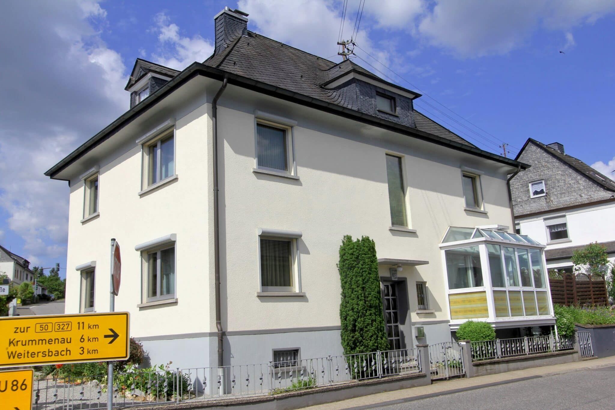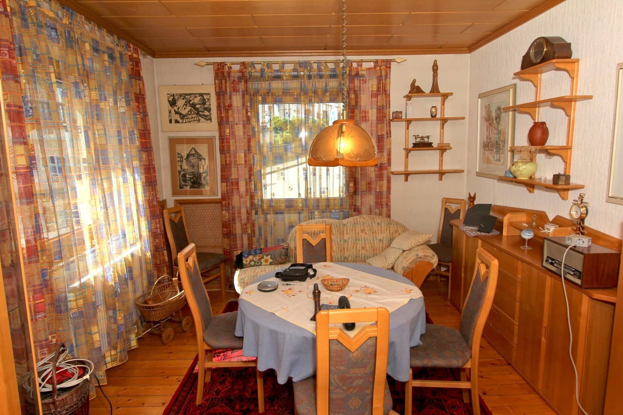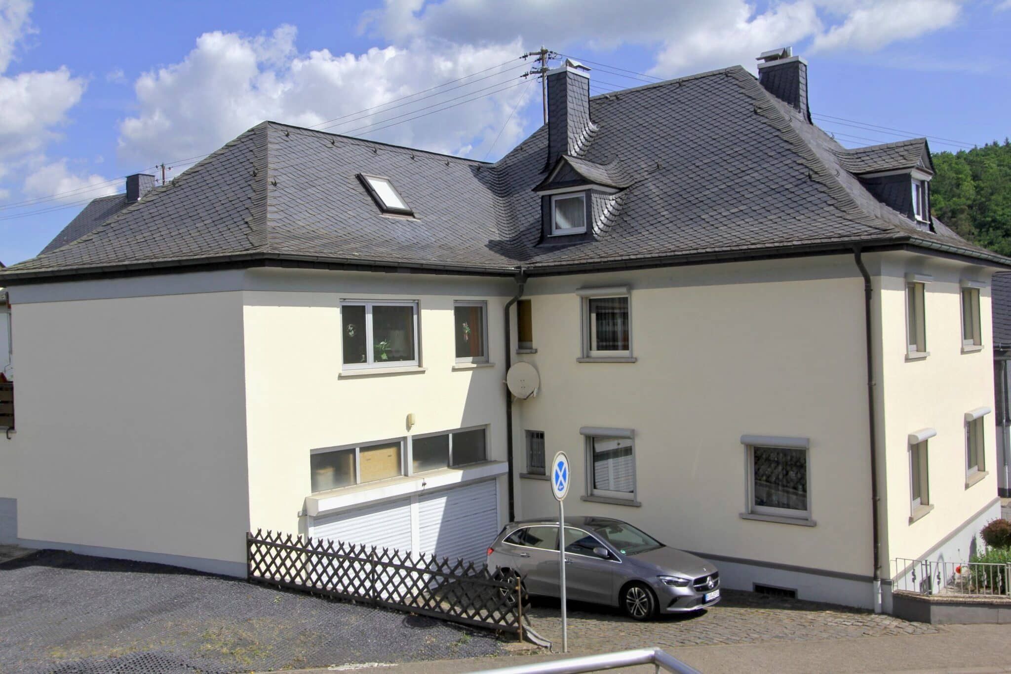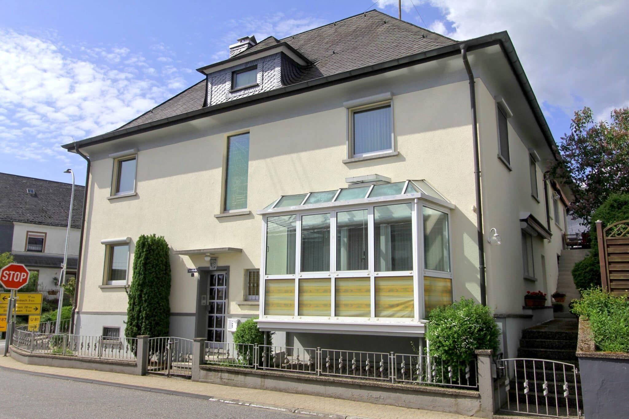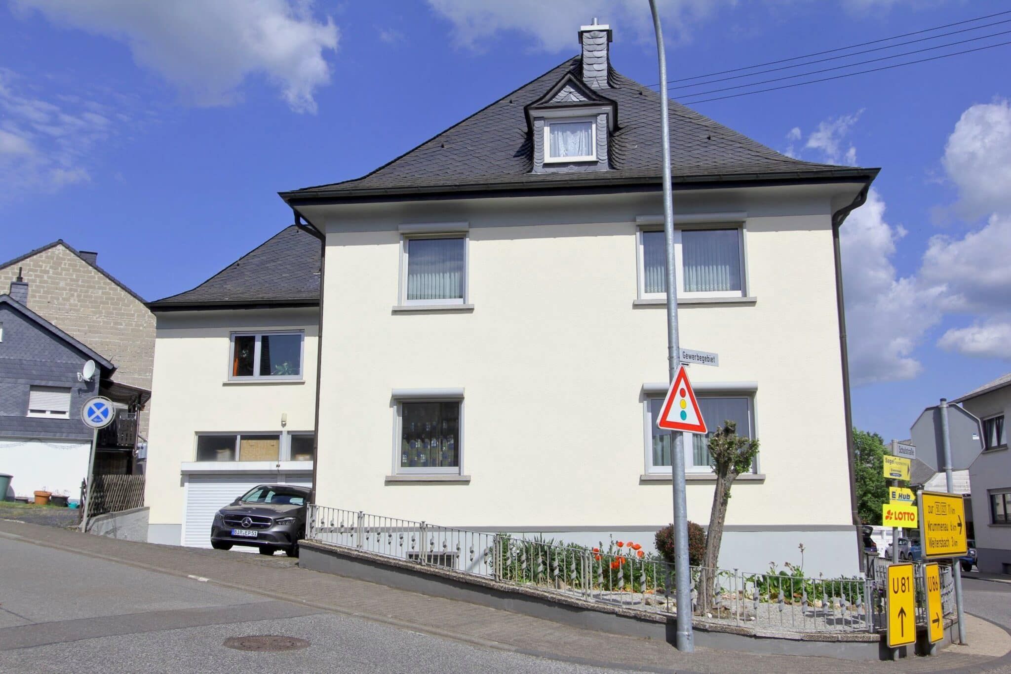 In der Schulstraße, zentral gelegen, wurde im Jahre 1936 dieses repräsentative Anwesen als Wohn- und Geschäftshaus erbaut. 1961 wurde die ehemalige Garage zu Wohnraum umgebaut und 1970 die Terrasse zu einem neuen Gebäudeteil mit Walmdach aufgestockt. Das Haus kann als Ganzes mit mehreren Generationen, als einzelne Wohnungen oder – wie ursprünglich – als Wohn- und Geschäftshaus genutzt werden. Durch das vorgelagerte Treppenhaus sind die Wohnbereiche in Erd- und Obergeschoss separiert und in sich abgeschlossen. Der Wohnbereich im Dachgeschoss ist durch den Flur der Obergeschosswohnung zu erreichen.