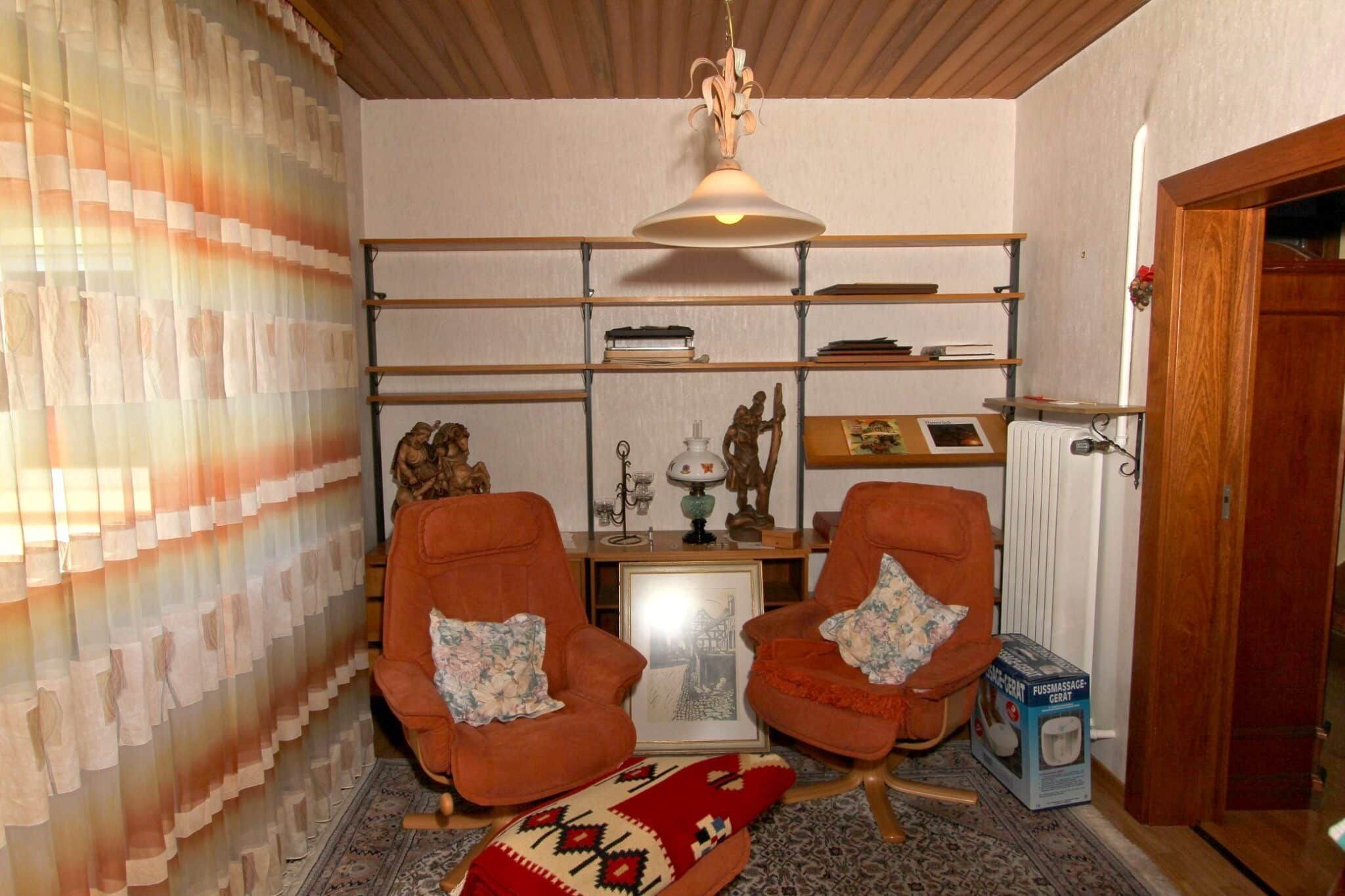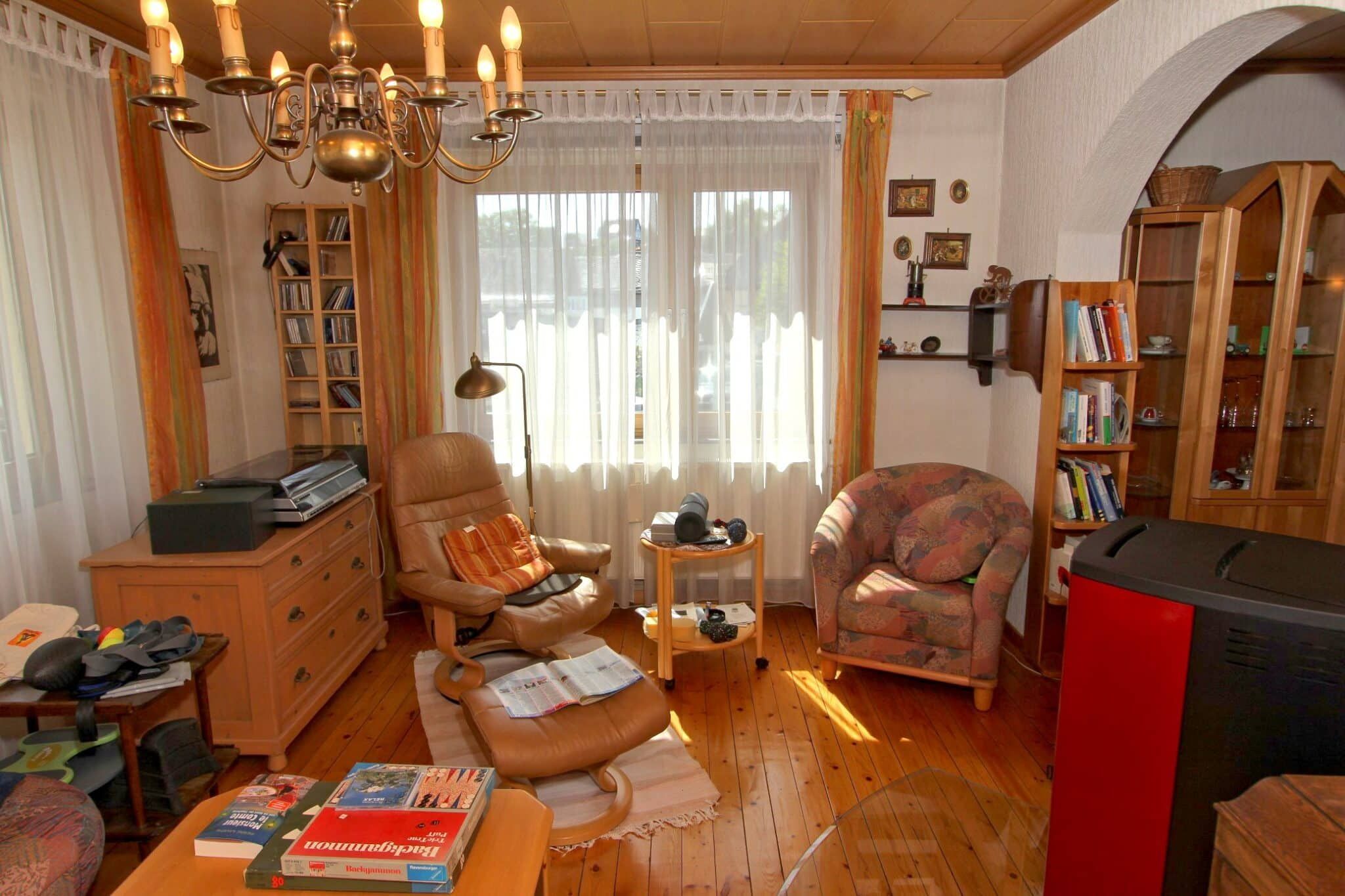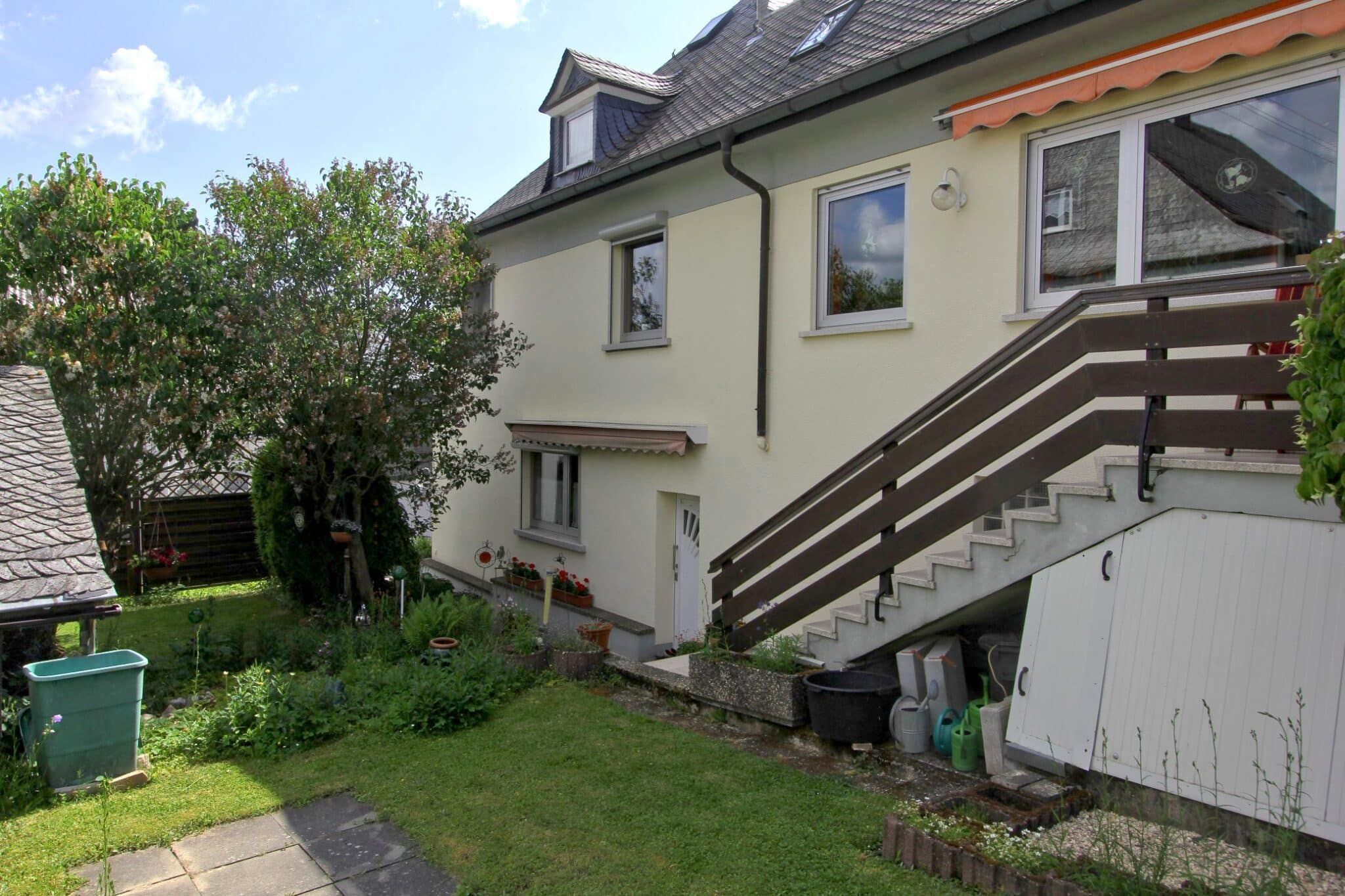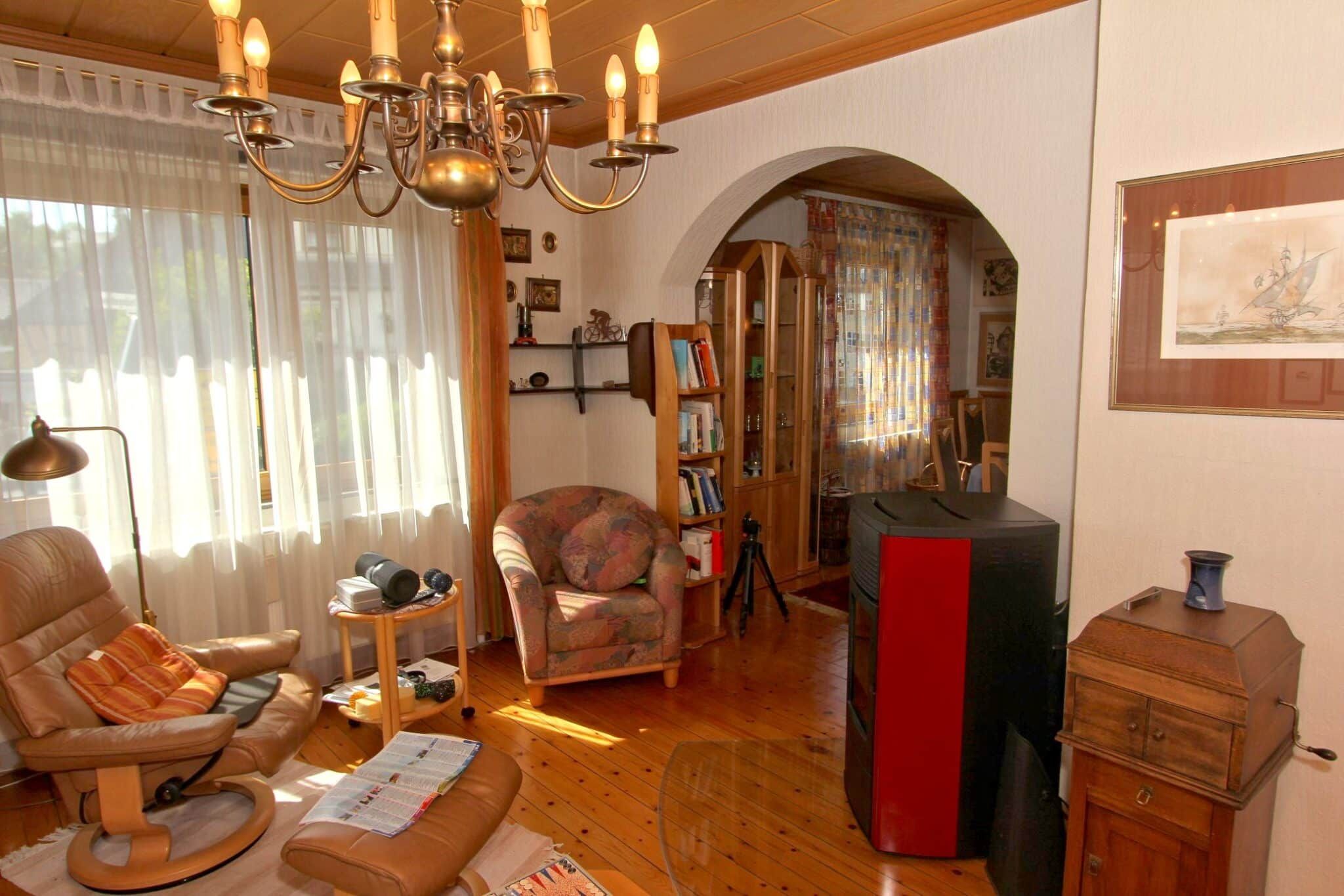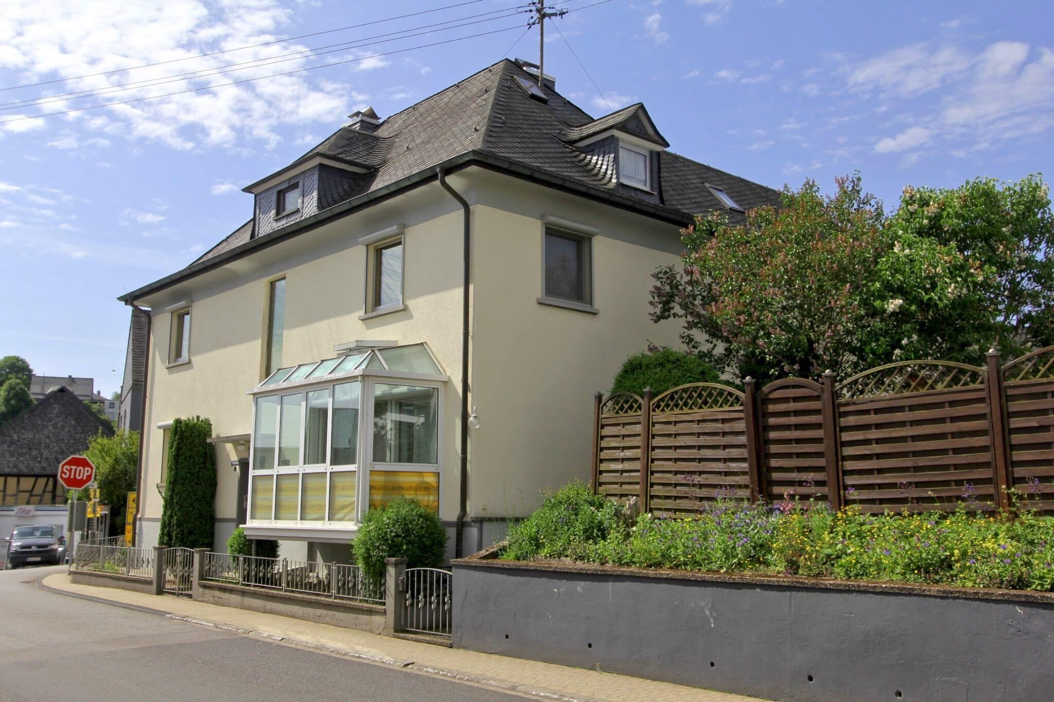 In der Schulstraße, zentral gelegen, wurde im Jahre 1936 dieses repräsentative Anwesen als Wohn- und Geschäftshaus erbaut. 1961 wurde die ehemalige Garage zu Wohnraum umgebaut und 1970 die Terrasse zu einem neuen Gebäudeteil mit Walmdach aufgestockt. Das Haus kann als Ganzes mit mehreren Generationen, als einzelne Wohnungen oder – wie ursprünglich – als Wohn- und Geschäftshaus genutzt werden. Durch das vorgelagerte Treppenhaus sind die Wohnbereiche in Erd- und Obergeschoss separiert und in sich abgeschlossen. Der Wohnbereich im Dachgeschoss ist durch den Flur der Obergeschosswohnung zu erreichen.