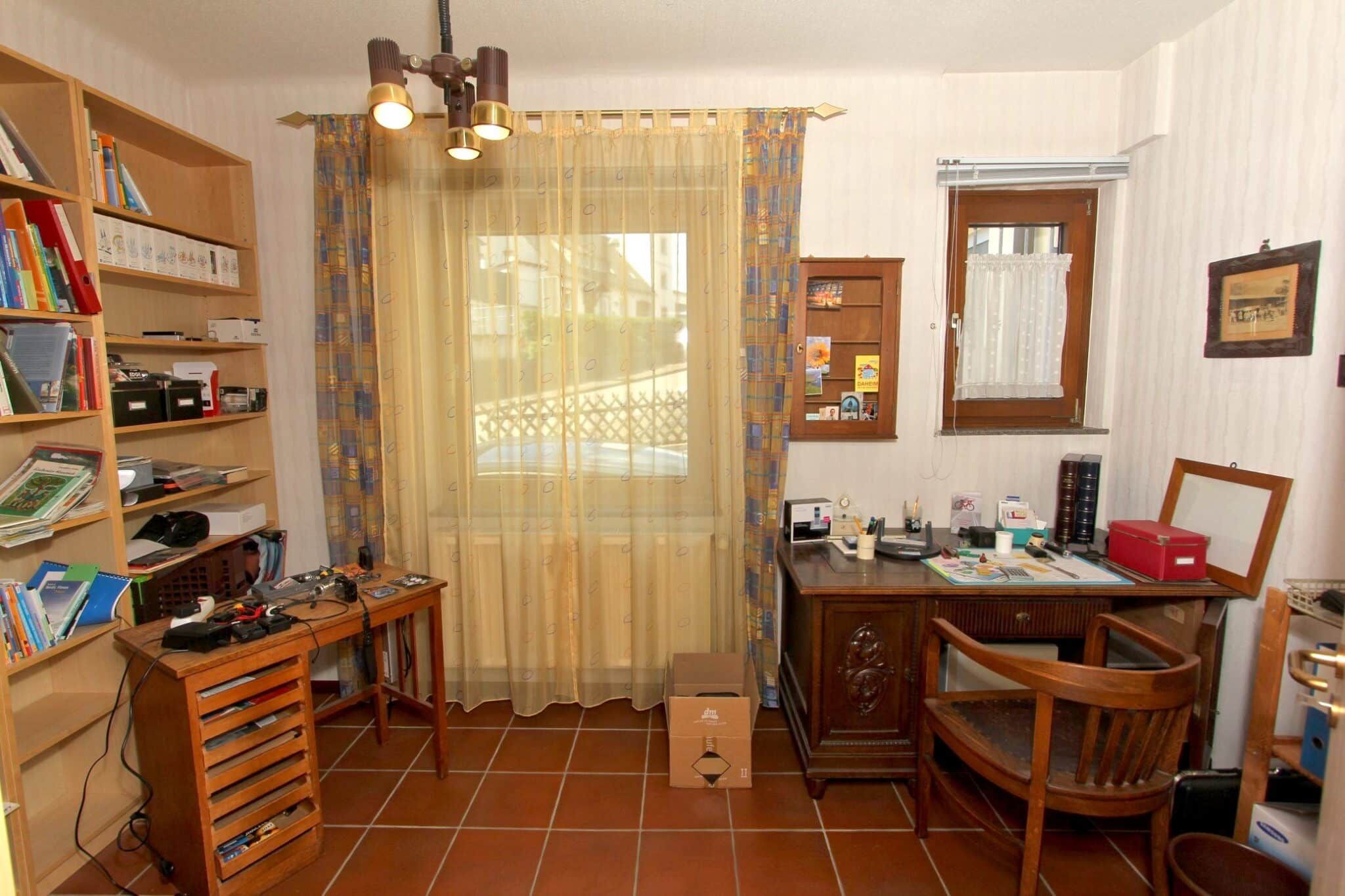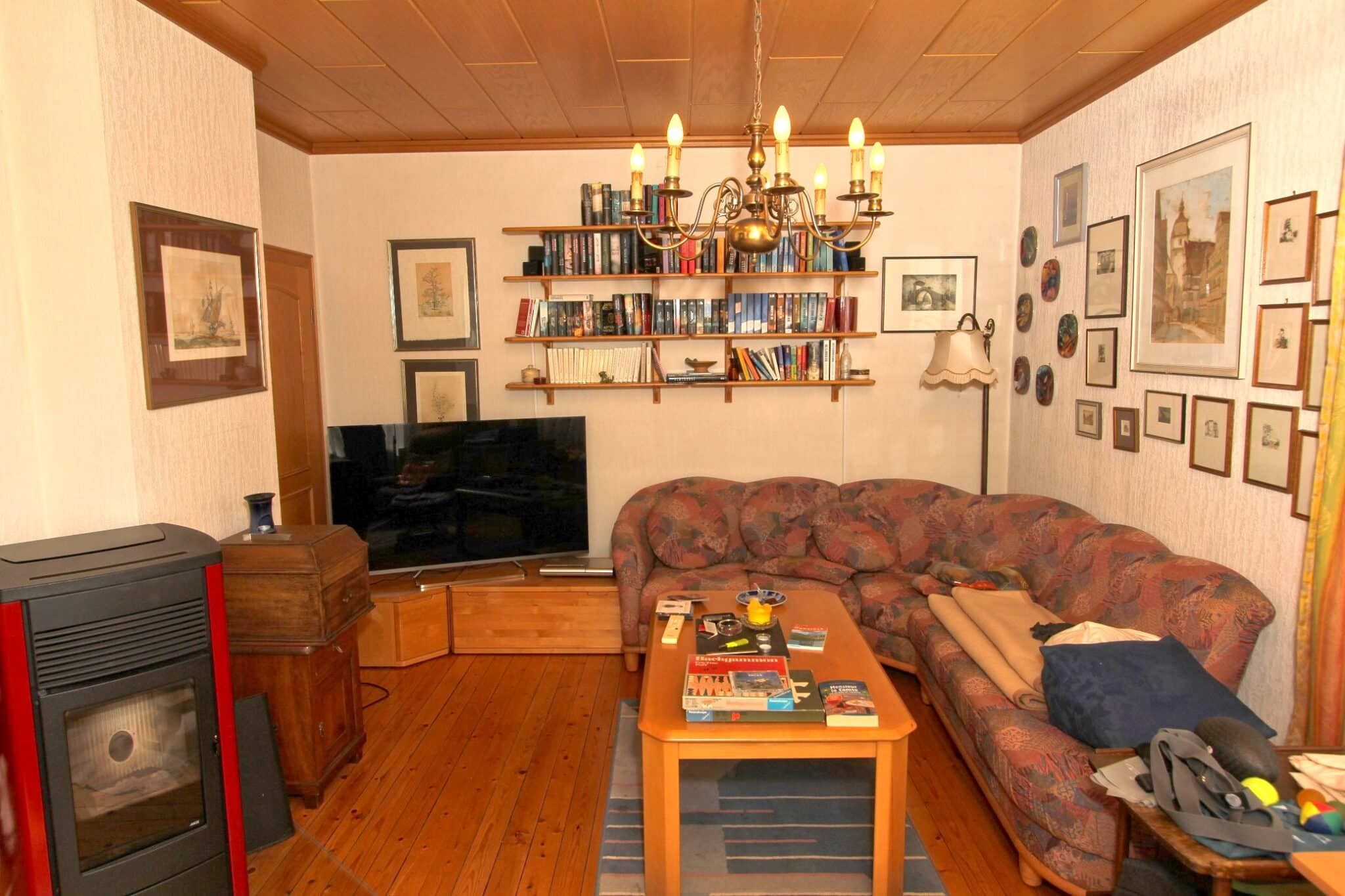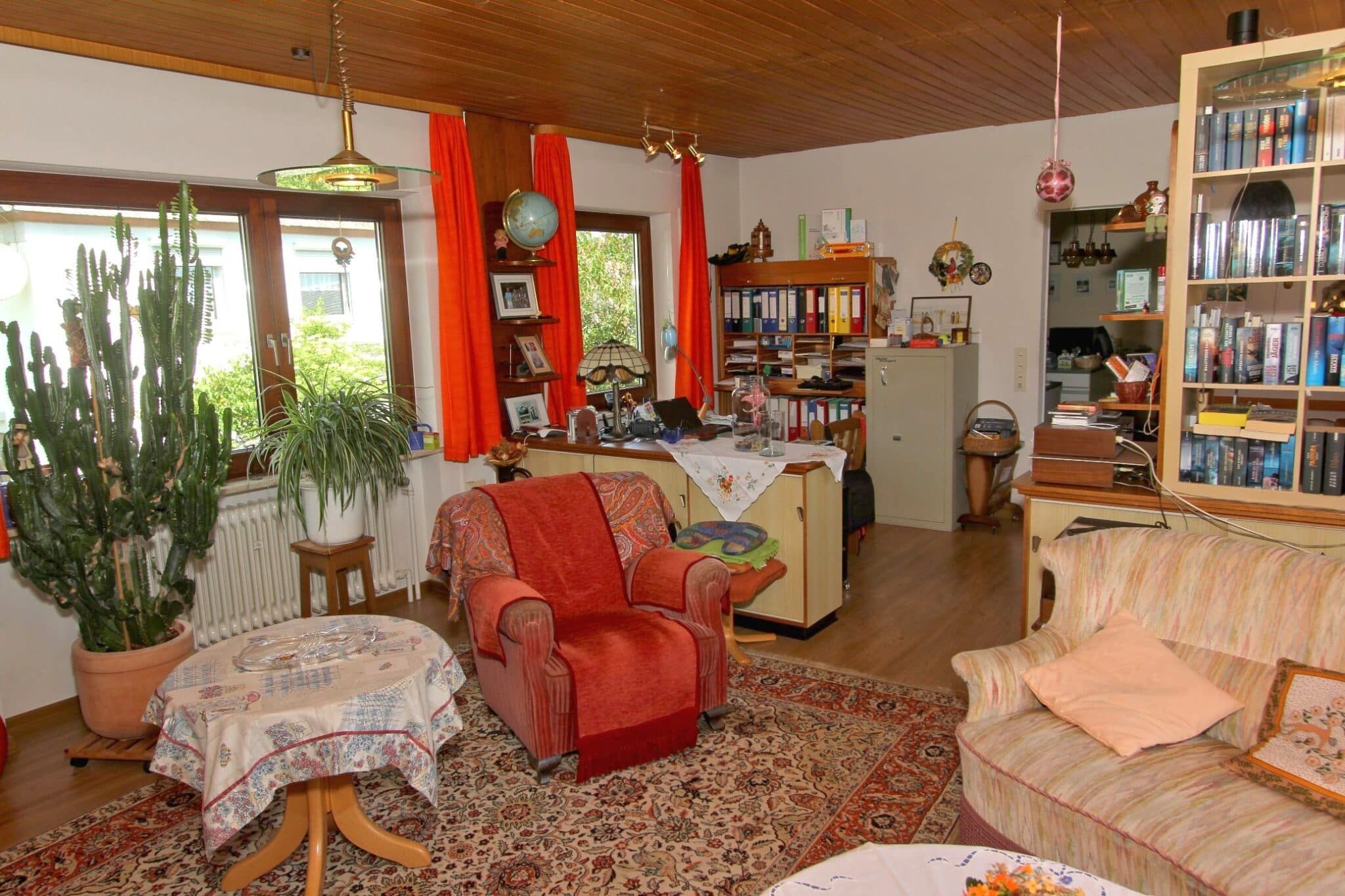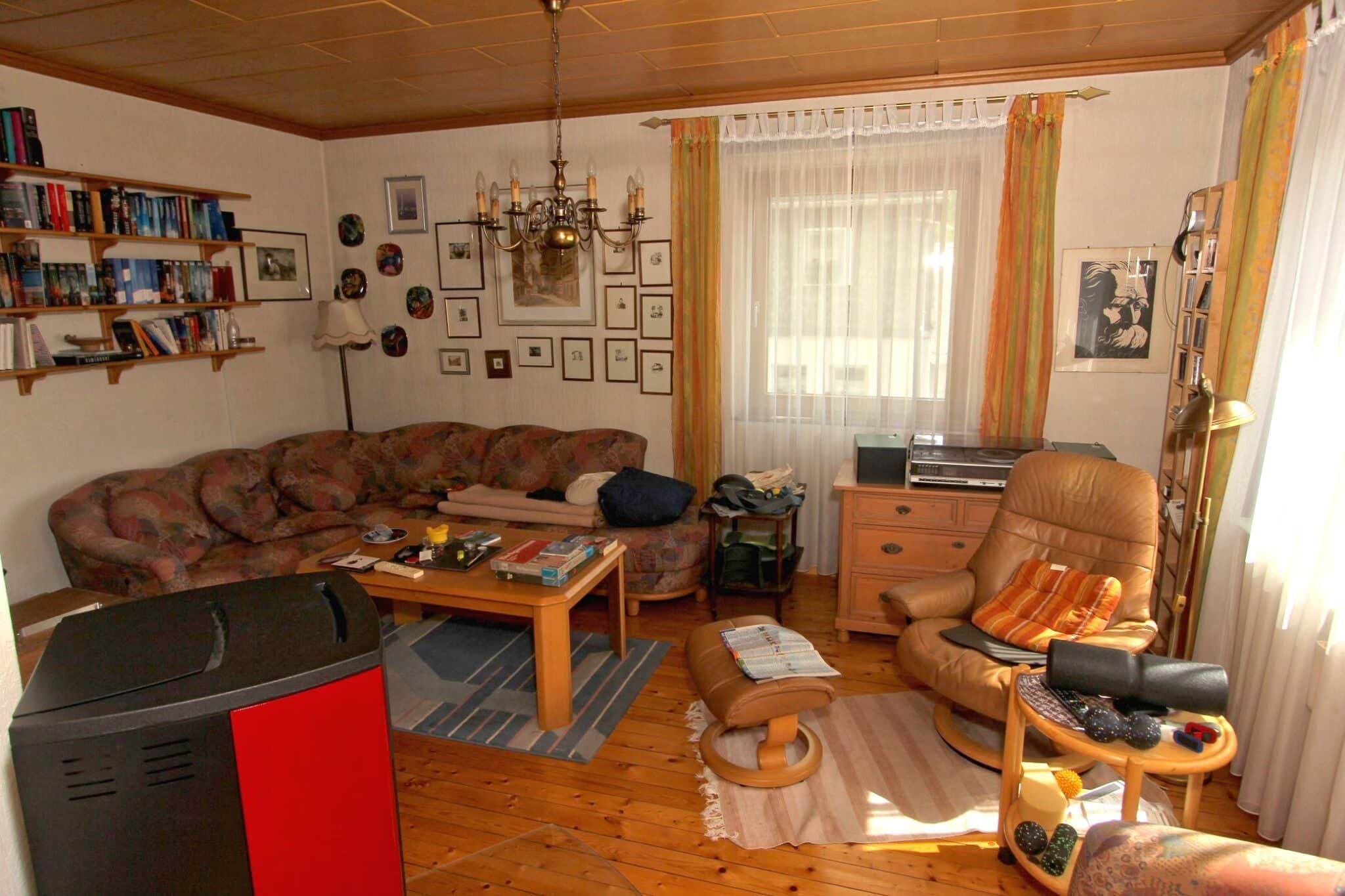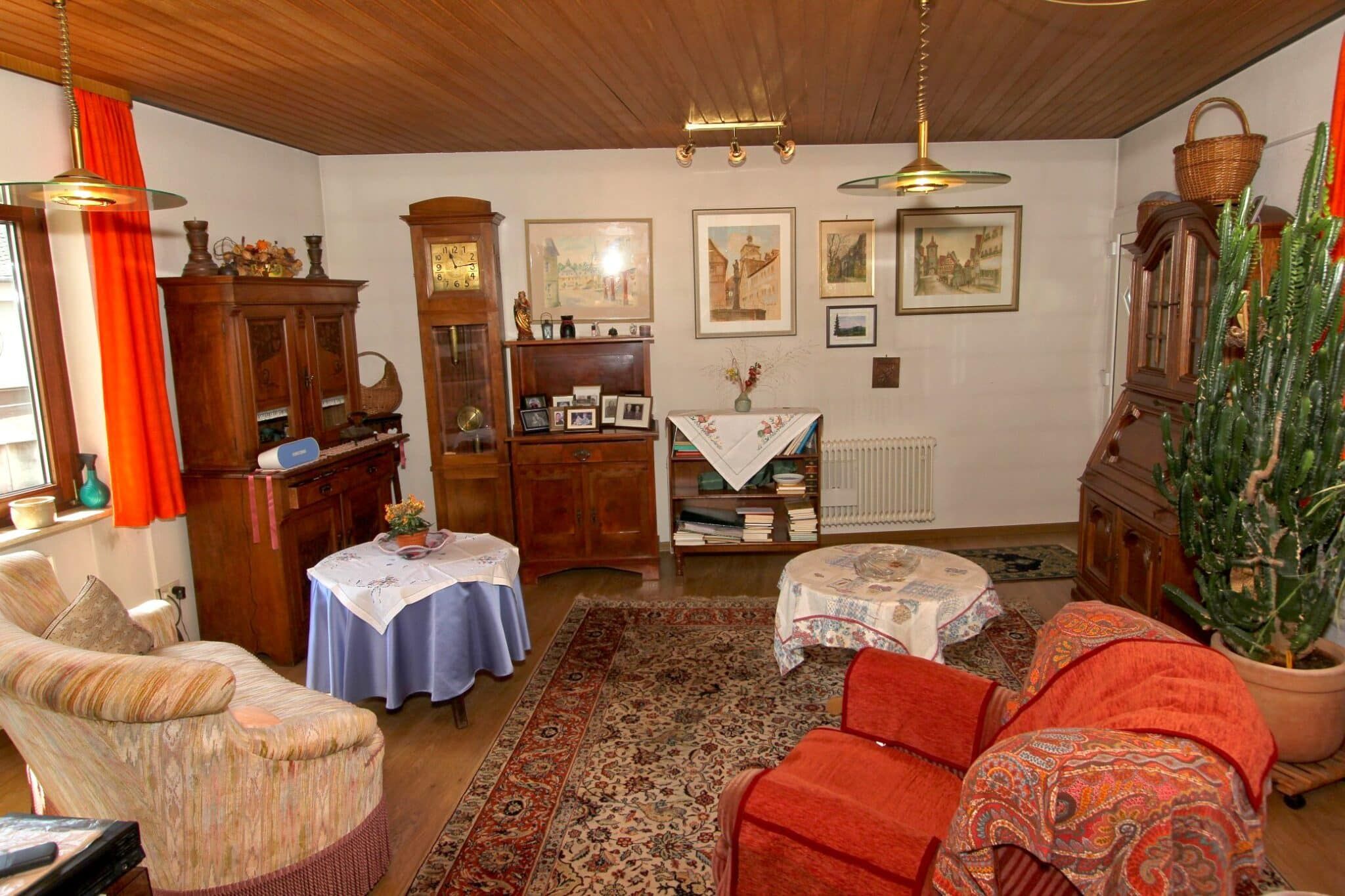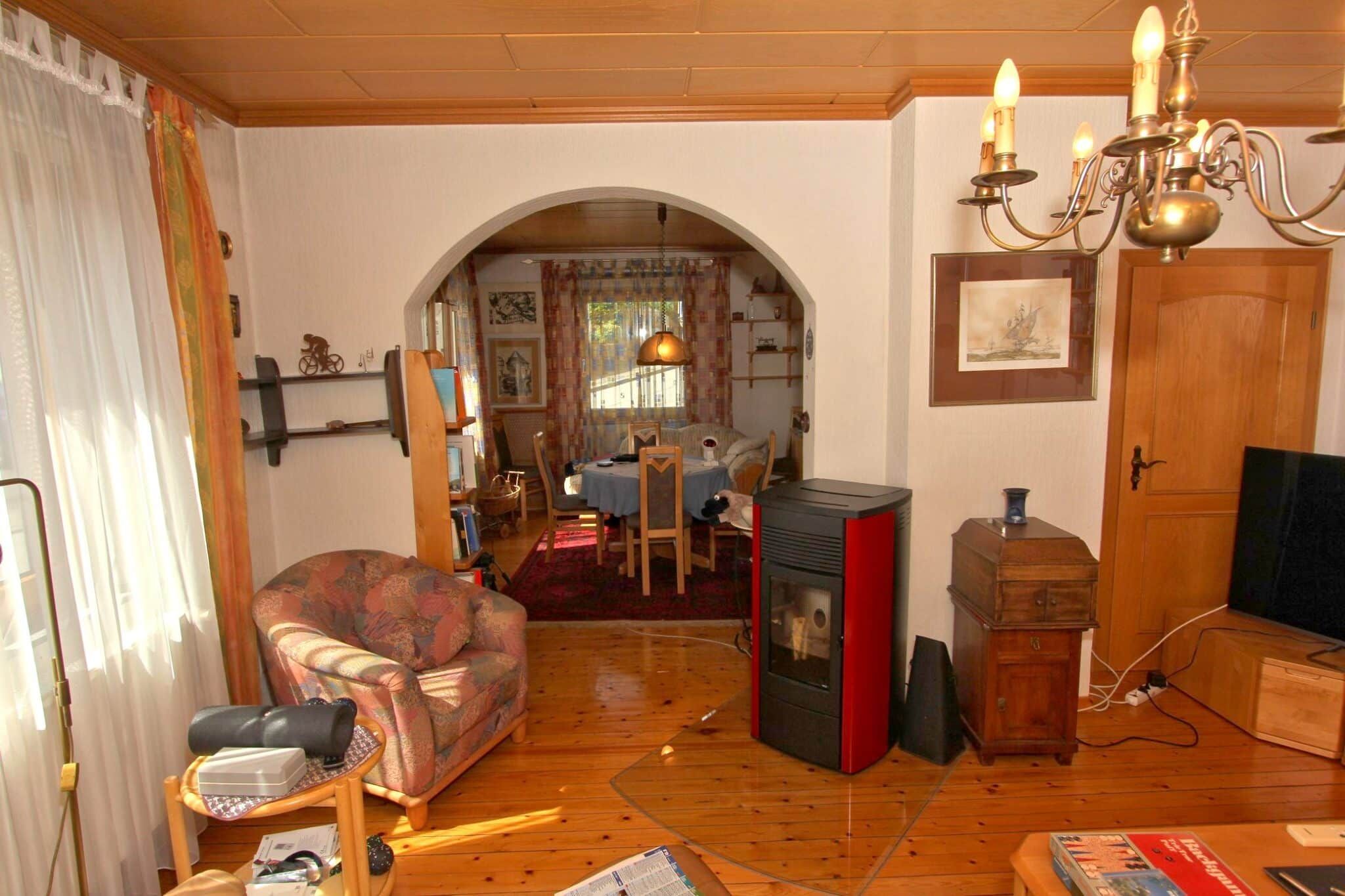 In der Schulstraße, zentral gelegen, wurde im Jahre 1936 dieses repräsentative Anwesen als Wohn- und Geschäftshaus erbaut. 1961 wurde die ehemalige Garage zu Wohnraum umgebaut und 1970 die Terrasse zu einem neuen Gebäudeteil mit Walmdach aufgestockt. Das Haus kann als Ganzes mit mehreren Generationen, als einzelne Wohnungen oder – wie ursprünglich – als Wohn- und Geschäftshaus genutzt werden. Durch das vorgelagerte Treppenhaus sind die Wohnbereiche in Erd- und Obergeschoss separiert und in sich abgeschlossen. Der Wohnbereich im Dachgeschoss ist durch den Flur der Obergeschosswohnung zu erreichen.
