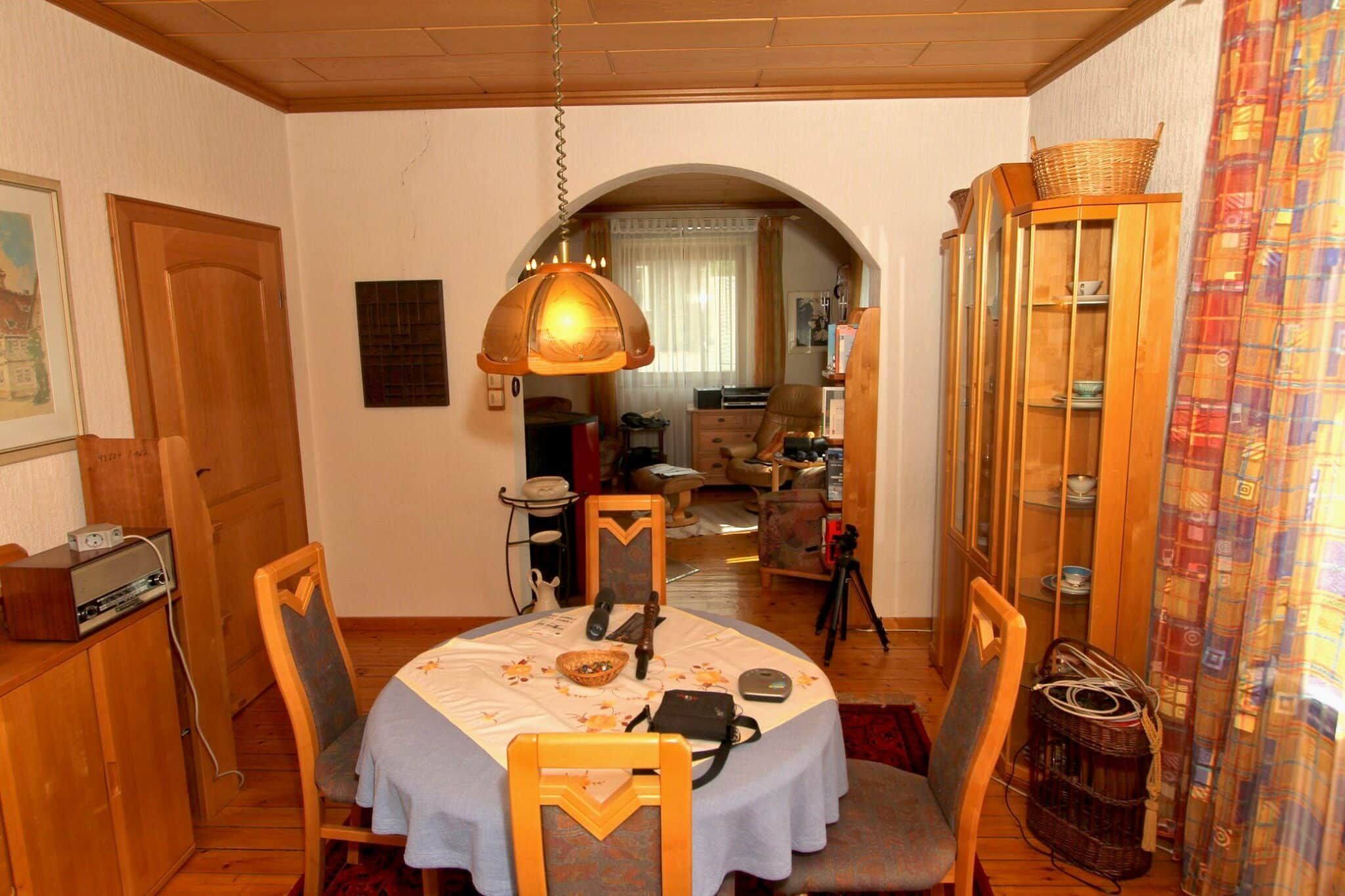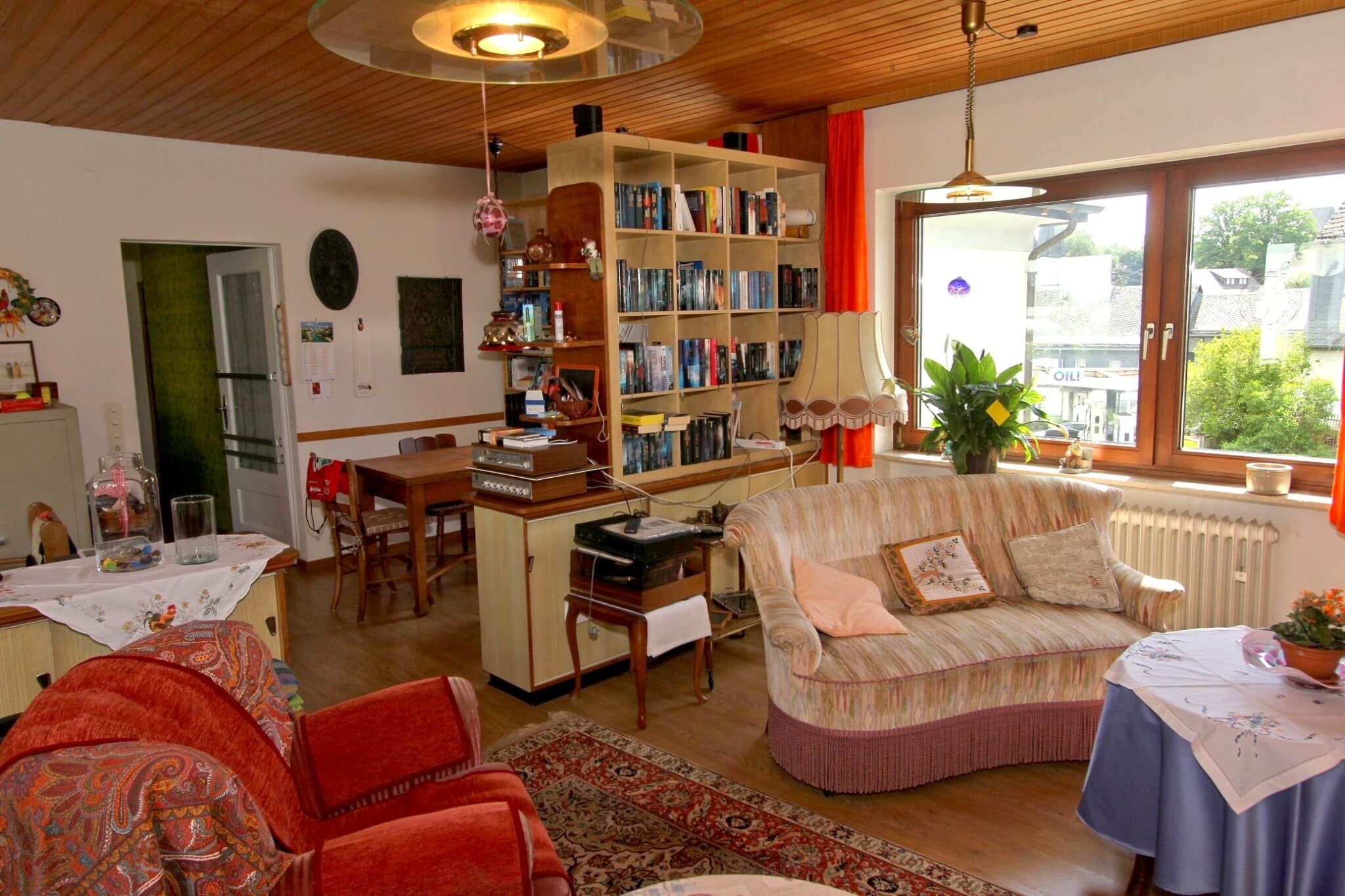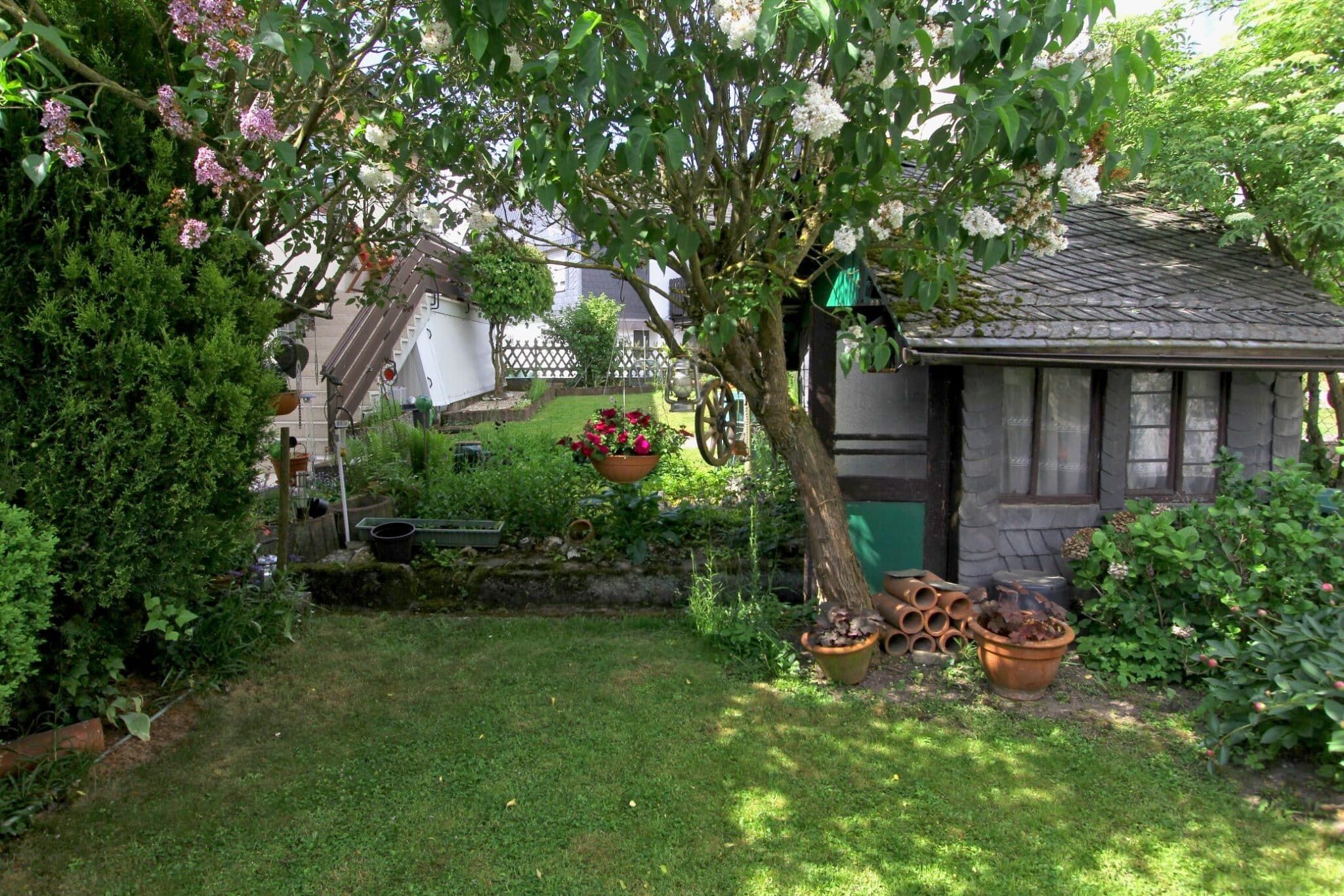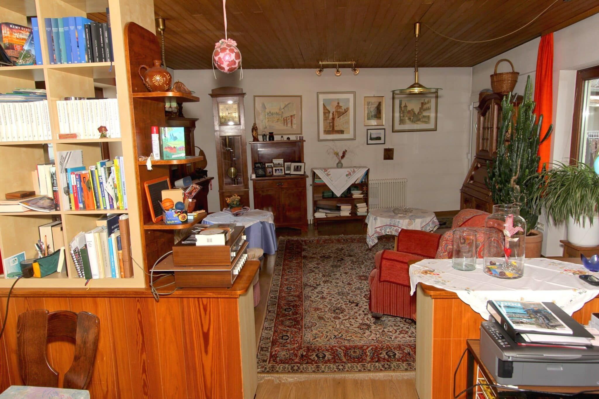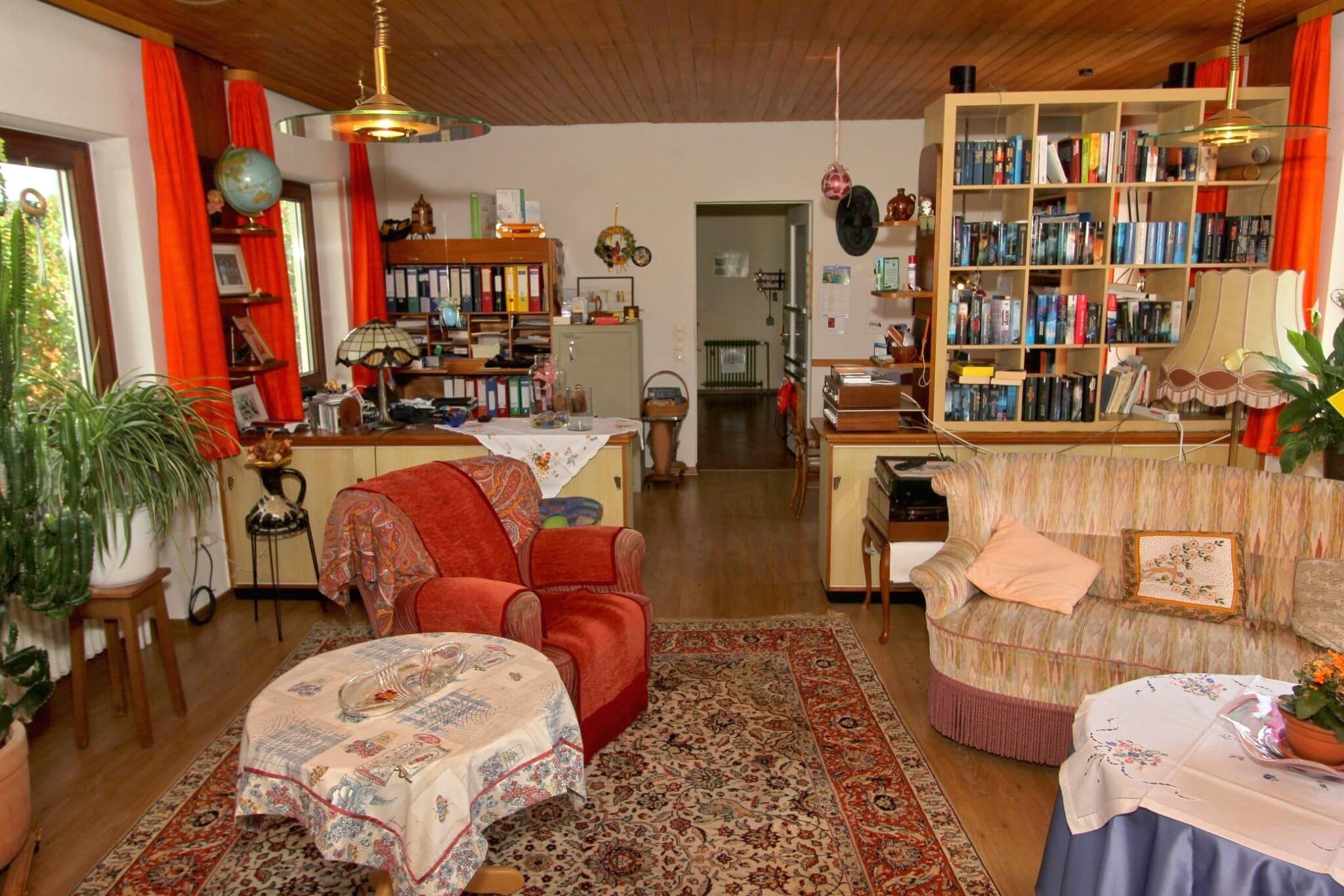 In der Schulstraße, zentral gelegen, wurde im Jahre 1936 dieses repräsentative Anwesen als Wohn- und Geschäftshaus erbaut. 1961 wurde die ehemalige Garage zu Wohnraum umgebaut und 1970 die Terrasse zu einem neuen Gebäudeteil mit Walmdach aufgestockt. Das Haus kann als Ganzes mit mehreren Generationen, als einzelne Wohnungen oder – wie ursprünglich – als Wohn- und Geschäftshaus genutzt werden. Durch das vorgelagerte Treppenhaus sind die Wohnbereiche in Erd- und Obergeschoss separiert und in sich abgeschlossen. Der Wohnbereich im Dachgeschoss ist durch den Flur der Obergeschosswohnung zu erreichen.