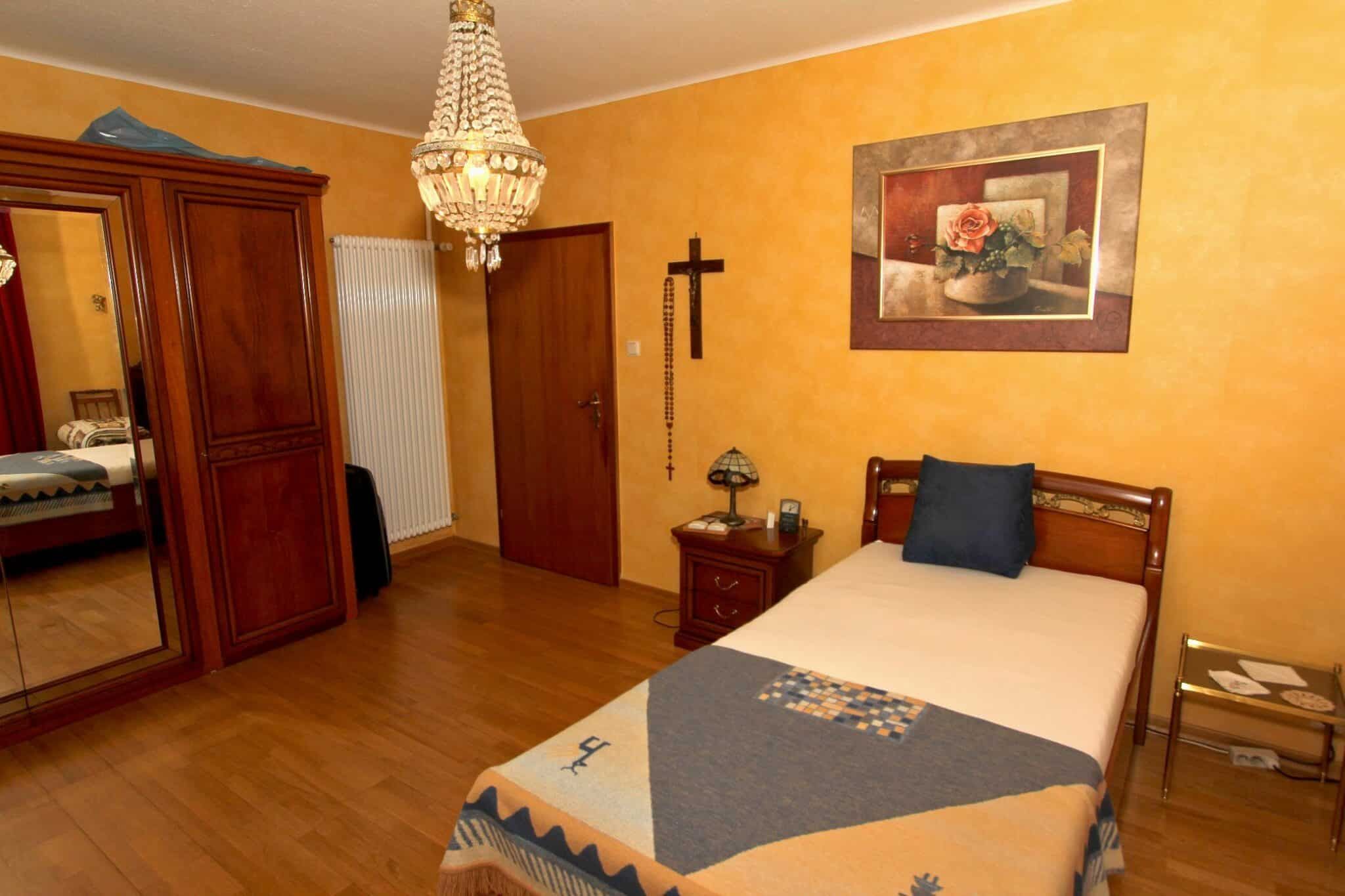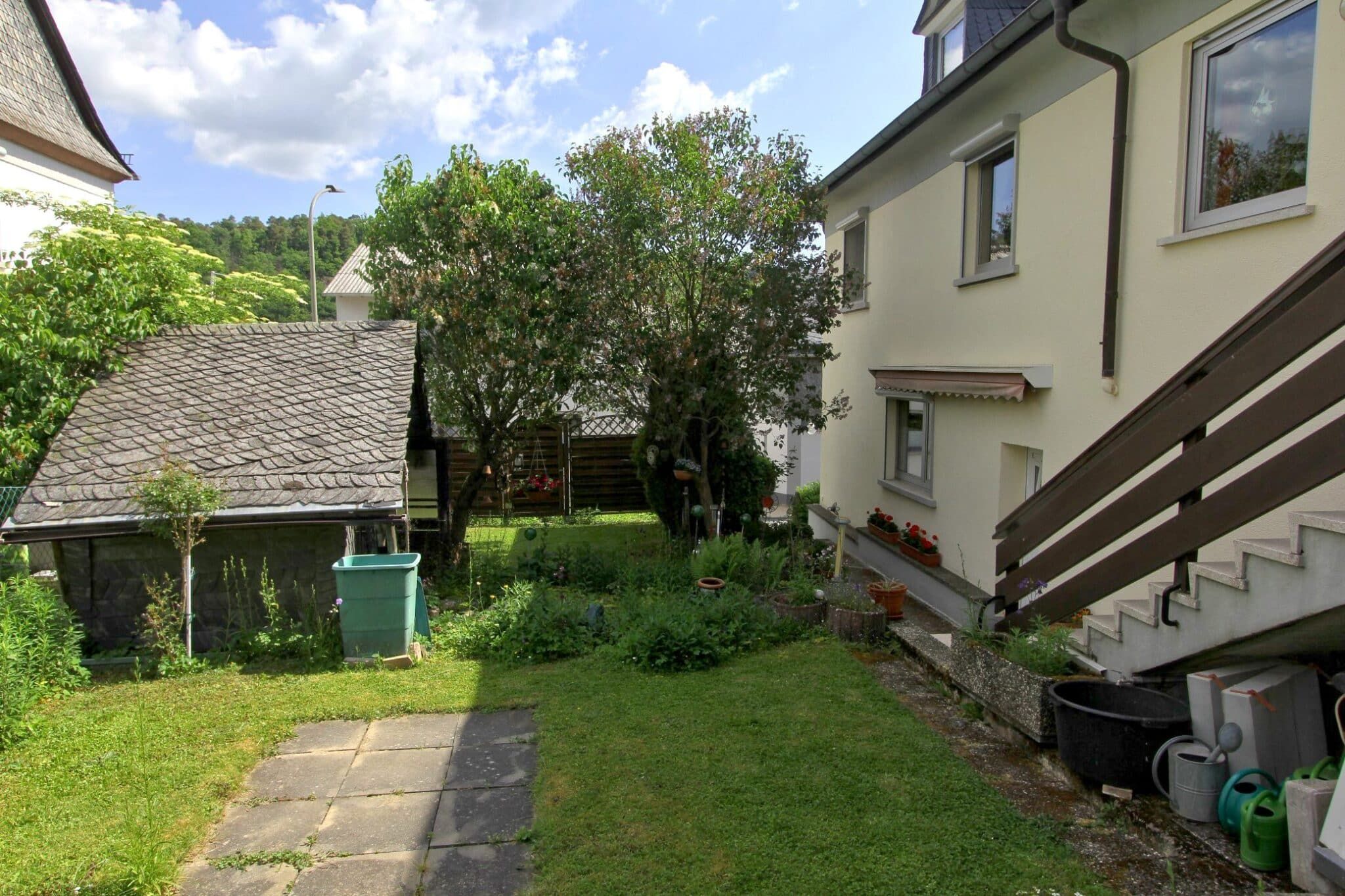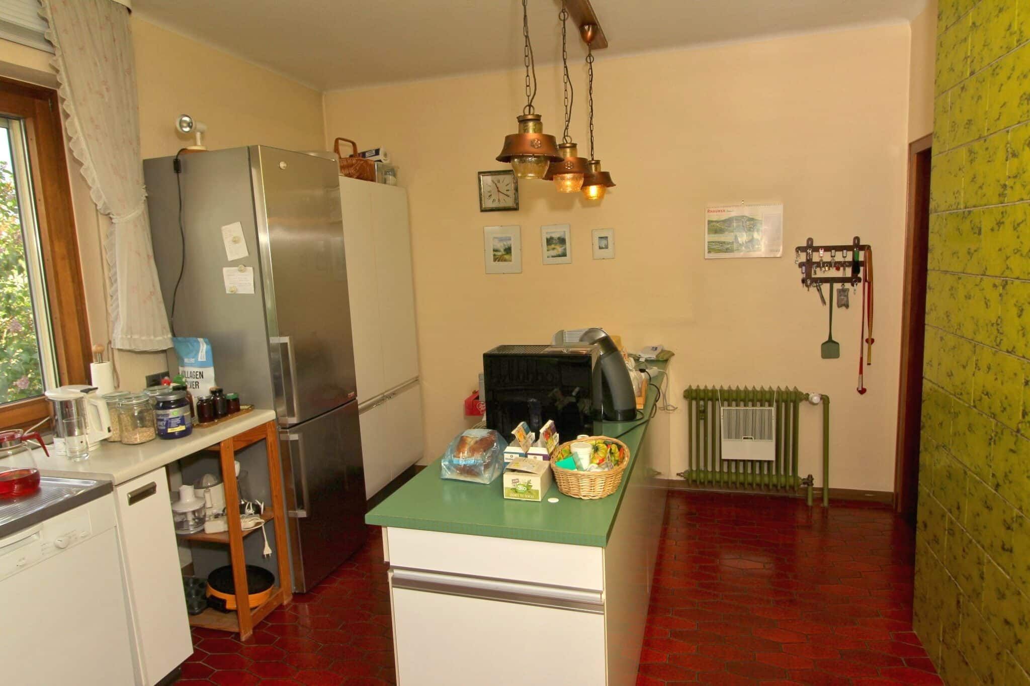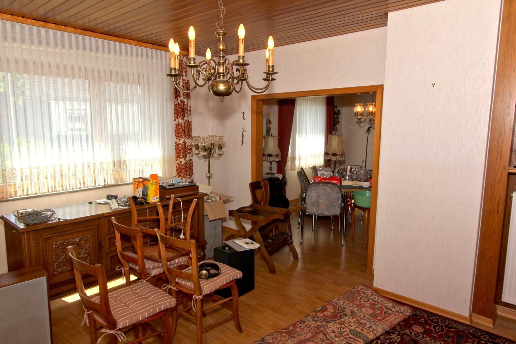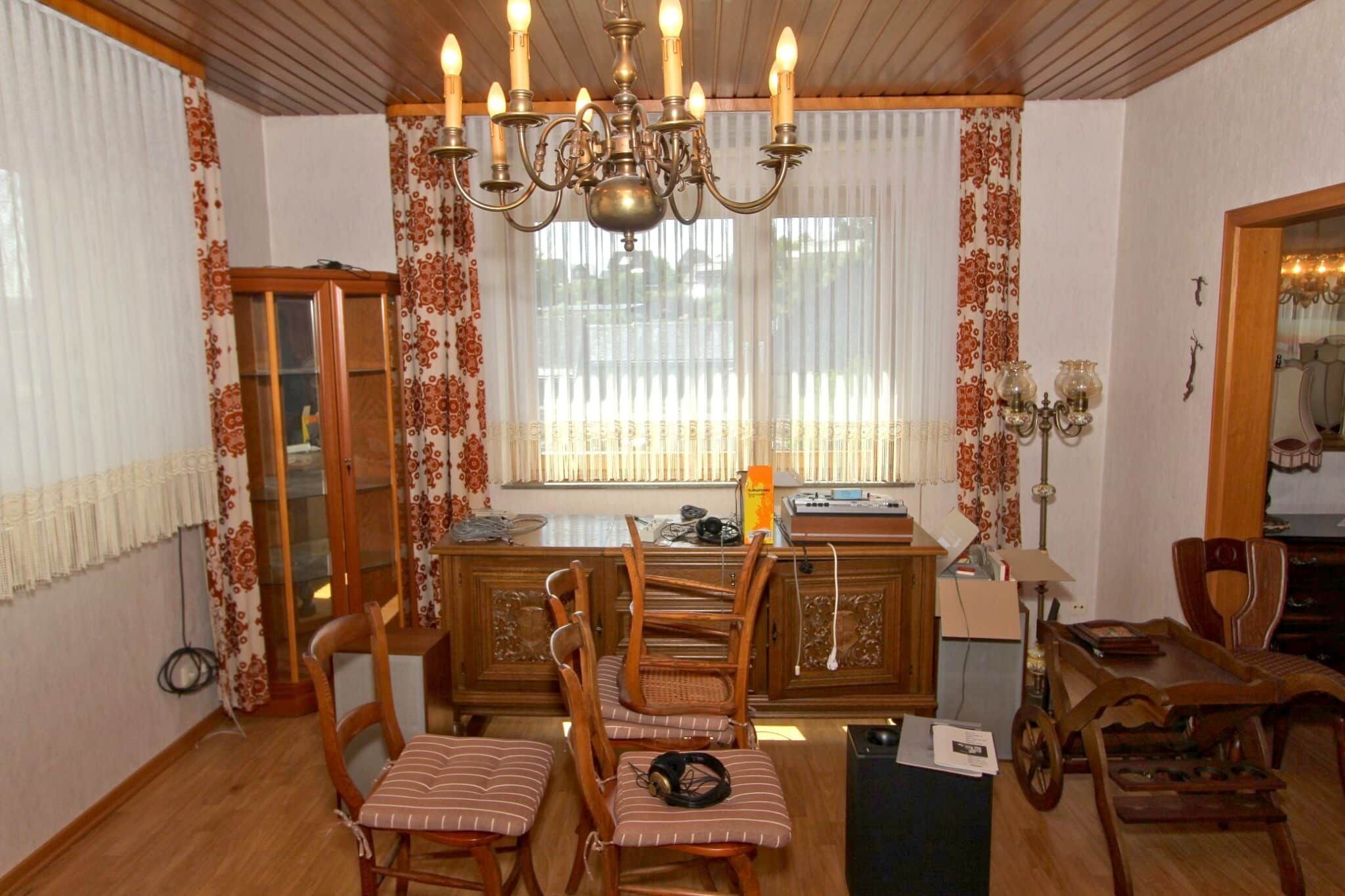 In der Schulstraße, zentral gelegen, wurde im Jahre 1936 dieses repräsentative Anwesen als Wohn- und Geschäftshaus erbaut. 1961 wurde die ehemalige Garage zu Wohnraum umgebaut und 1970 die Terrasse zu einem neuen Gebäudeteil mit Walmdach aufgestockt. Das Haus kann als Ganzes mit mehreren Generationen, als einzelne Wohnungen oder – wie ursprünglich – als Wohn- und Geschäftshaus genutzt werden. Durch das vorgelagerte Treppenhaus sind die Wohnbereiche in Erd- und Obergeschoss separiert und in sich abgeschlossen. Der Wohnbereich im Dachgeschoss ist durch den Flur der Obergeschosswohnung zu erreichen.