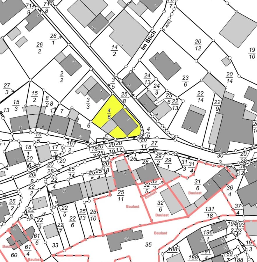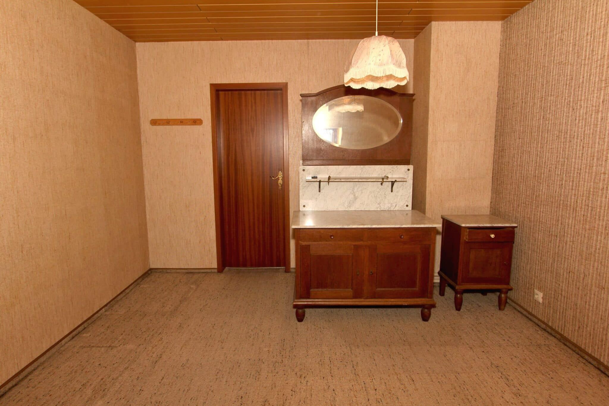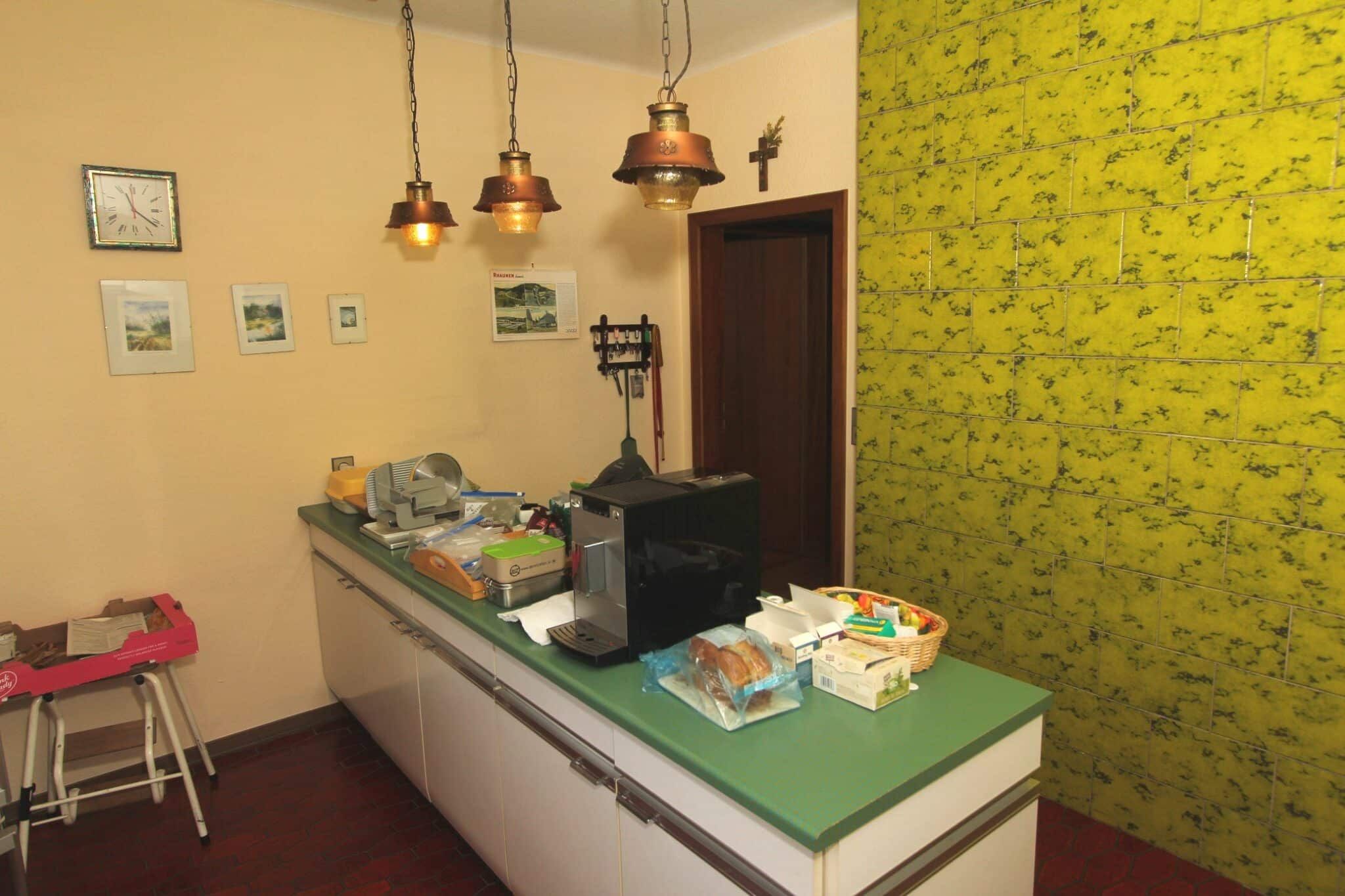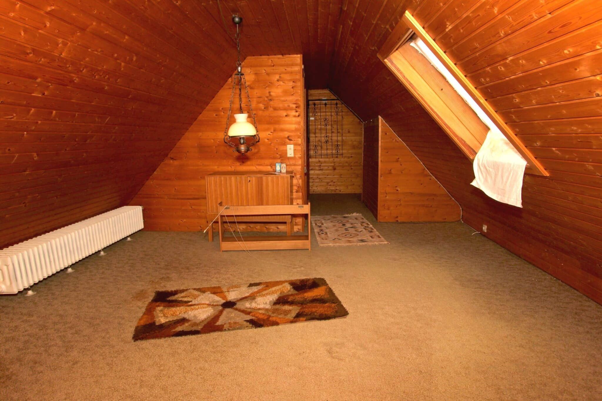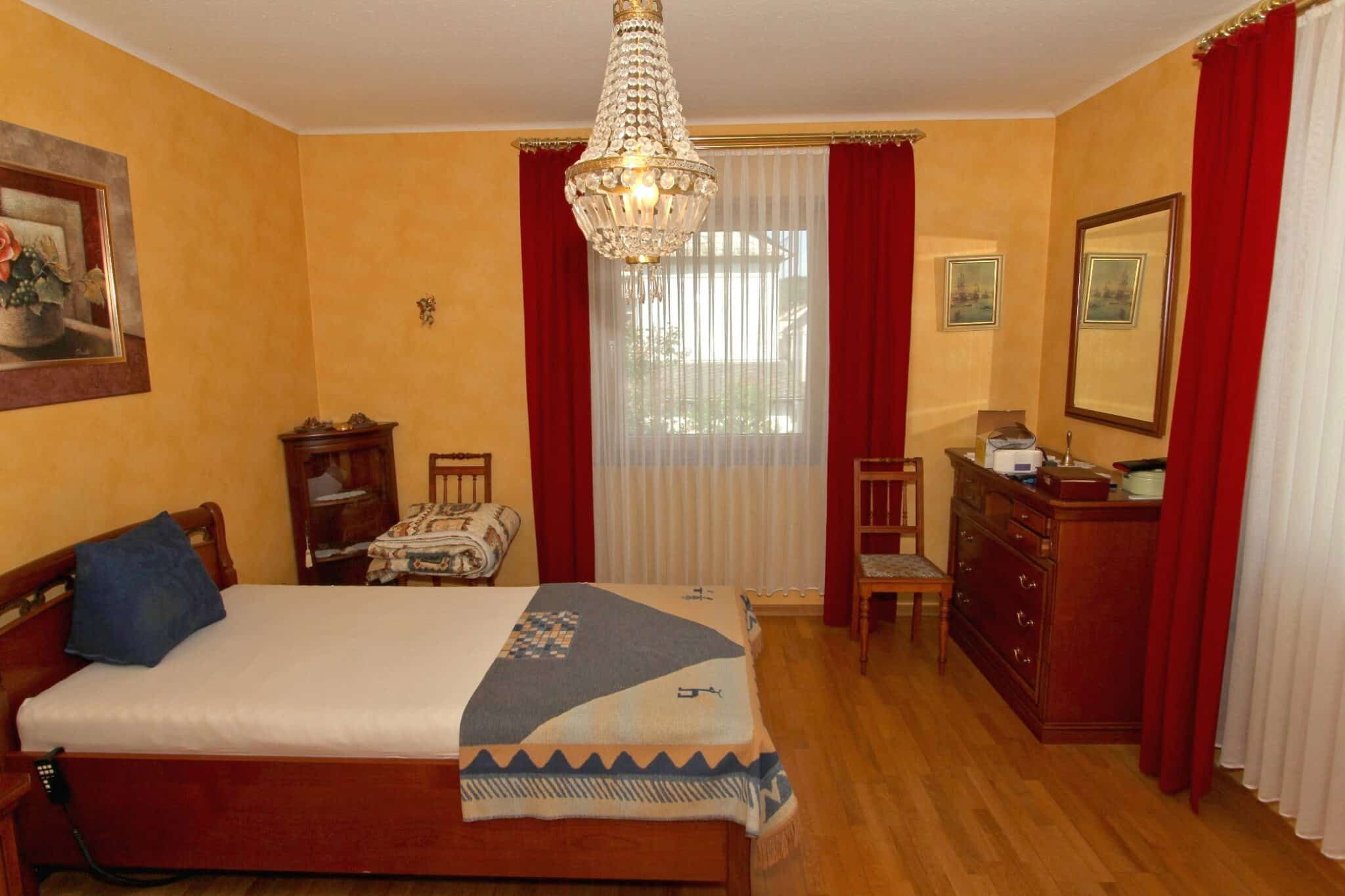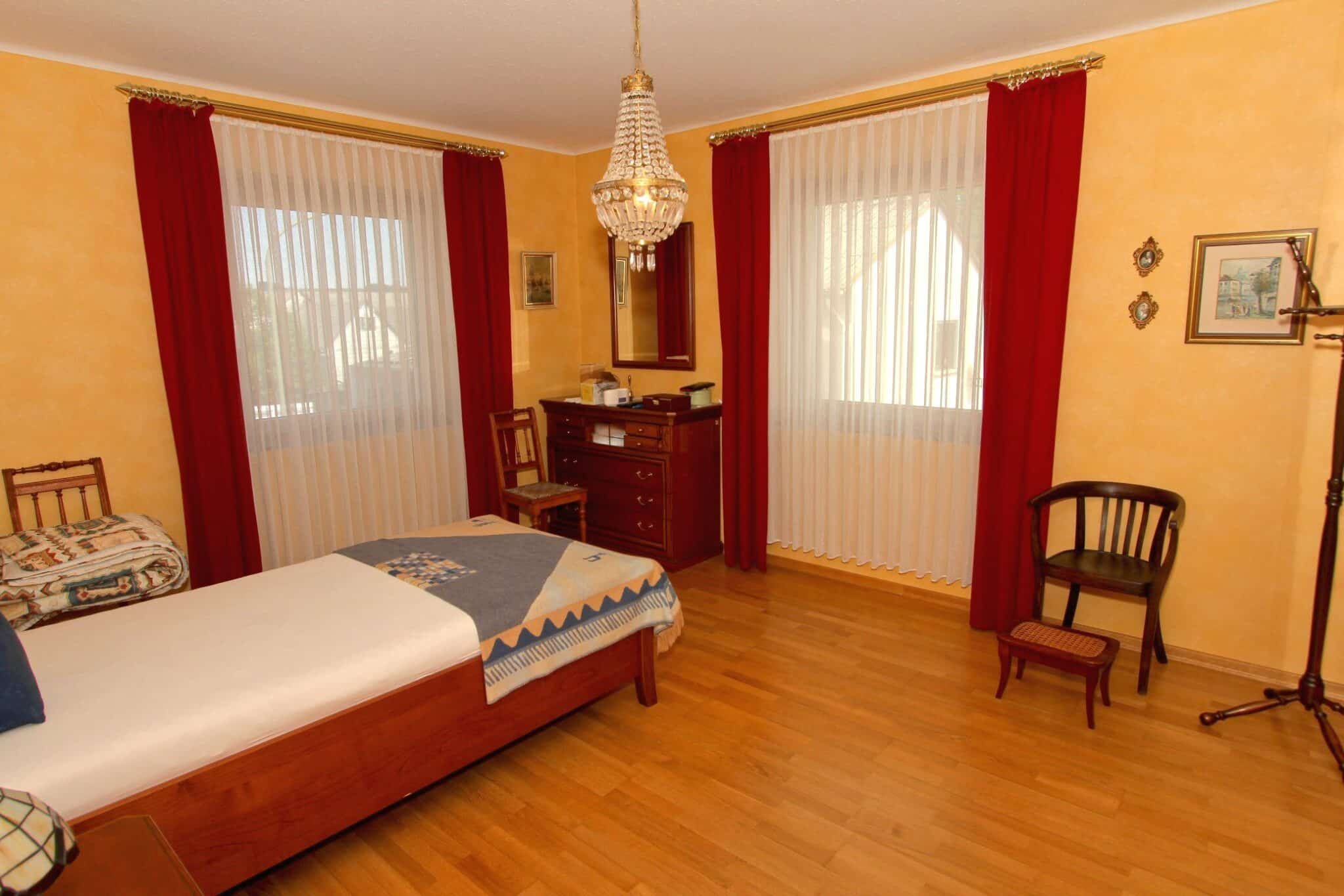 In der Schulstraße, zentral gelegen, wurde im Jahre 1936 dieses repräsentative Anwesen als Wohn- und Geschäftshaus erbaut. 1961 wurde die ehemalige Garage zu Wohnraum umgebaut und 1970 die Terrasse zu einem neuen Gebäudeteil mit Walmdach aufgestockt. Das Haus kann als Ganzes mit mehreren Generationen, als einzelne Wohnungen oder – wie ursprünglich – als Wohn- und Geschäftshaus genutzt werden. Durch das vorgelagerte Treppenhaus sind die Wohnbereiche in Erd- und Obergeschoss separiert und in sich abgeschlossen. Der Wohnbereich im Dachgeschoss ist durch den Flur der Obergeschosswohnung zu erreichen.