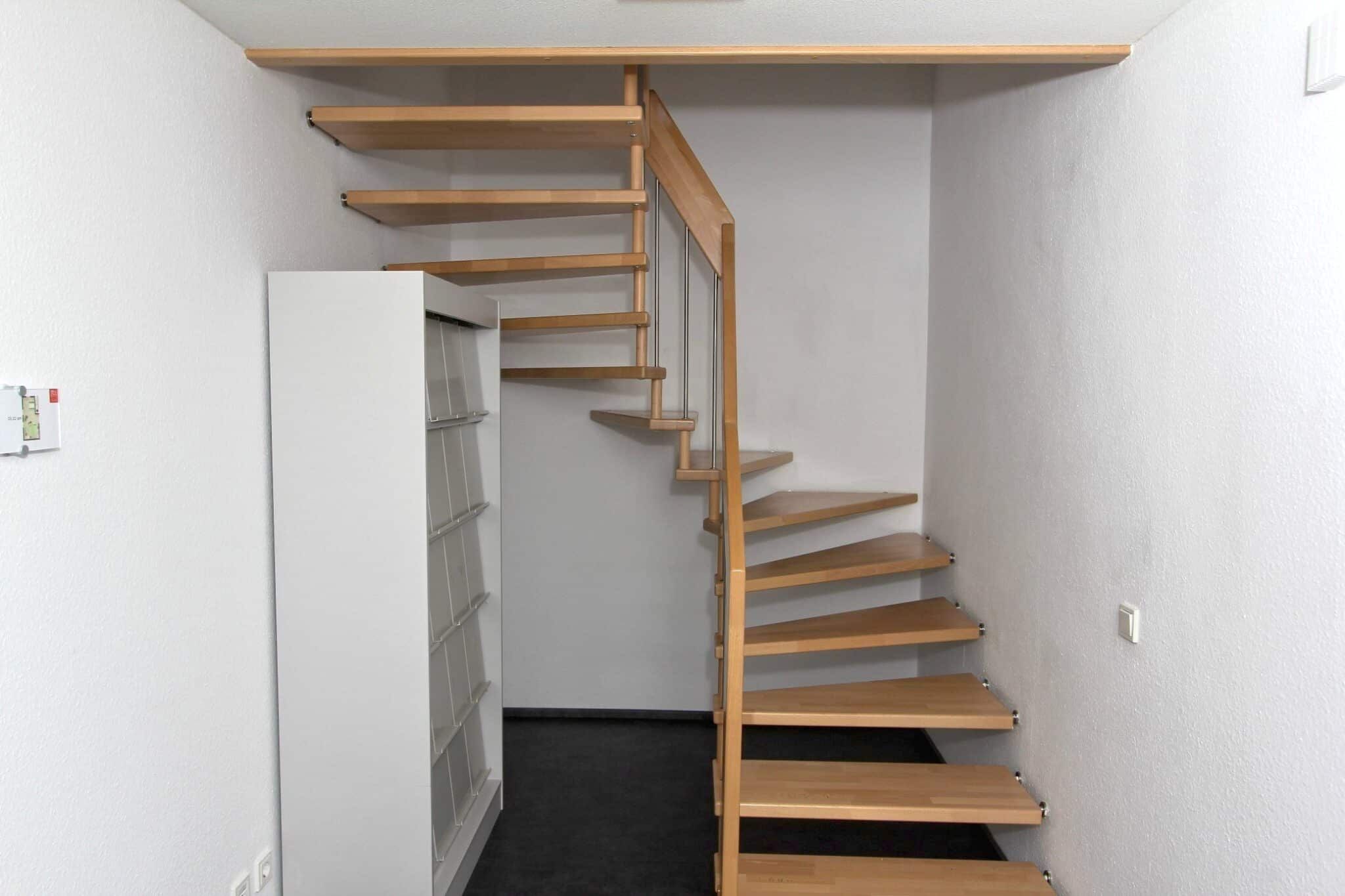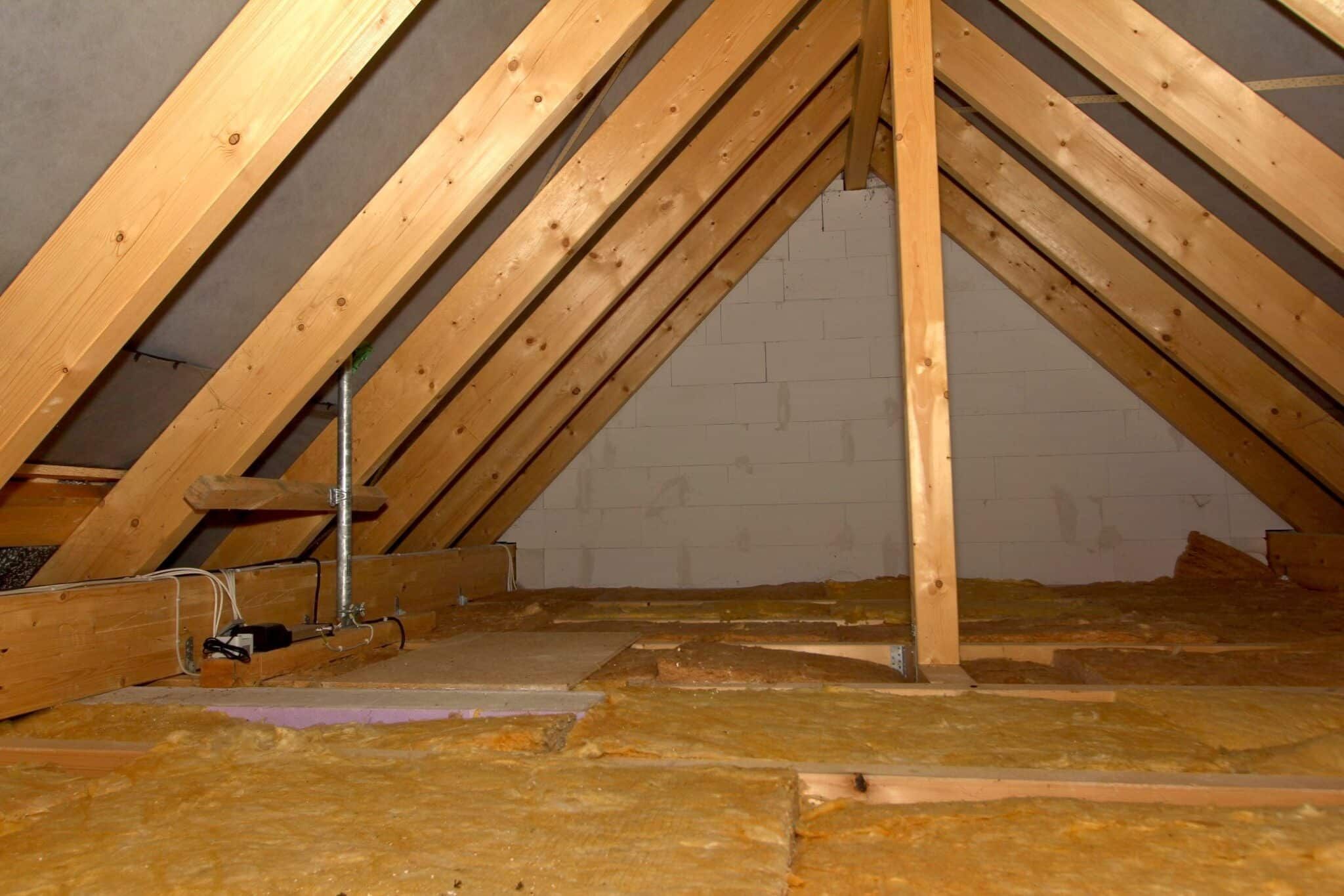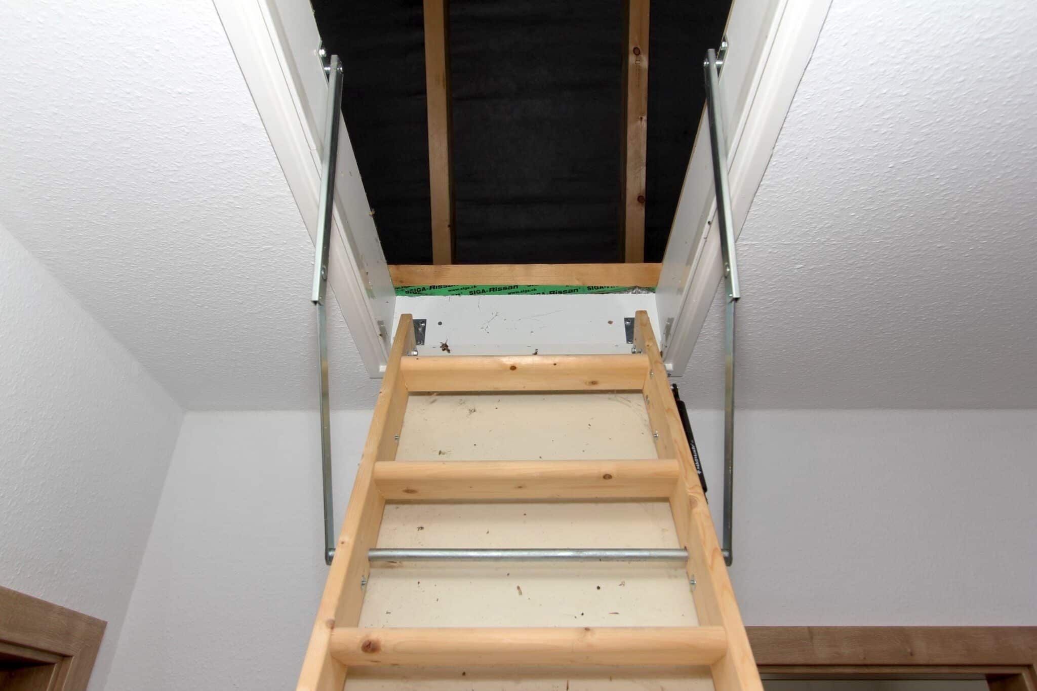 Mittels Bodeneinschubtreppe gelangt man zum Dachboden. Die oberste Geschossdecke ist mit Mineralwolle gedämmt.