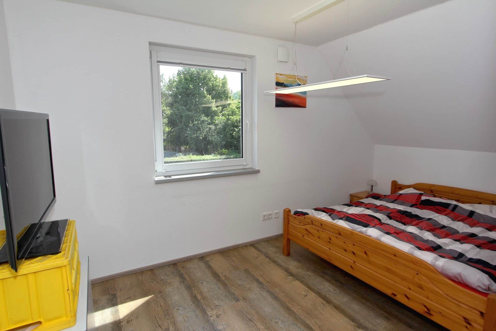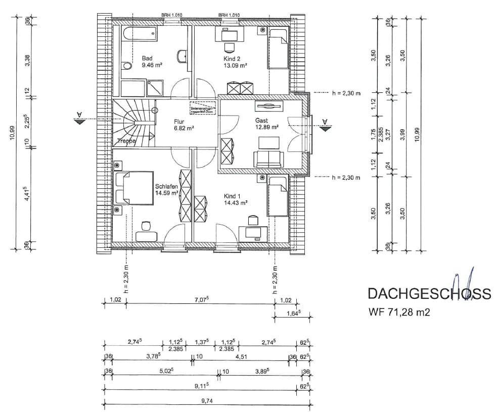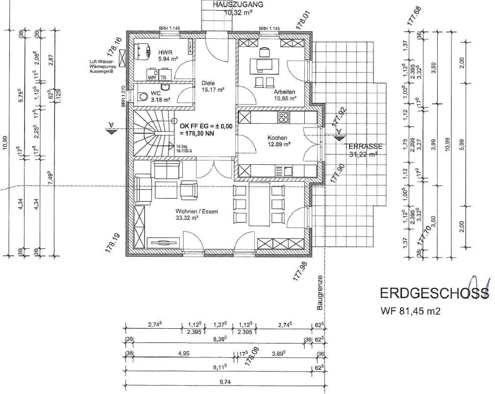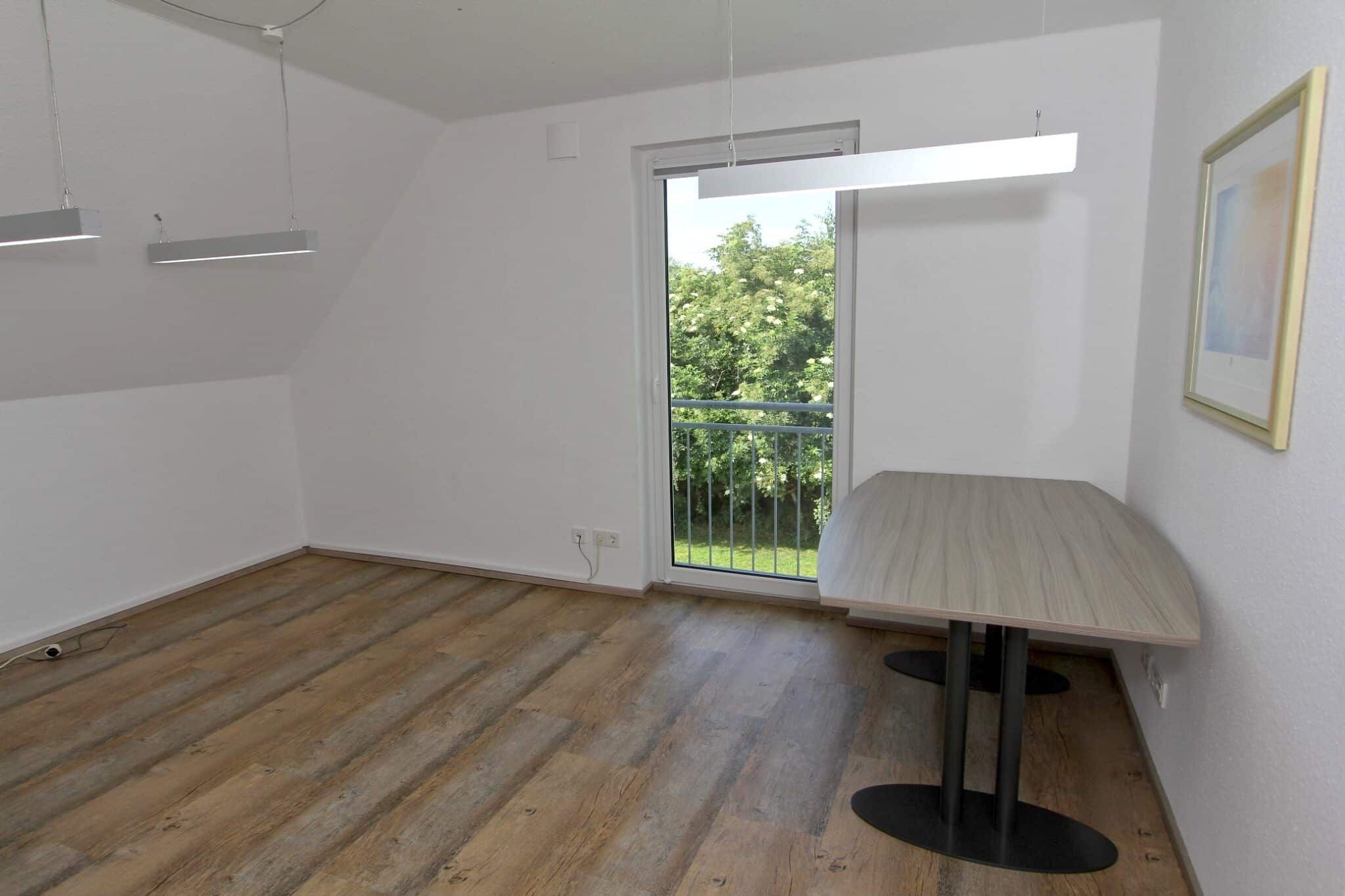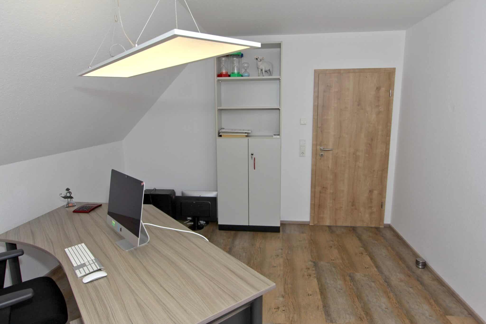Im Erdgeschoss befinden sich Küche, Wohn-/Esszimmer mit Terrassenausgang, Büro, Hauswirtschaftsraum und Gäste-WC. Vom Dielenbereich führt eine elegante Holztreppe zum Dachgeschoss. Dort befinden 4 Zimmer und Bad (Wanne, Dusche, WC).