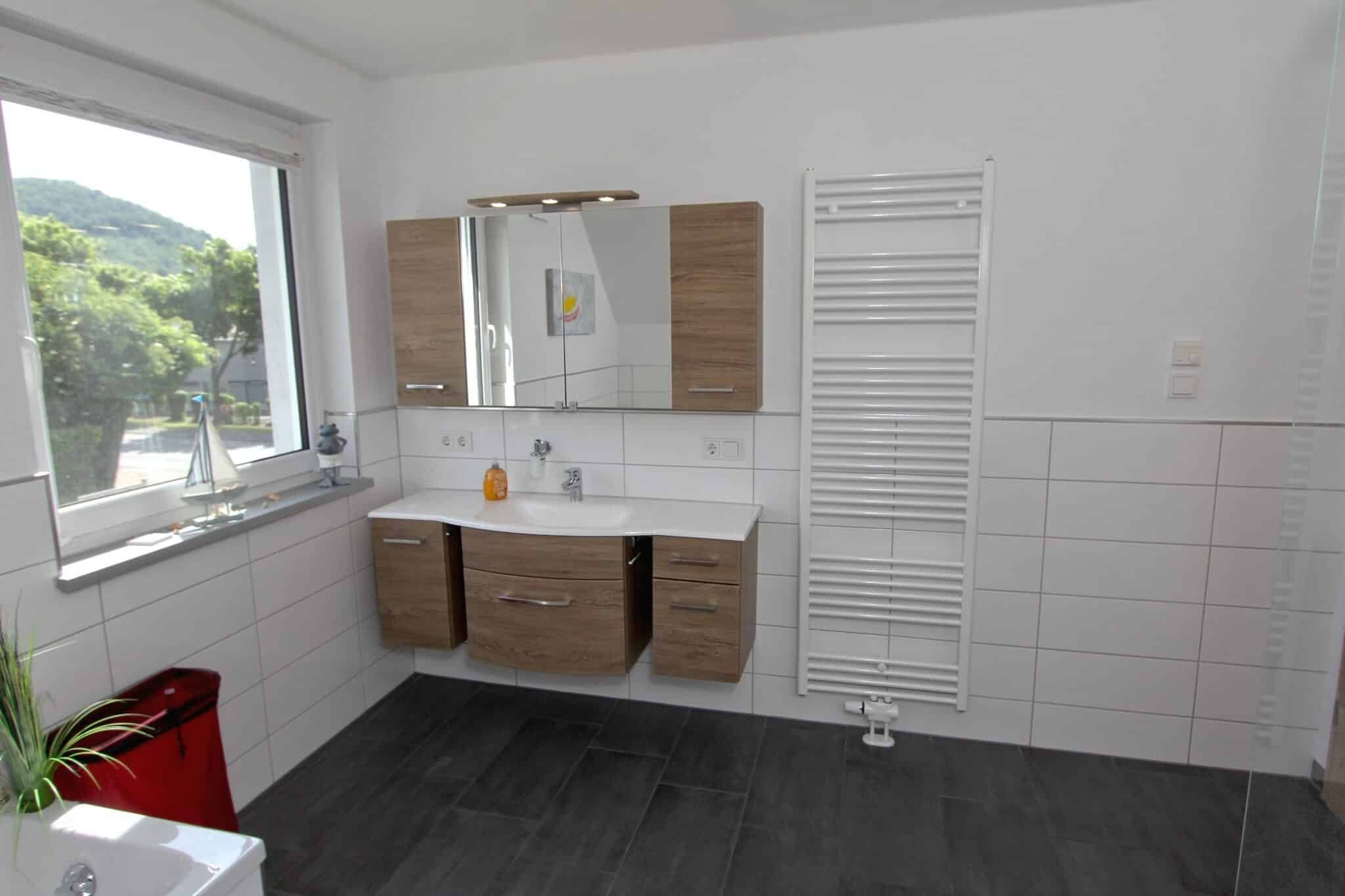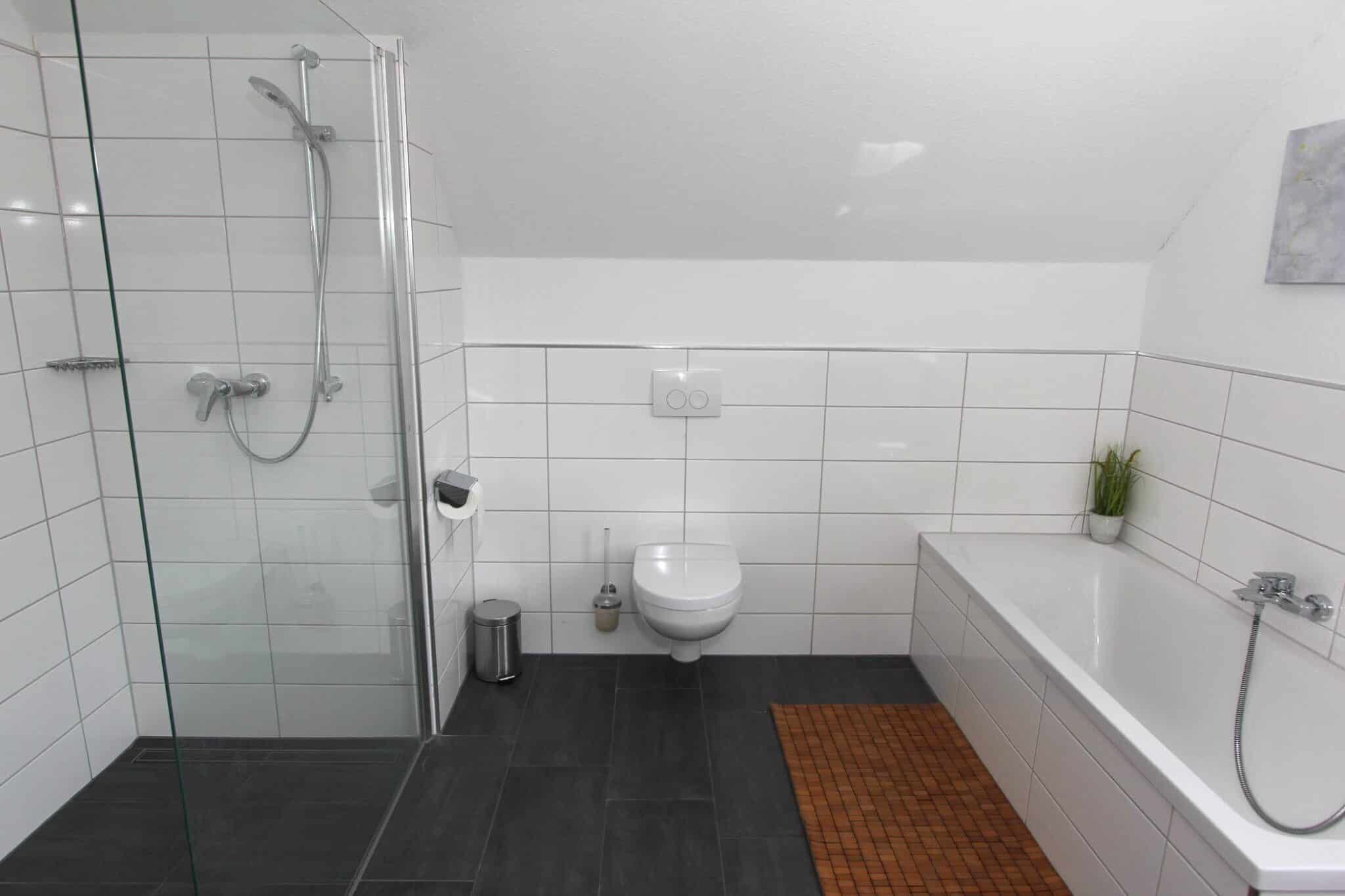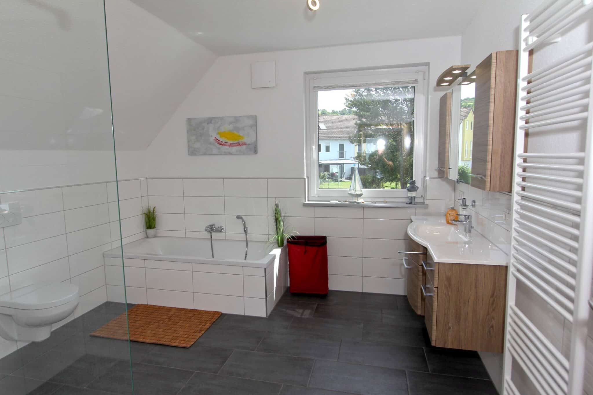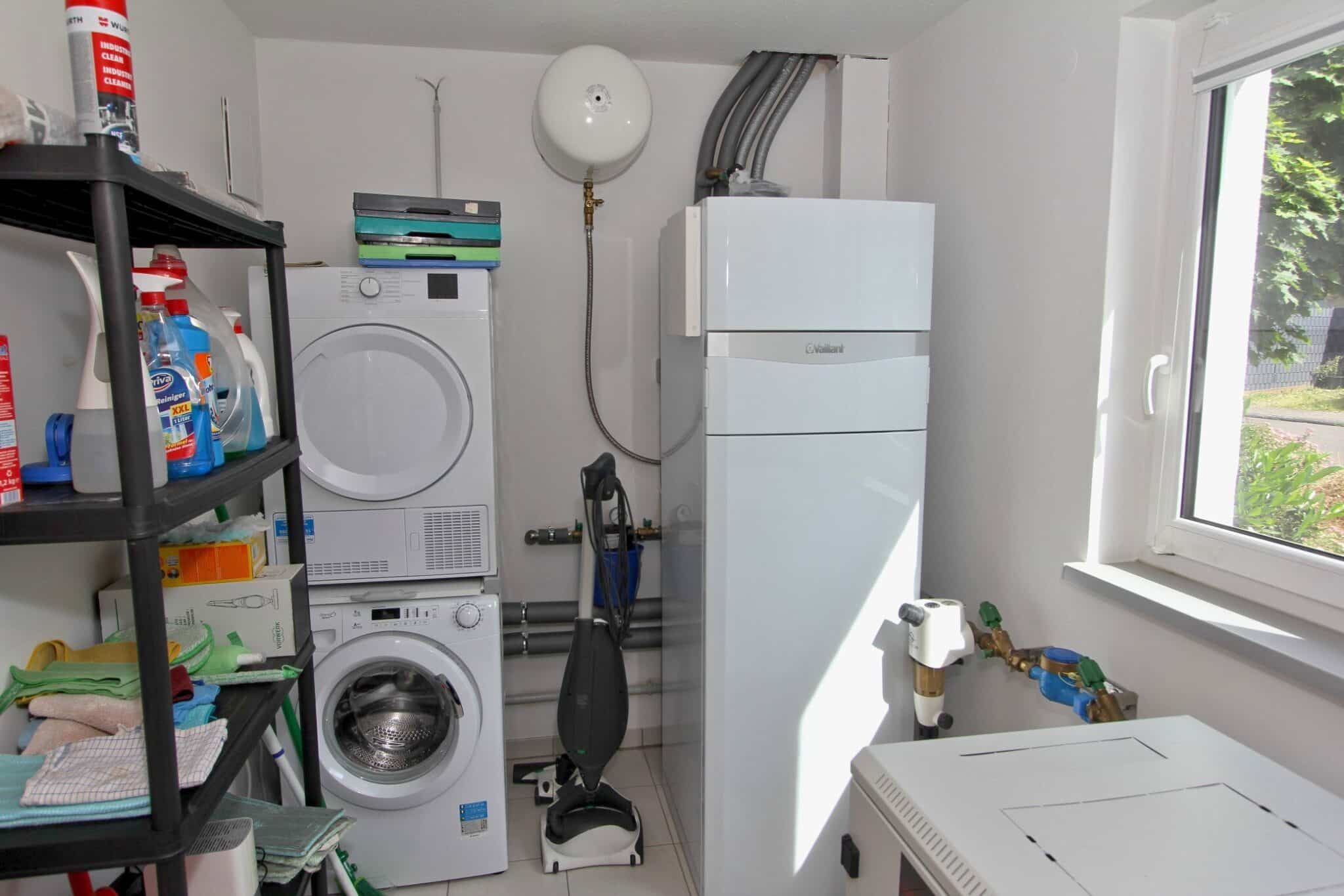 Die aufwändig gestaltete Außenhülle (einschaliges Mauerwerk aus Porenbeton 24,0 cm mit Wärmedämmverbundsystem 12,0 cm, mehrlagigem Putz mit Vliesarmierung und Deckputz), 24 cm dicke Mineralwolledämmung WLG 035 im ausgebauten Bereich des Dachgeschosses, Multimediaverkabelung, Luft-/Wasser-Wärmepumpe inkl. Fußbodenheizung, Stahlbetonfertigteildecke, bodengleiche Dusche im Bad, die geschmackvolle Einbauküche etc. belegen die vorbildliche Bauausführung und Ausstattung der Immobilie, die sich wie ein roter Faden durch alle Gewerke zieht.
