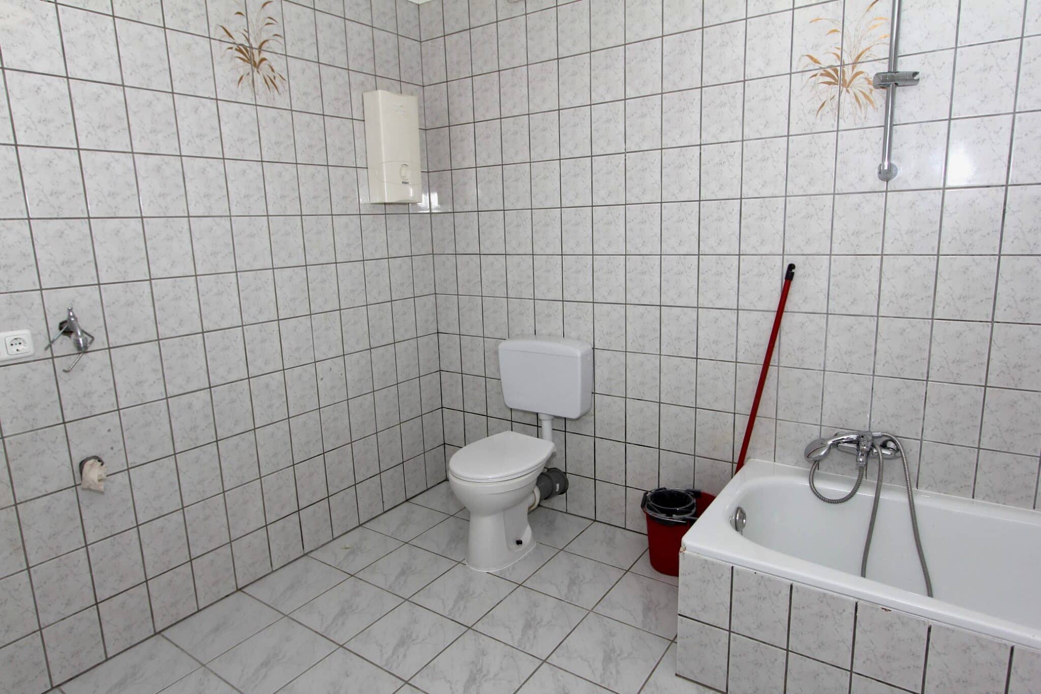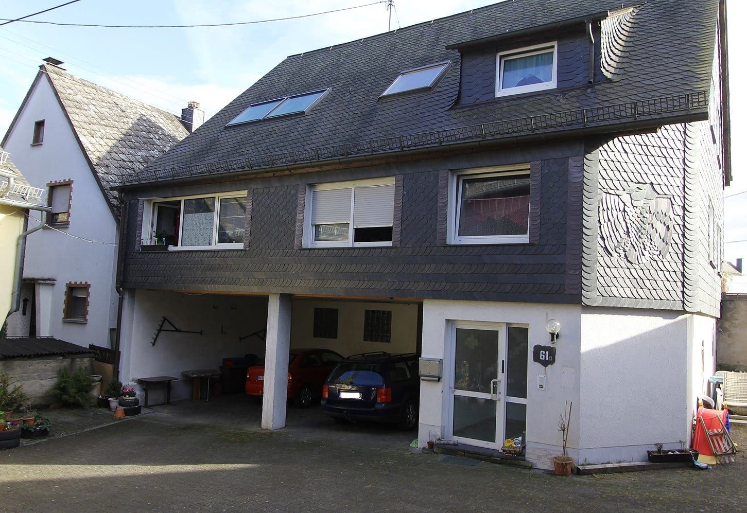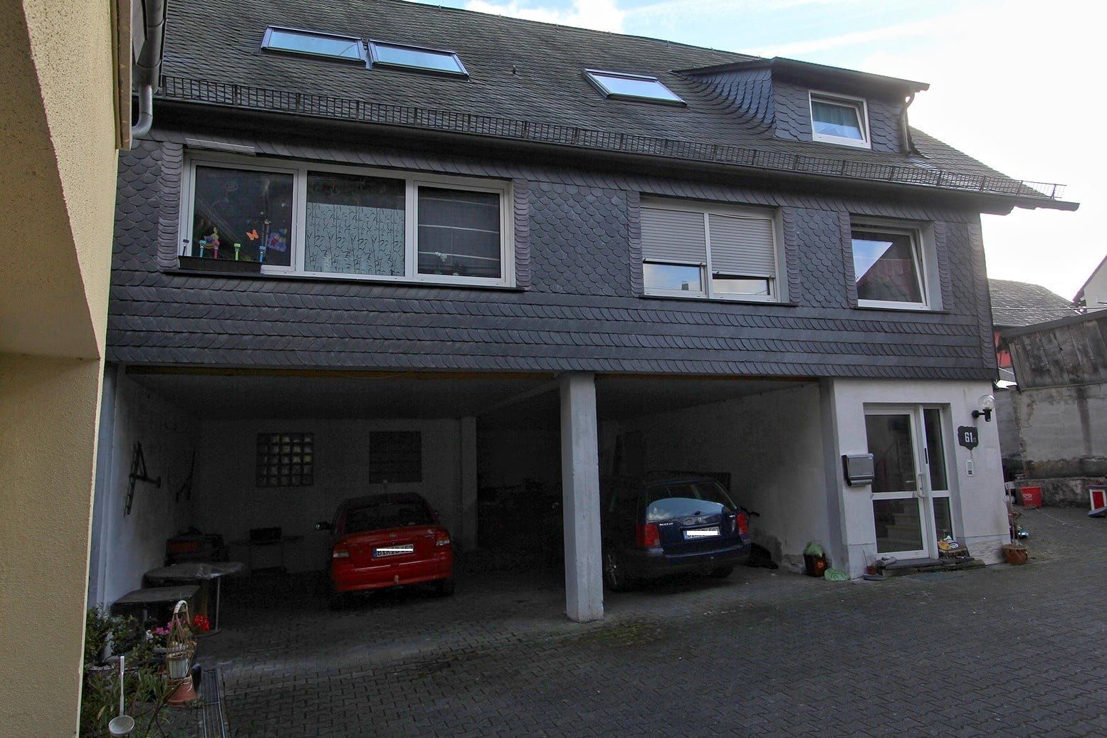 Zu vermieten ist die Obergeschosswohnung im Gebäude Hauptstraße 61 A. Im Erdgeschoss befinden sich zwei überdachte Kfz-Abstellplätze, die üblichen Kellerräume und der Eingang zum Treppenhaus.