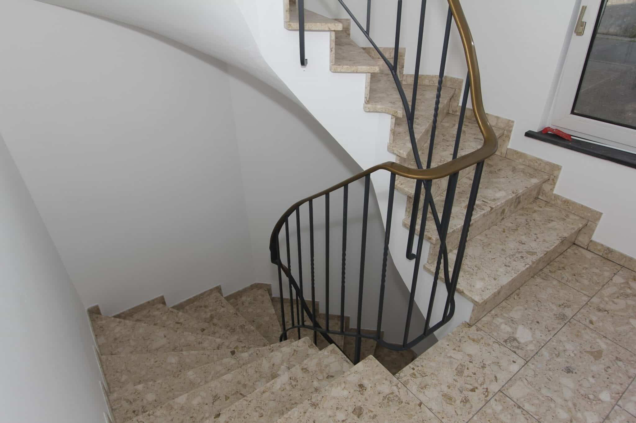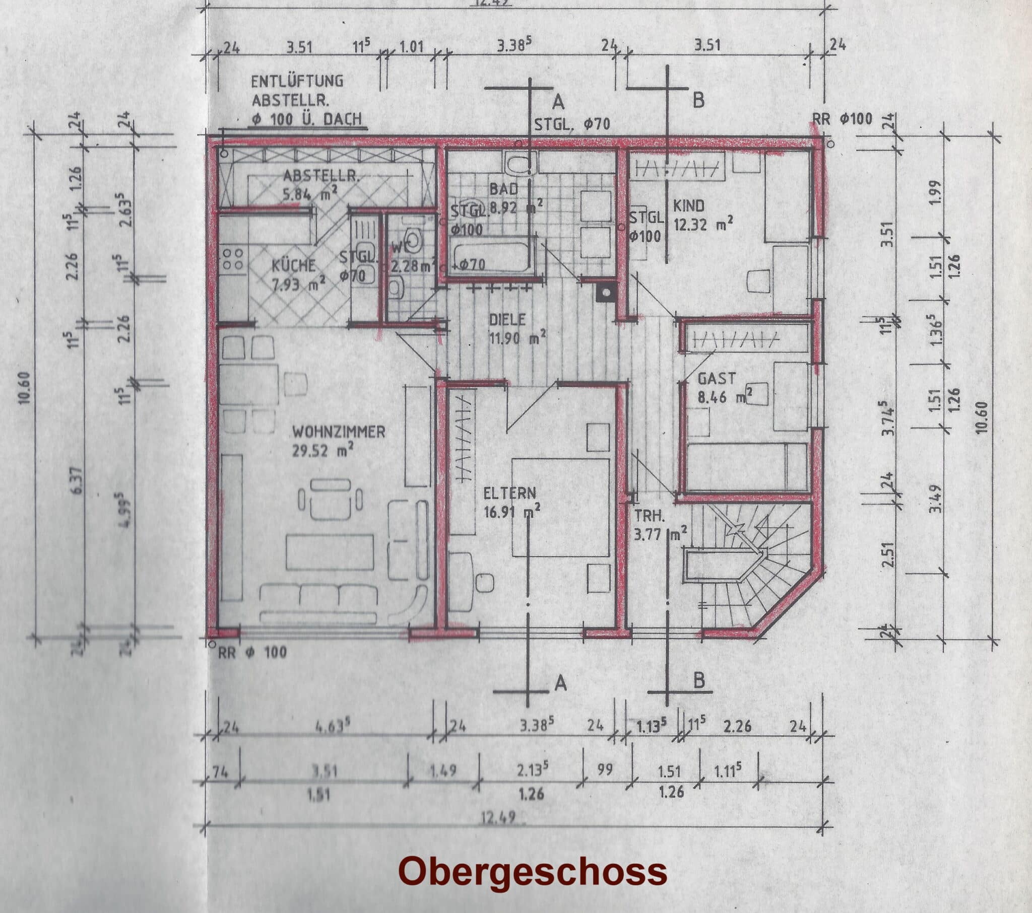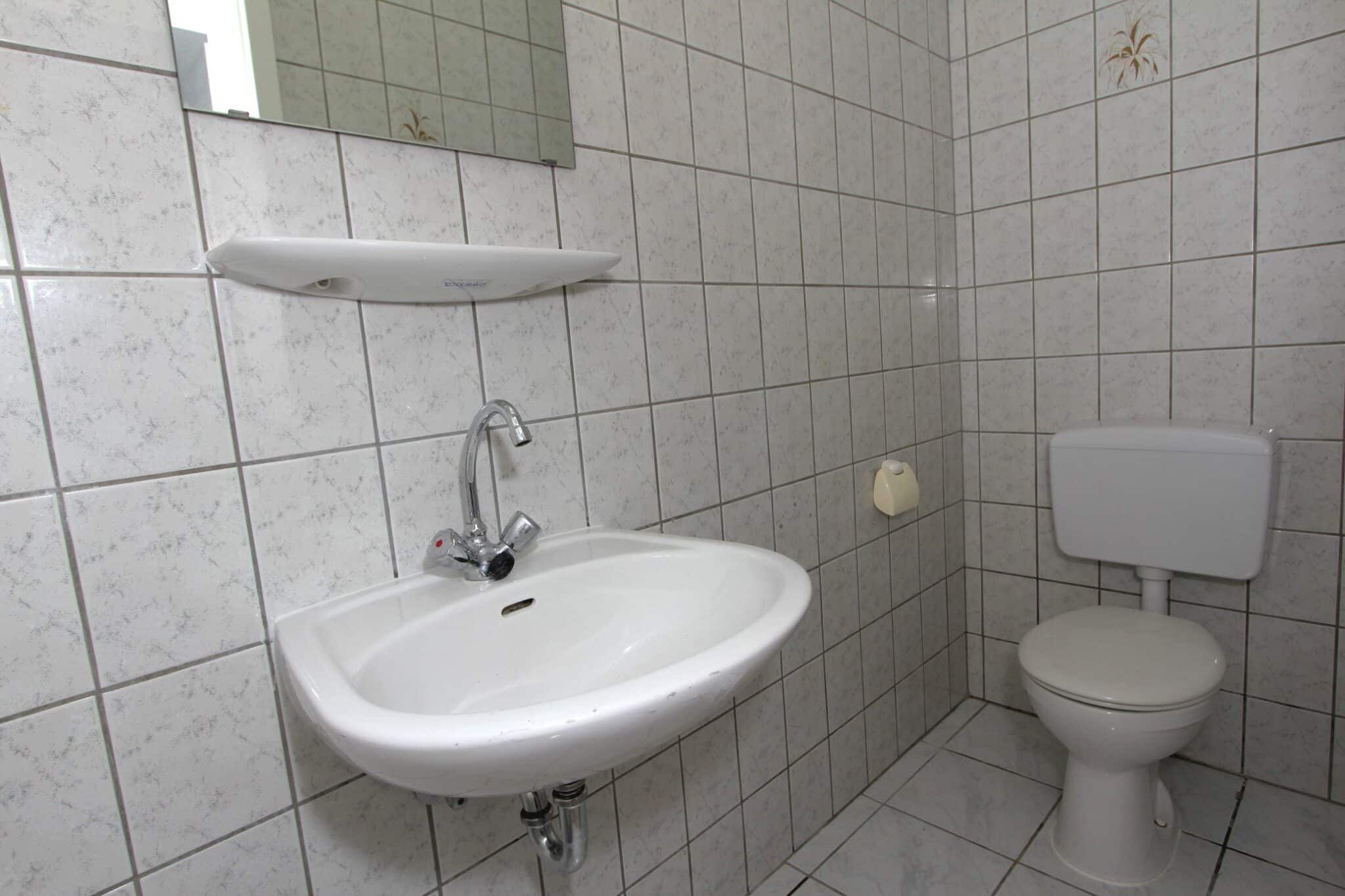 Zu vermieten ist die Obergeschosswohnung im Gebäude Hauptstraße 61 A. Im Erdgeschoss befinden sich zwei überdachte Kfz-Abstellplätze, die üblichen Kellerräume und der Eingang zum Treppenhaus.