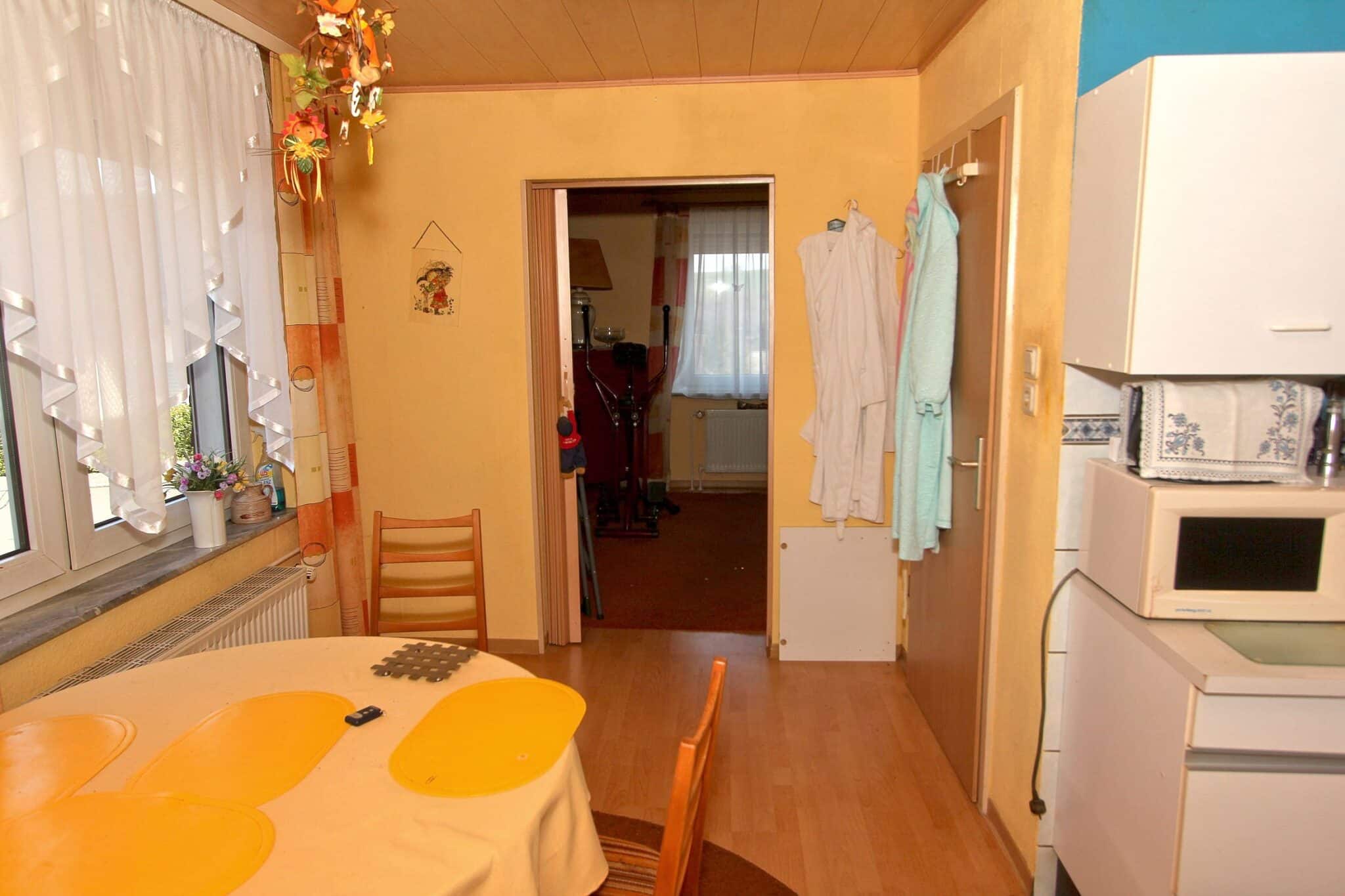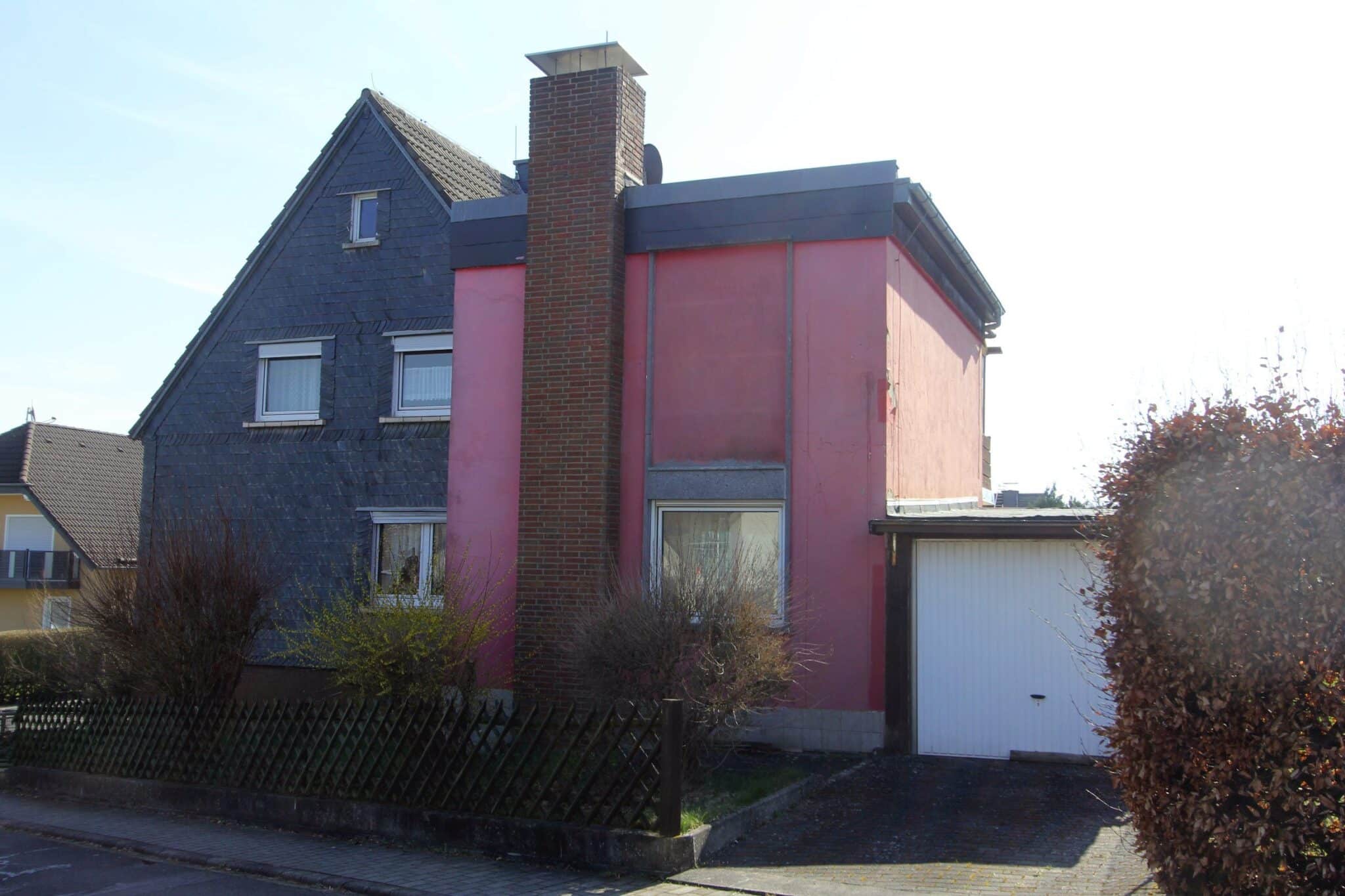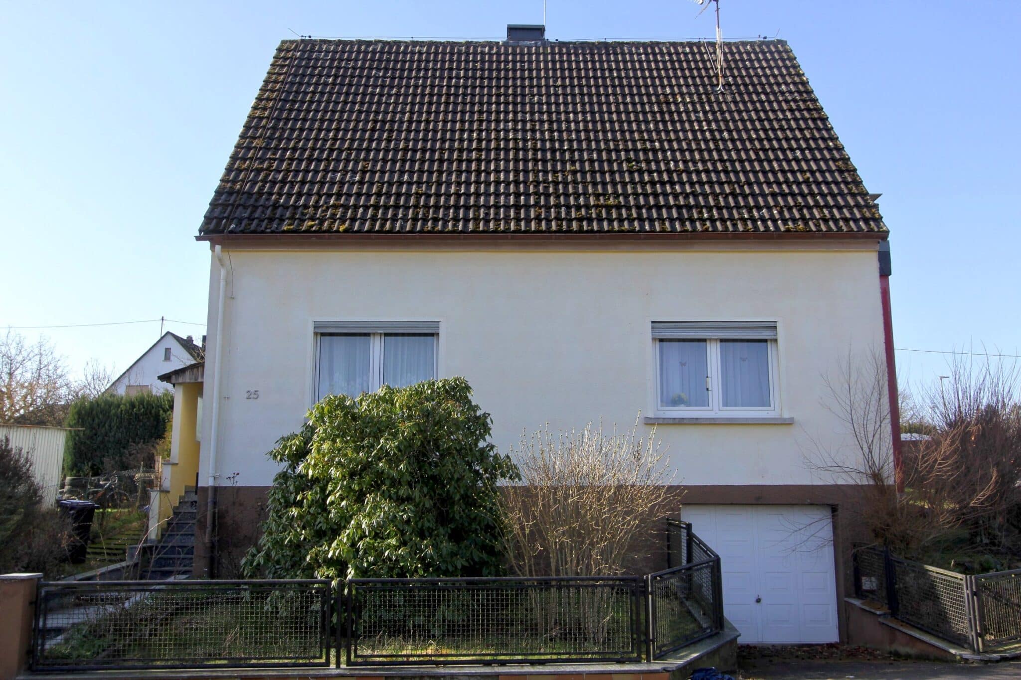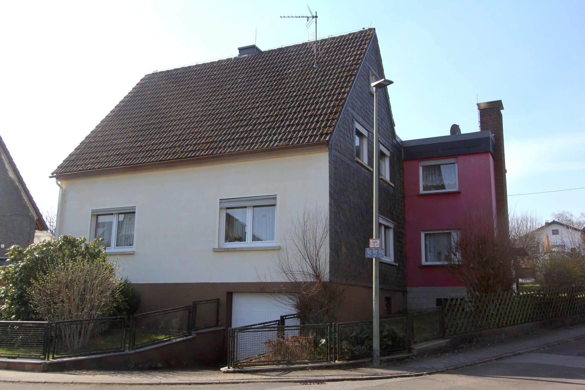 In einer ruhigen Seitenstraße von Rhaunen steht dieses 1960/61 errichtete Haus, das durch einen Anbau 1971–73 auf rund 169 m² Wohnfläche in Erd- und Dachgeschoss erweitert wurde. Im Erd- und Dachgeschoss befinden sich jeweils ein Wohnzimmer (im EG mit Terrassenausgang und im OG mit Balkonzugang), der Küchen-/Essbereich, 2 Schlafzimmer, Bad (Wanne/WC) und Speisekammer/Abstellraum. Die Deckenhöhen betragen 2,33–2,40 m im Erd- und 2,36–2,48 m im Dachgeschoss. Über eine Bodeneinschubtreppe gelangt man zum Dachboden. Das Haus ist vollständig unterkellert und verfügt über eine Garage. An den Wohnhausanbau schließt sich eine Holzgarage an.