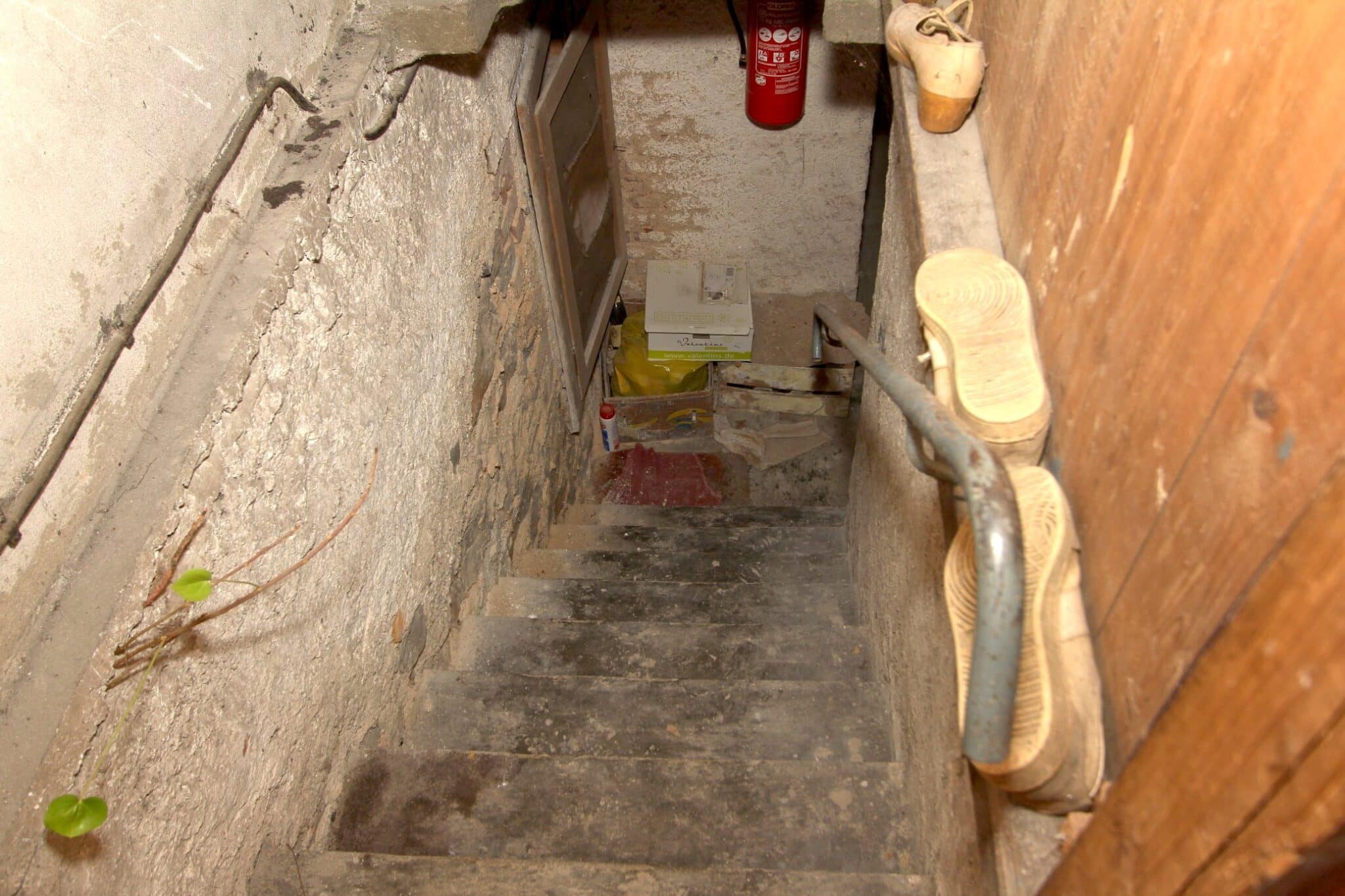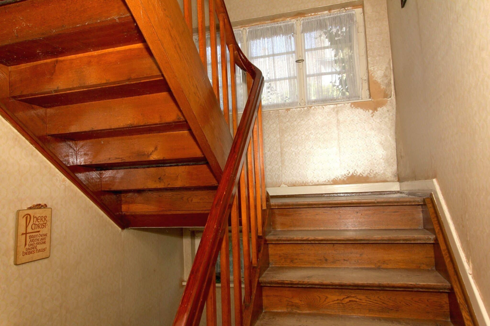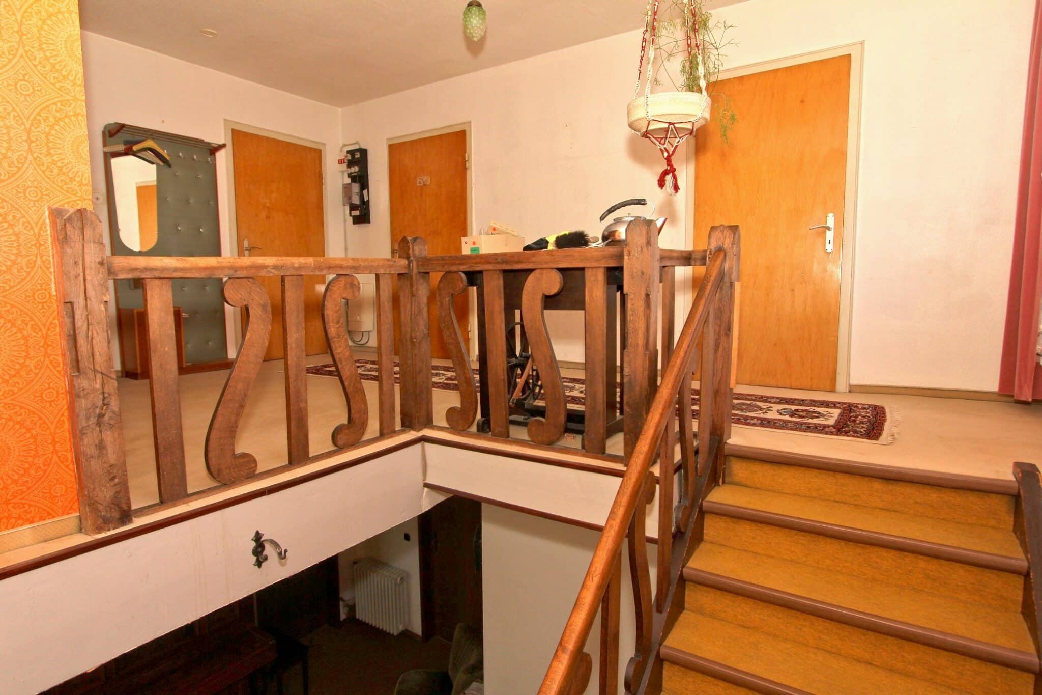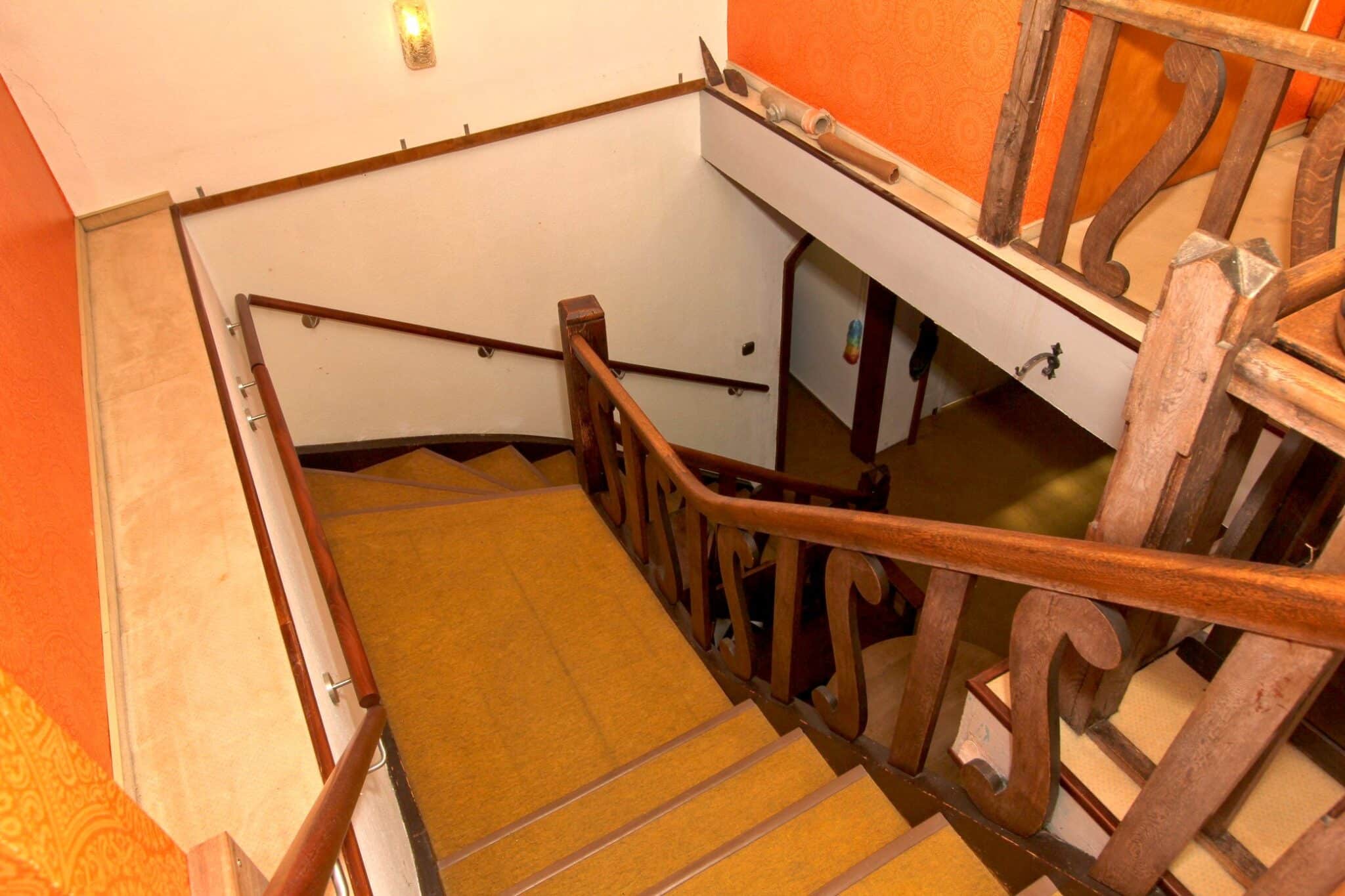 Die Wohnbereiche sind über das vorgelagerte Treppenhaus zu erreichen. Der Dachboden ist über eine Bodeneinschubtreppe im Treppenhaus zu begehen. Das Haus ist voll unterkellert mit dem Heizungs- und Ölraum, einem Lager- und Waschraum für die Dachwohnung und drei großen Lager- bzw. Hobbyräumen. Seitlich an das Haus angebaut ist ein Lagerraum für Gartengeräte, Fahrräder o. ä. Durch diesen gelangt man auch durch den Keller mittels Treppe auf das rückwärtige Grundstück.