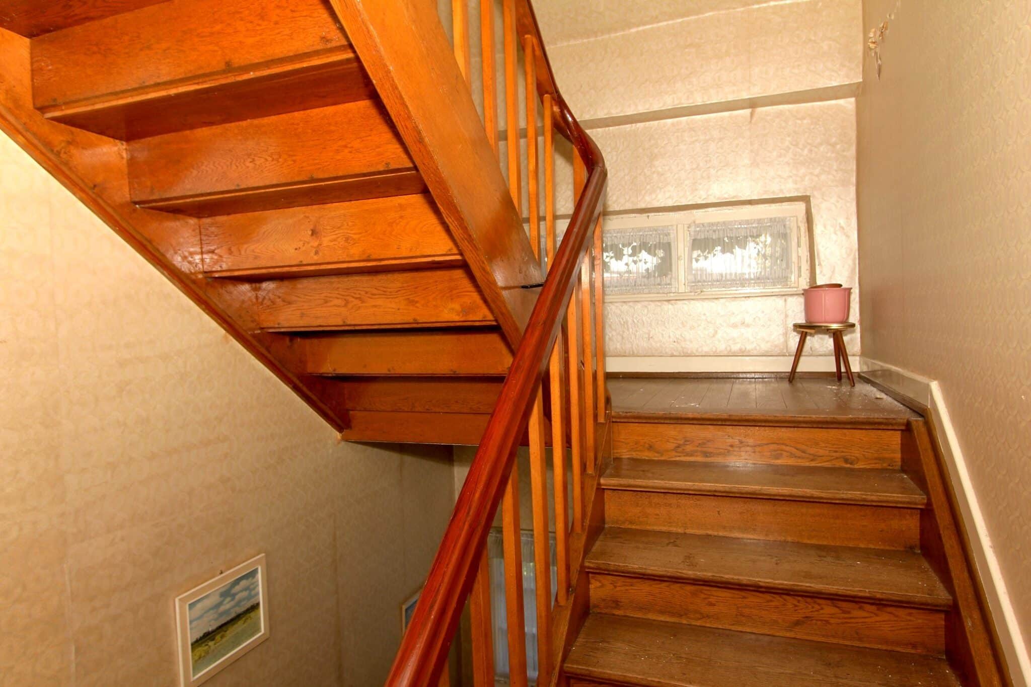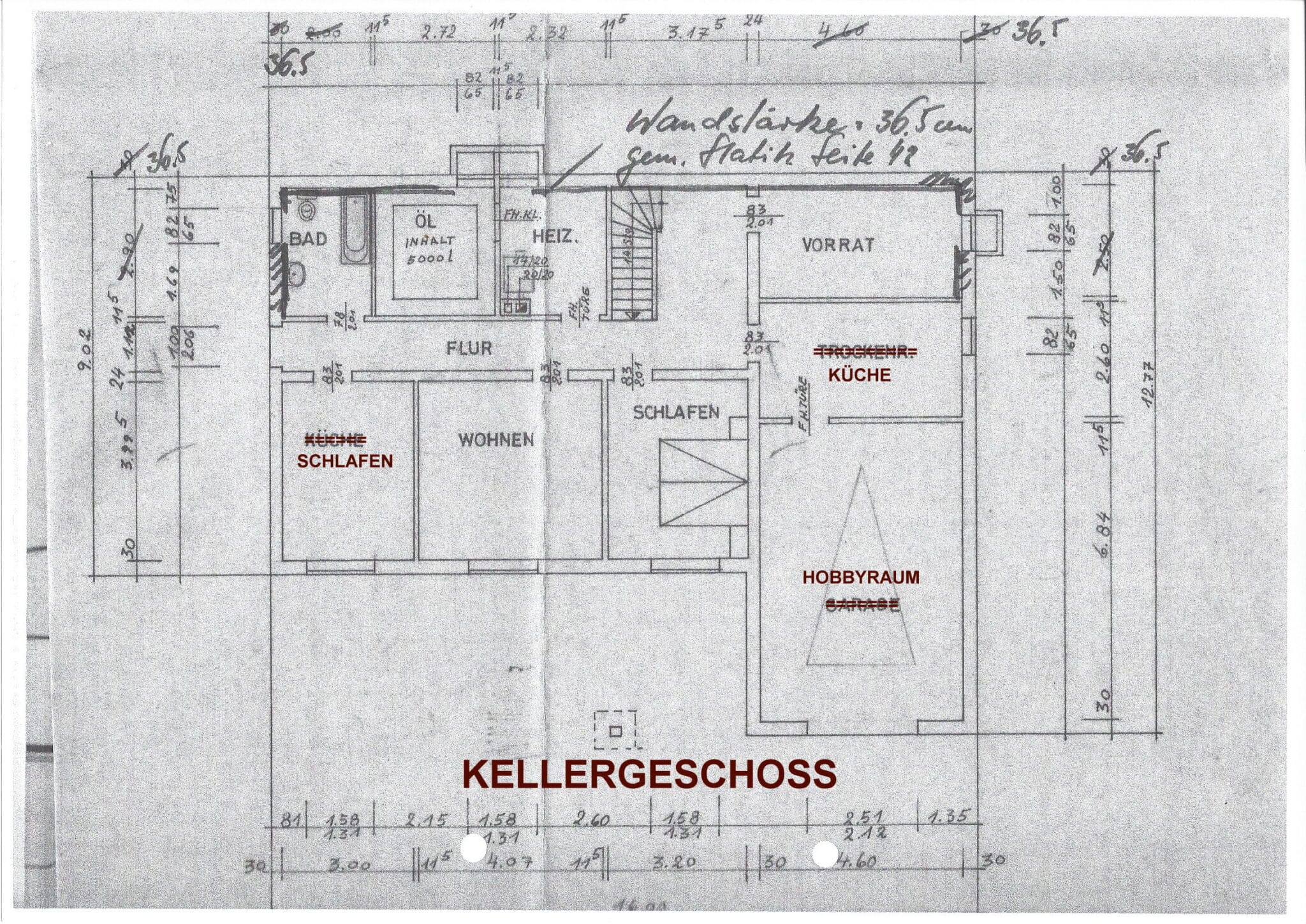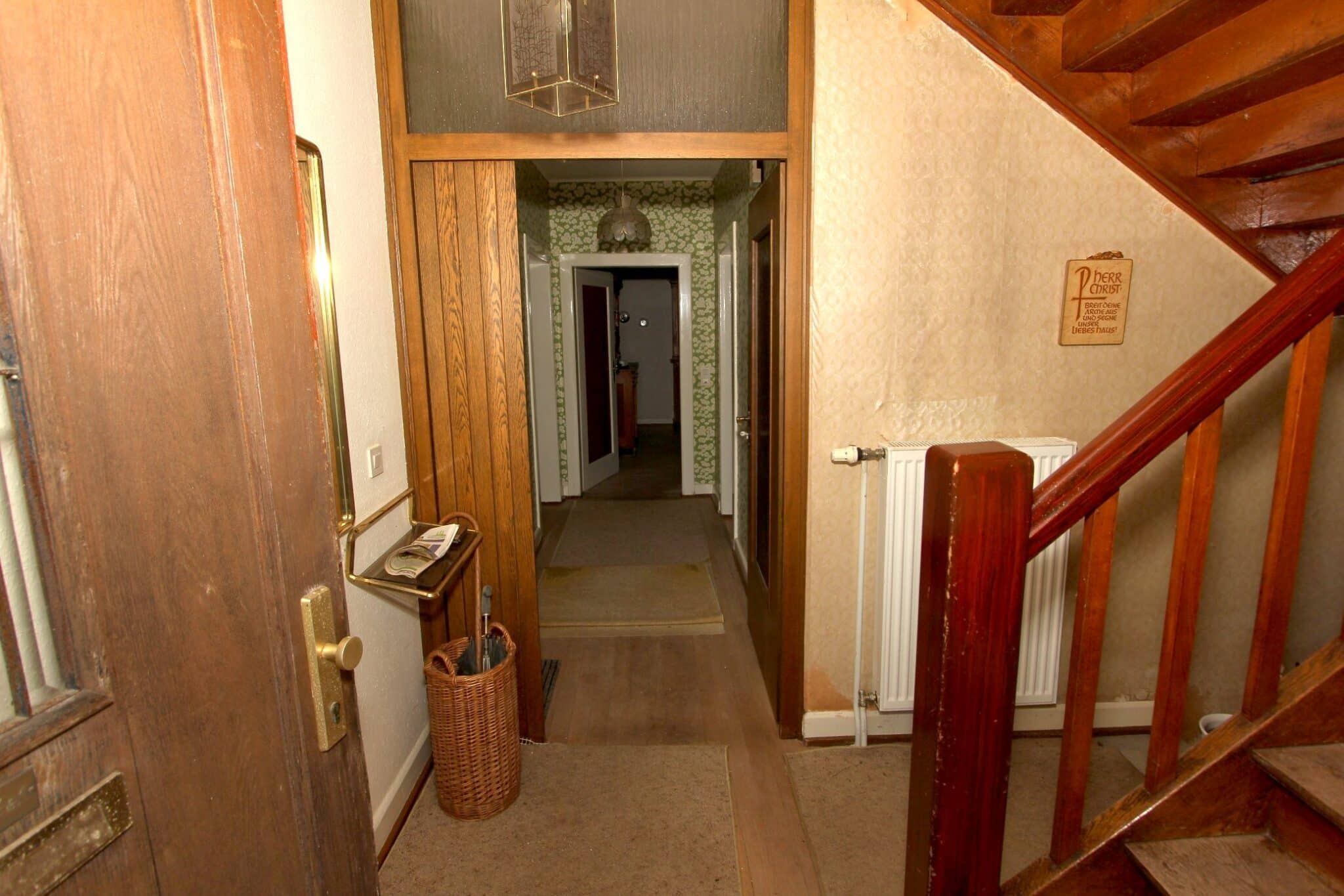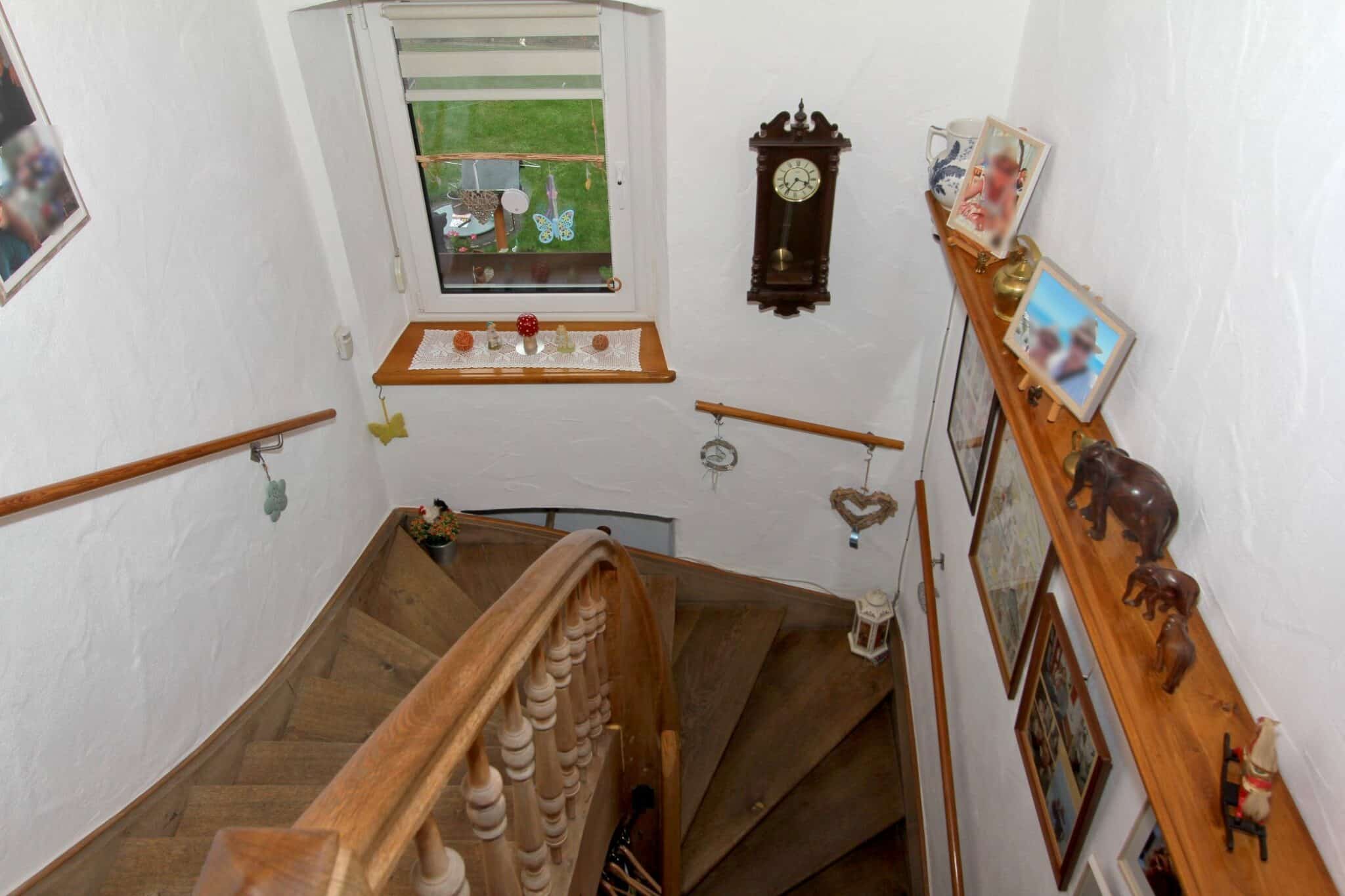 Die Wohnbereiche sind über das vorgelagerte Treppenhaus zu erreichen. Der Dachboden ist über eine Bodeneinschubtreppe im Treppenhaus zu begehen. Das Haus ist voll unterkellert mit dem Heizungs- und Ölraum, einem Lager- und Waschraum für die Dachwohnung und drei großen Lager- bzw. Hobbyräumen. Seitlich an das Haus angebaut ist ein Lagerraum für Gartengeräte, Fahrräder o. ä. Durch diesen gelangt man auch durch den Keller mittels Treppe auf das rückwärtige Grundstück.