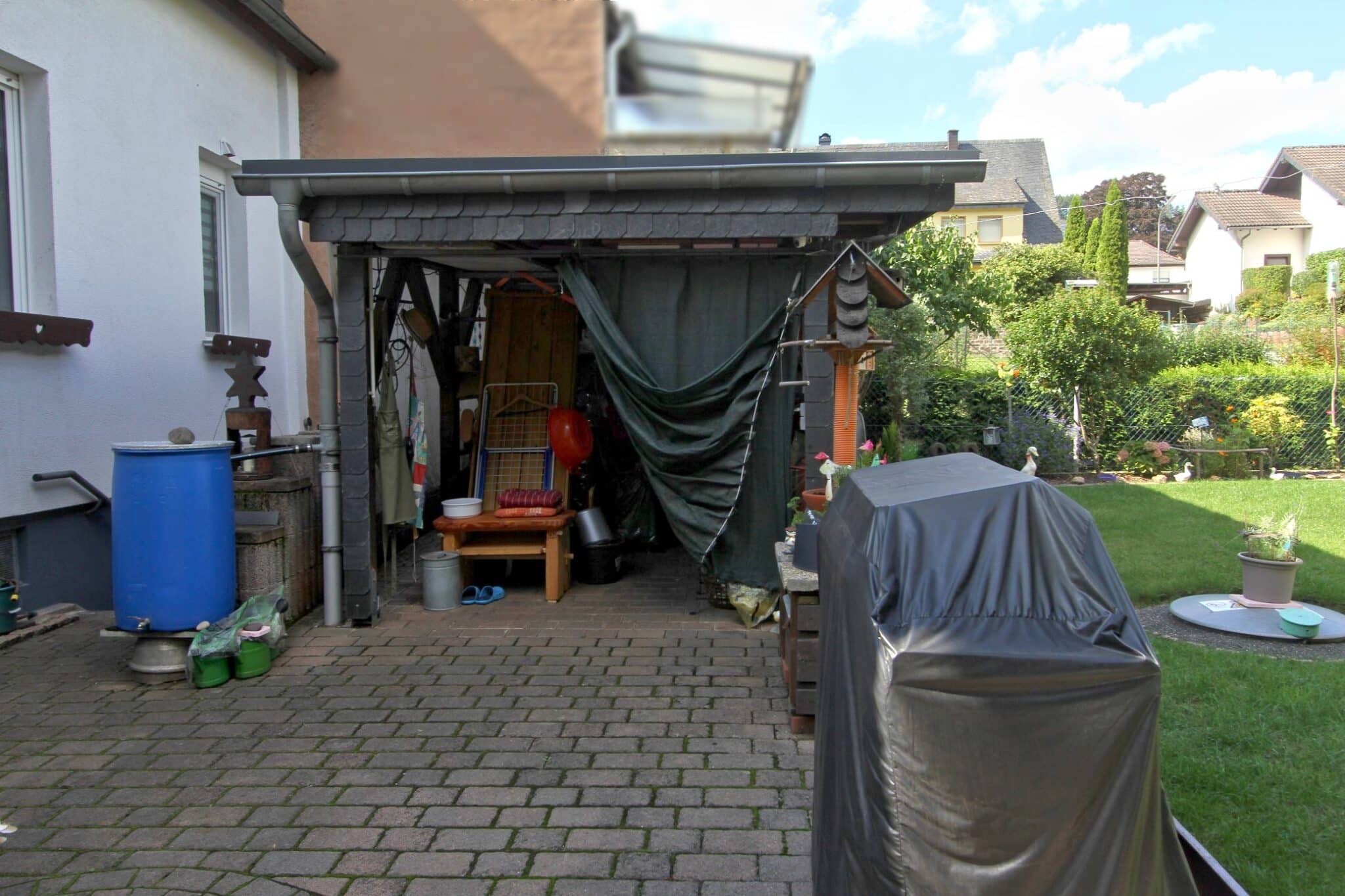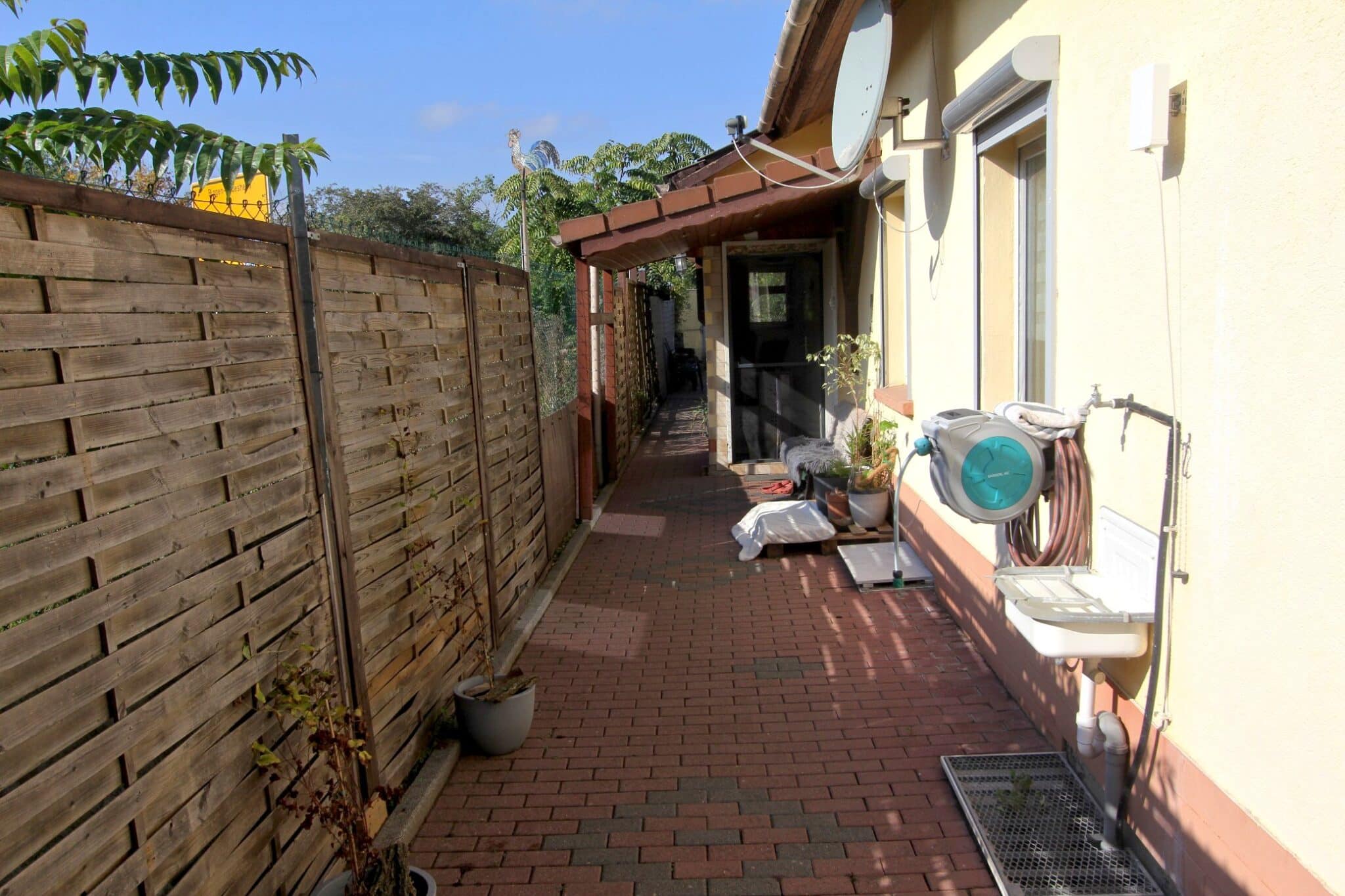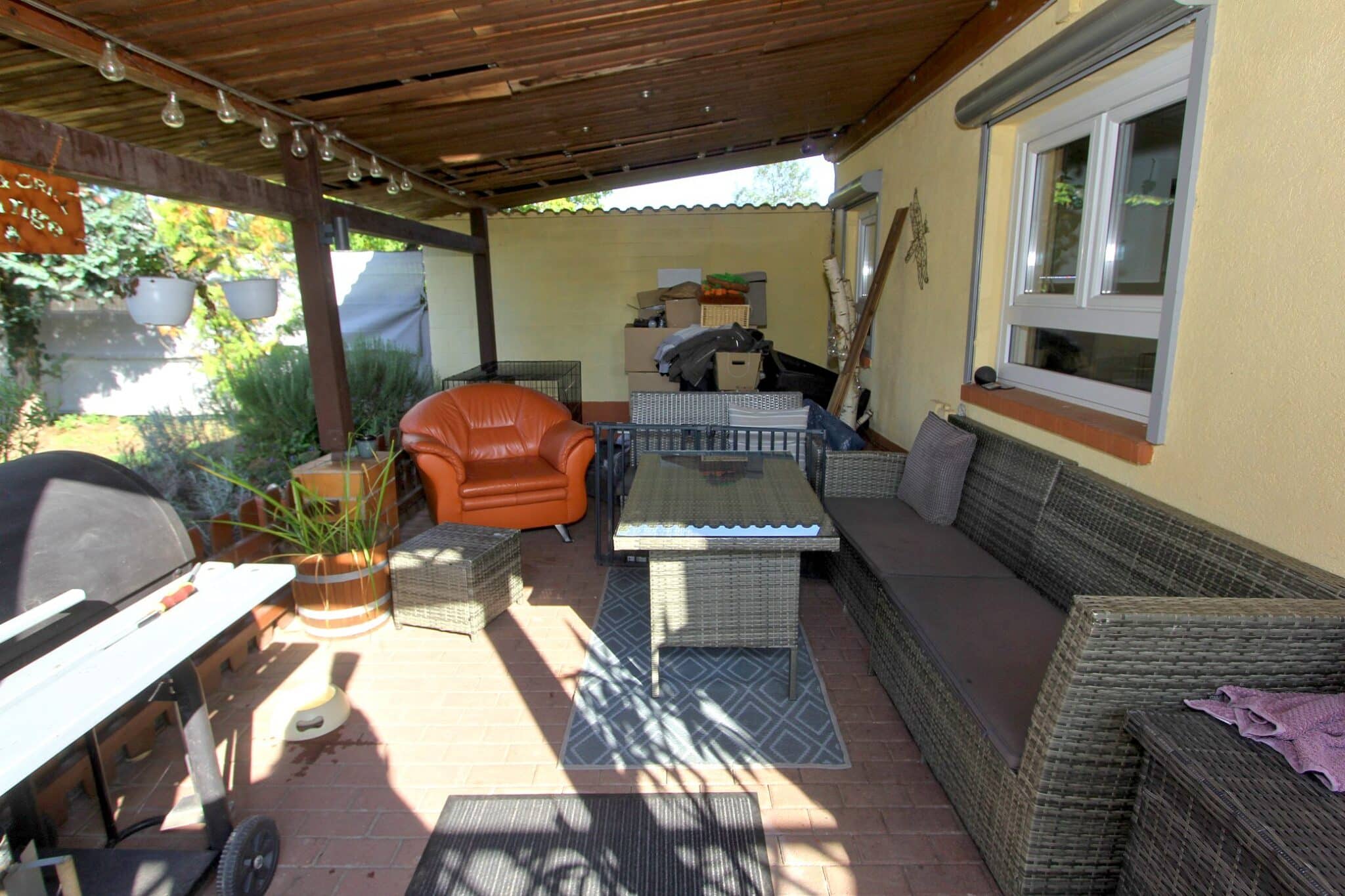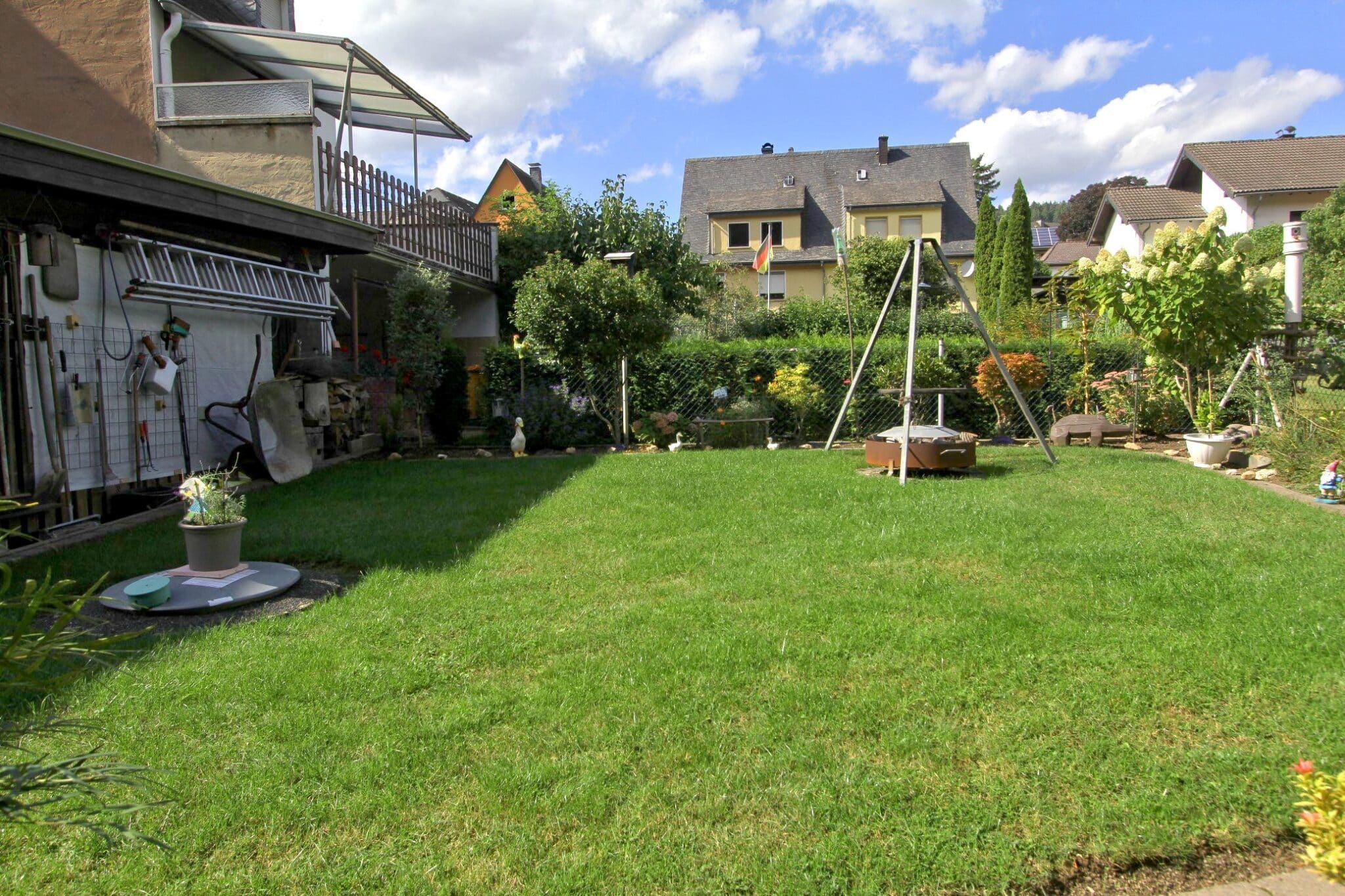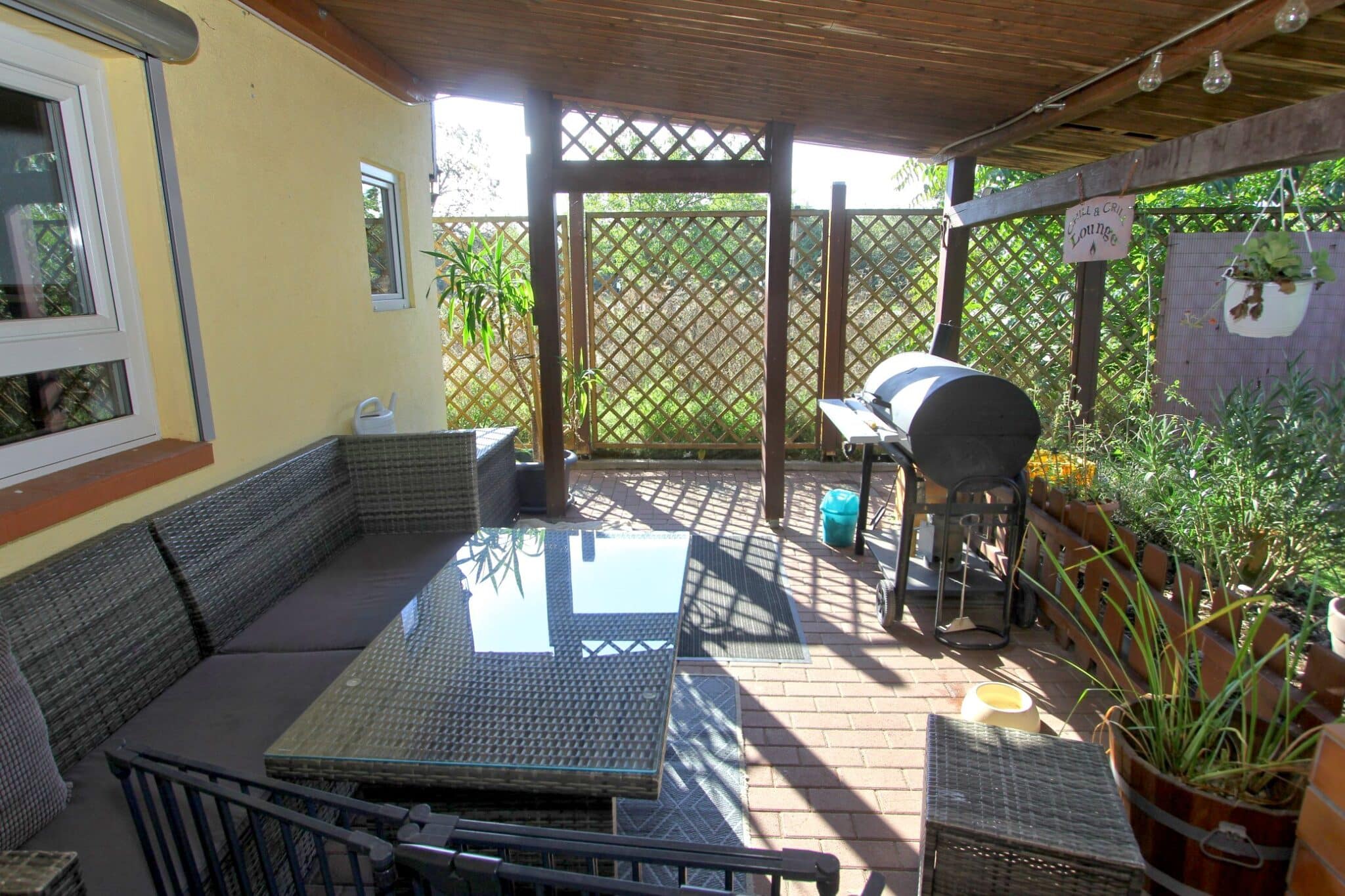 Durch das Kellergeschoss gelangt man auf den überdachten Balkon und von dort aus mittels Treppe zur überschaubaren, aber zum Relaxen ausreichenden Gartenfläche.