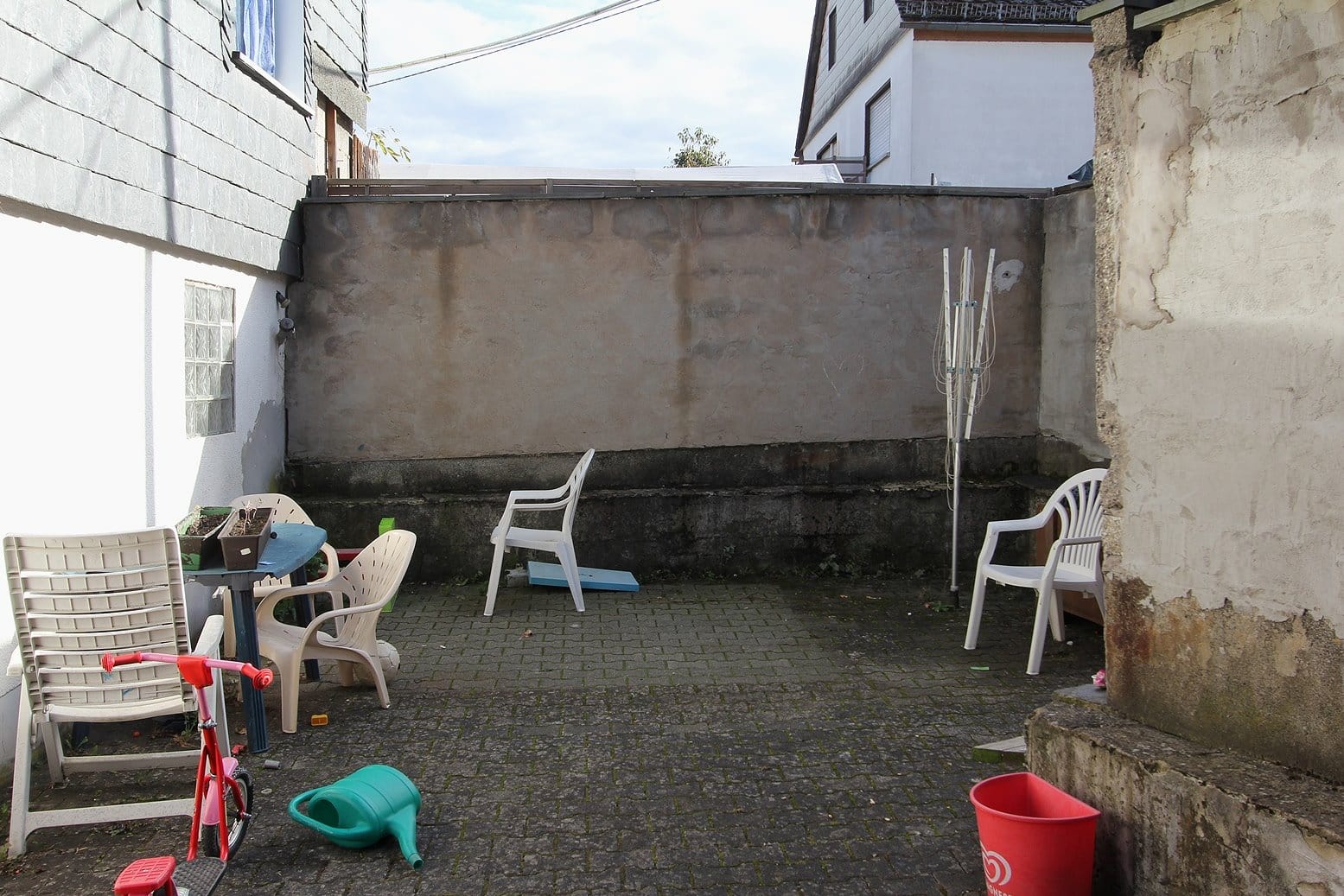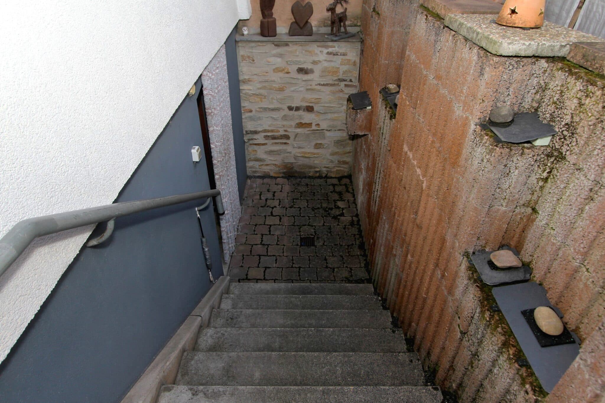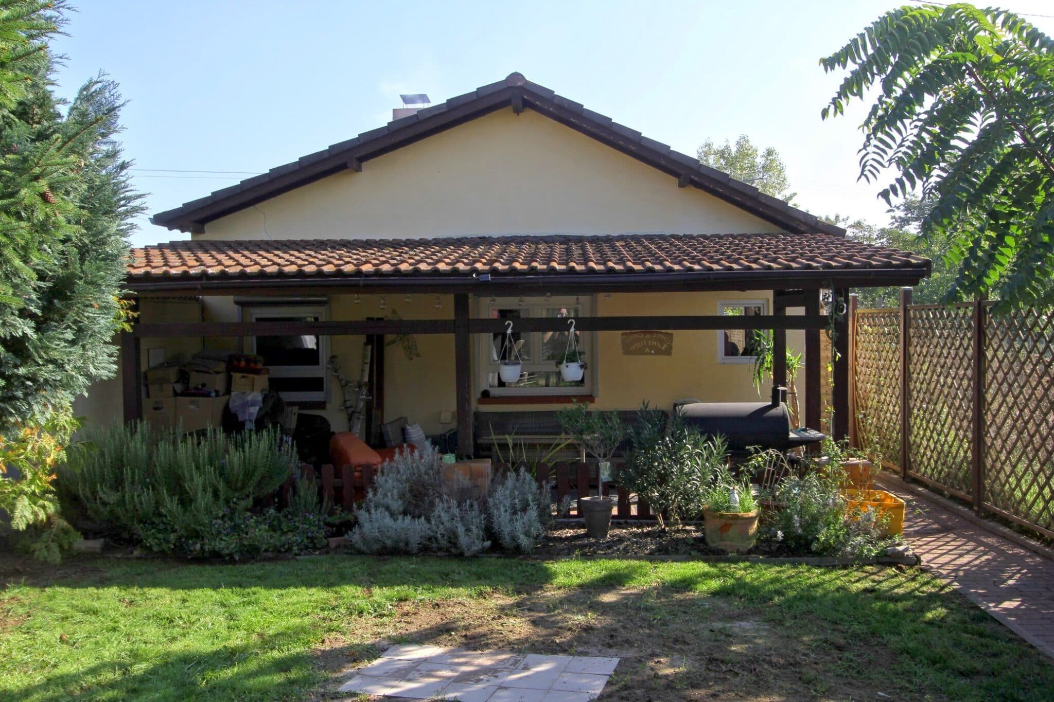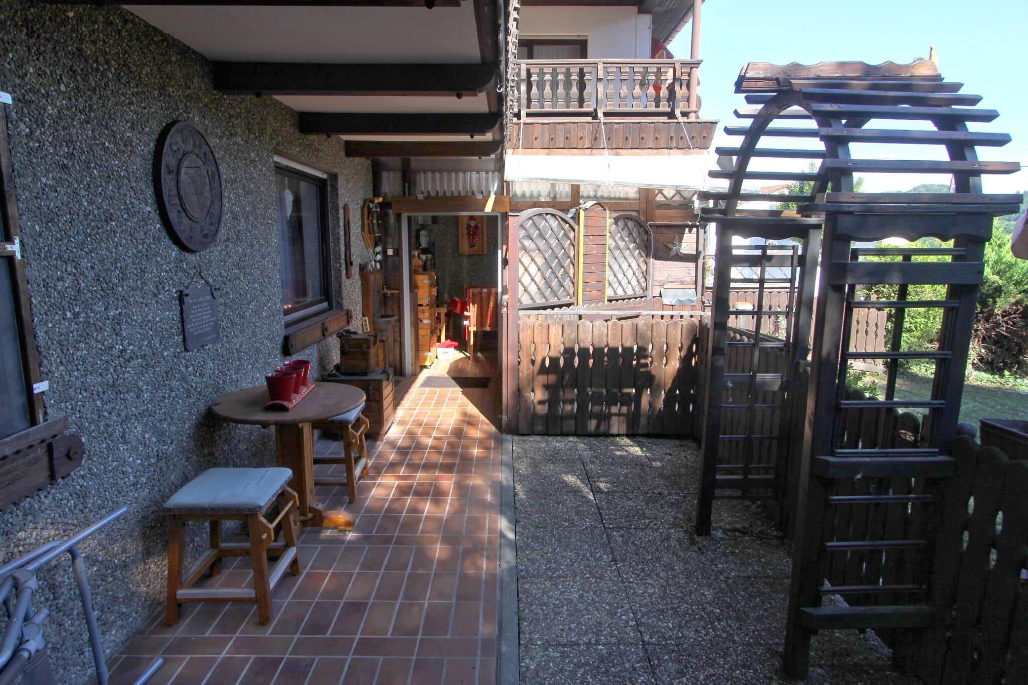Durch das Kellergeschoss gelangt man auf den überdachten Balkon und von dort aus mittels Treppe zur überschaubaren, aber zum Relaxen ausreichenden Gartenfläche.