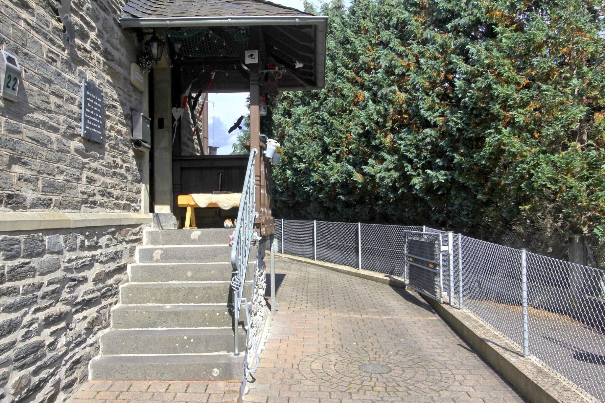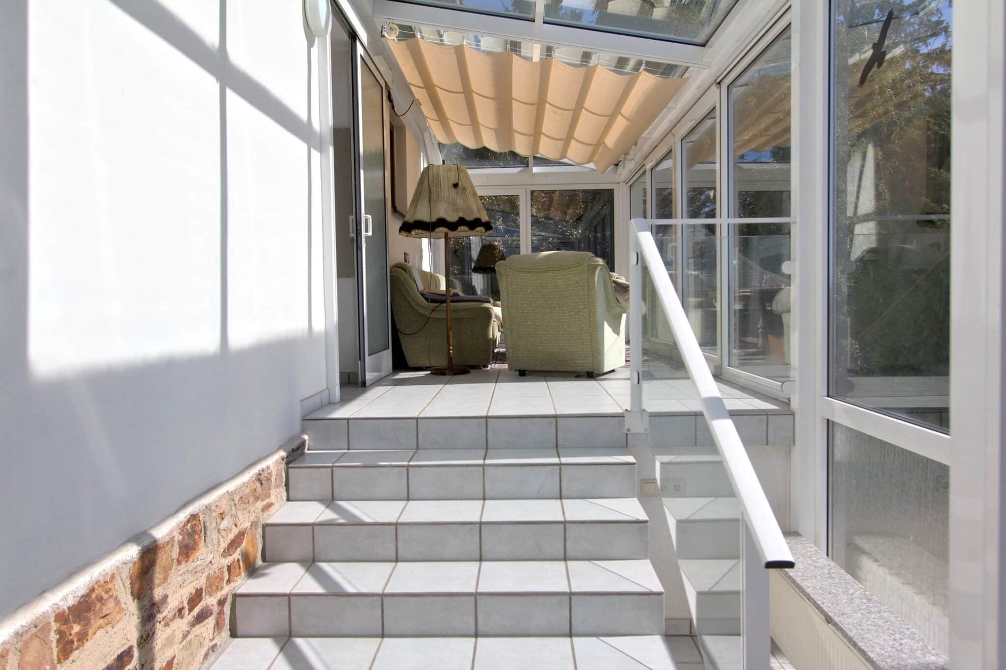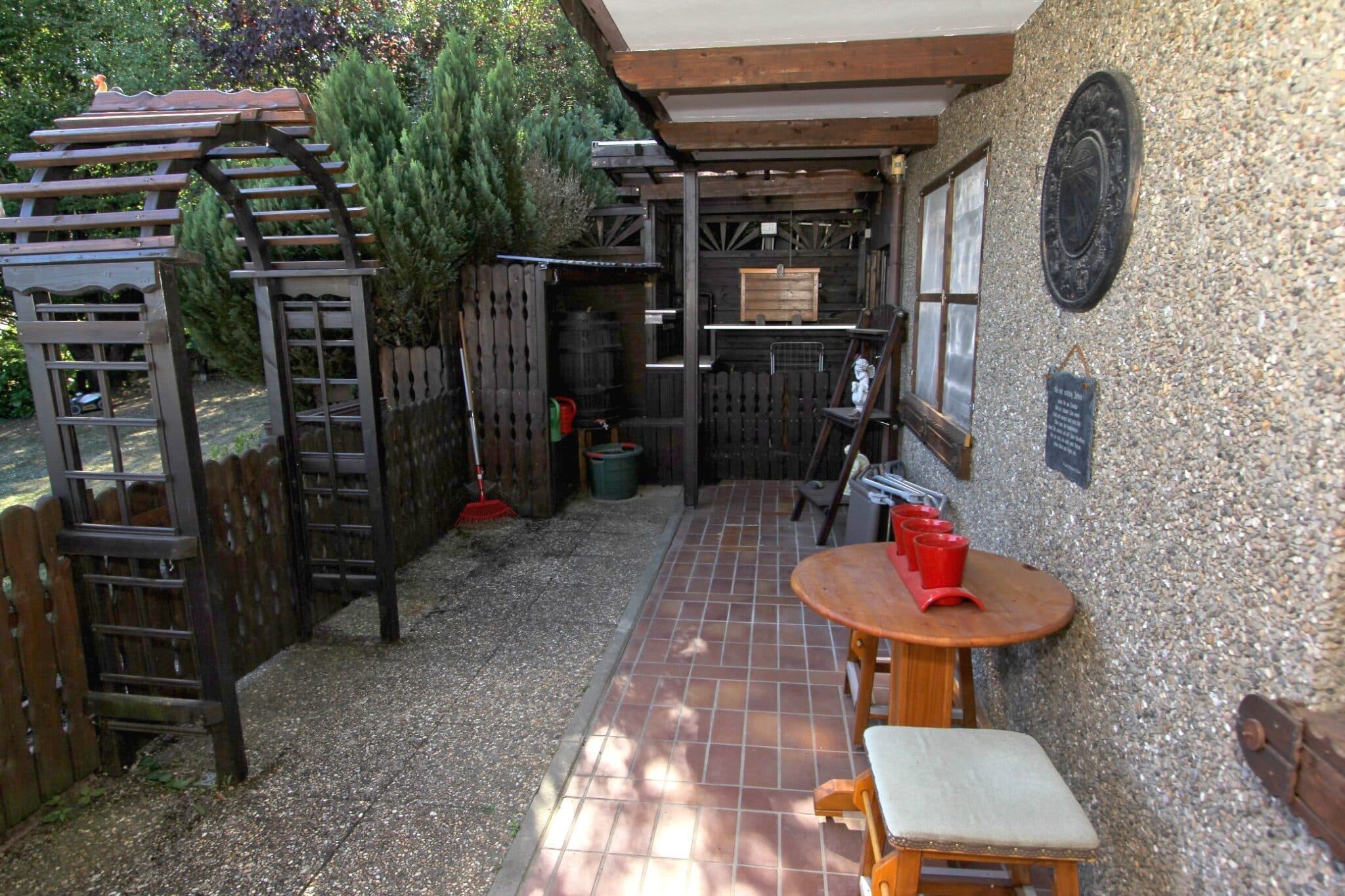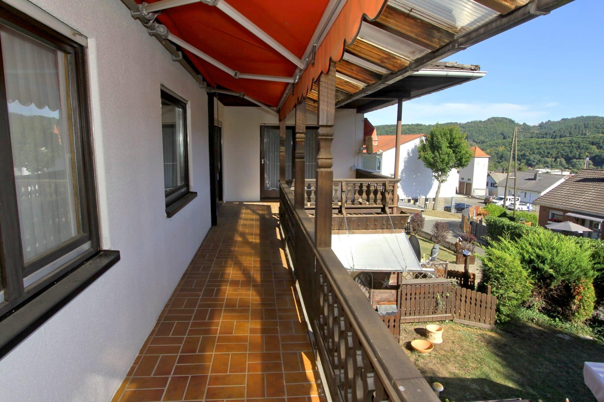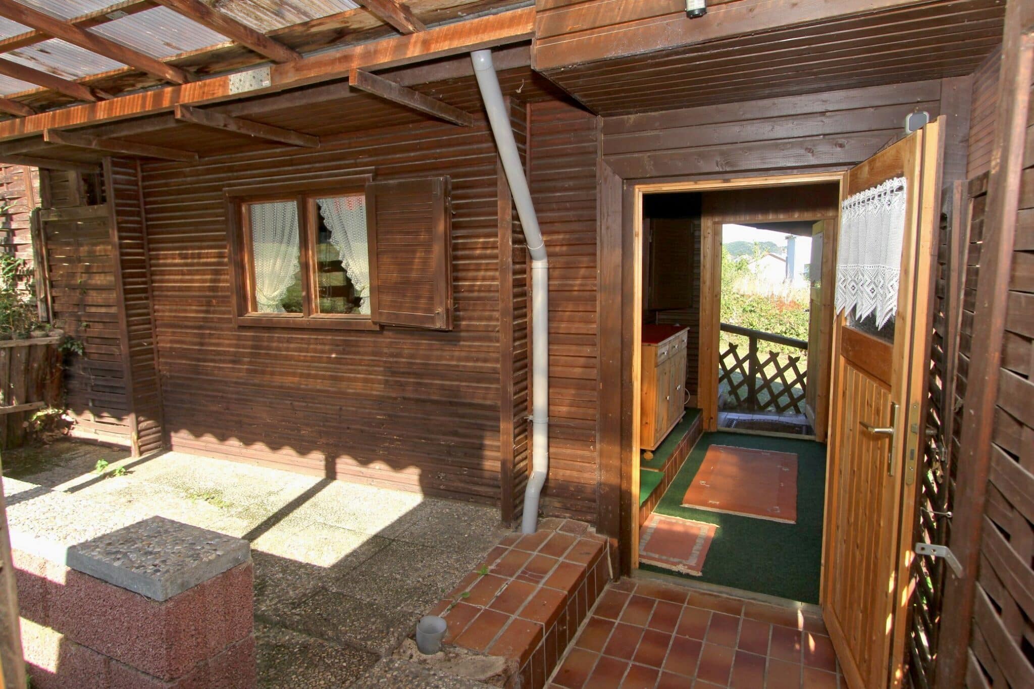Durch das Kellergeschoss gelangt man auf den überdachten Balkon und von dort aus mittels Treppe zur überschaubaren, aber zum Relaxen ausreichenden Gartenfläche.