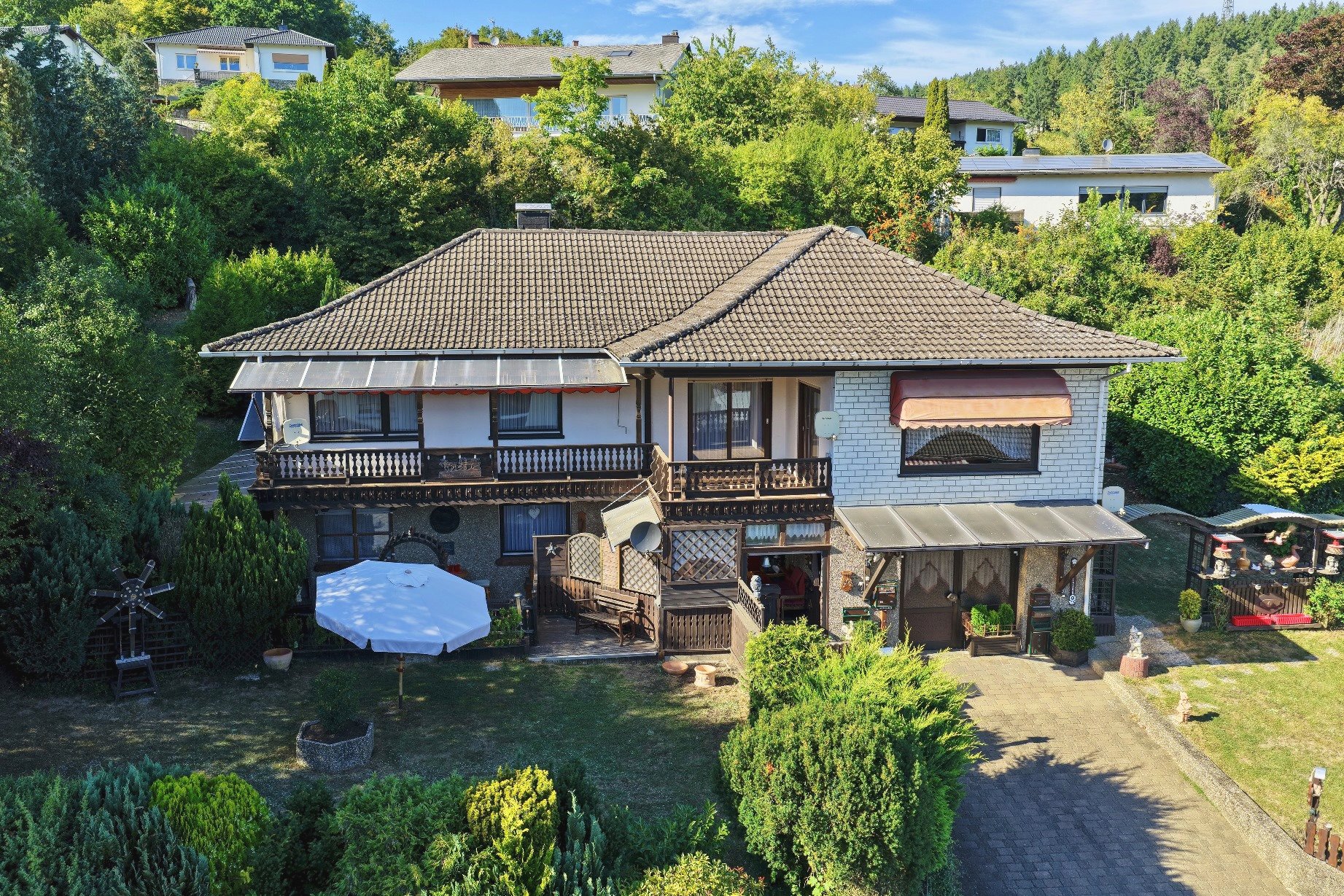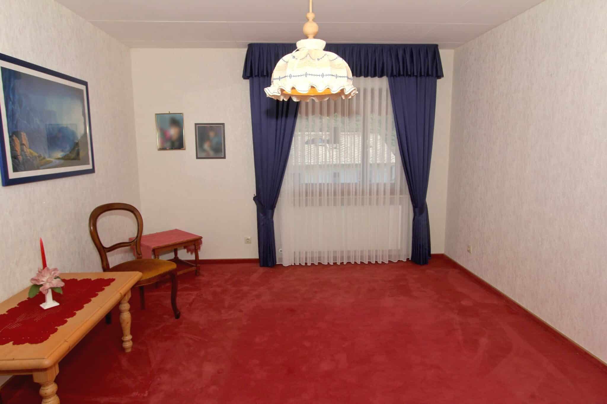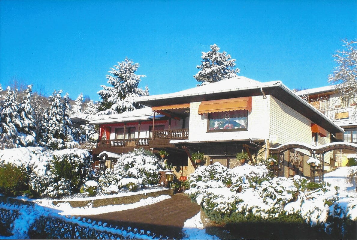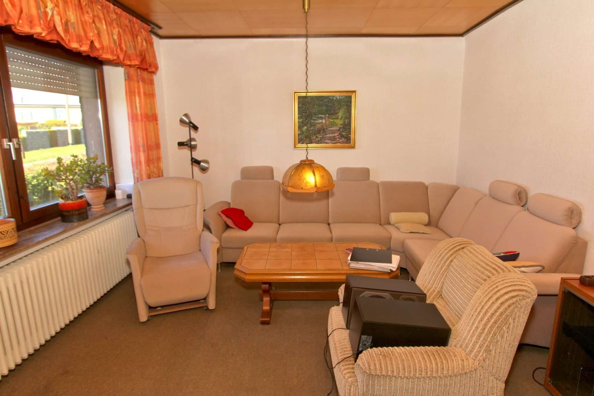 In absolut ruhiger Ortslage wurde im Jahre 1972 das zu verkaufende Wohnhaus in einer Seitenstraße mit erhabener Aussicht erbaut. Das Kellergeschoss ist gemauert und das Erdgeschoss in hochwertiger Fertigbauweise (Fa. Nordhaus) ausgeführt. Die Außenwände des Erdgeschosses sind isoliert. Es verfügt über eine Wohnfläche von ca. 223 m², die sich auf zwei abgeschlossene Wohnungen in Erd- und Kellergeschoss verteilt. Im Erdgeschoss befinden sich der dominierende Wohn-/Essbereich mit Zugang zum geräumigen Balkon, 3 Schlafzimmer, Küche, Bad und WC und im Keller Wohnzimmer, Küche, 2 Schlafzimmer und Bad.