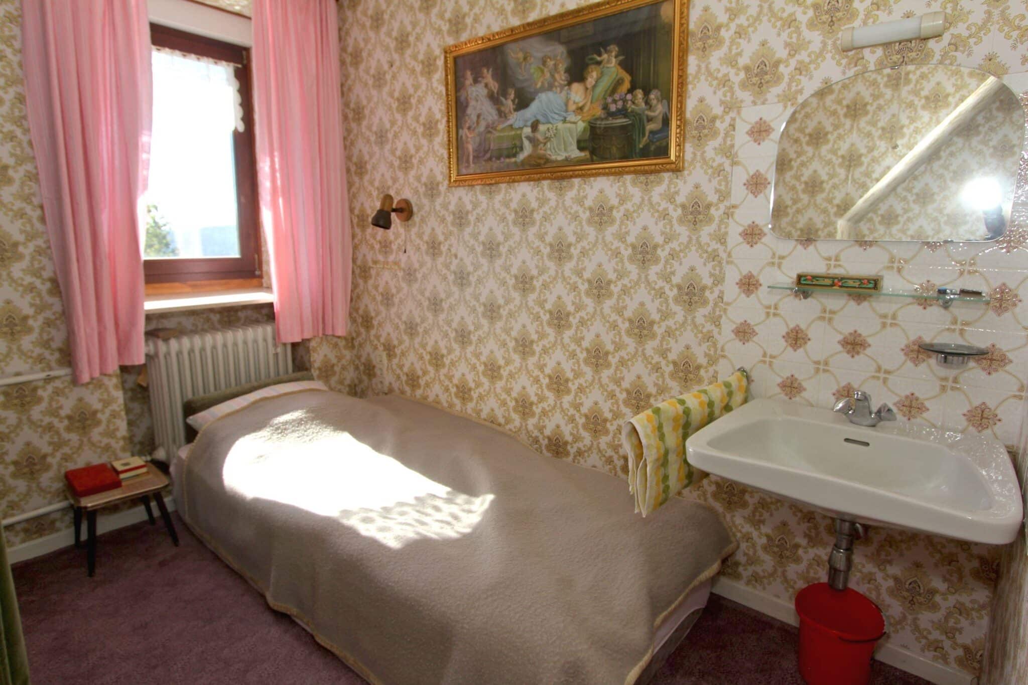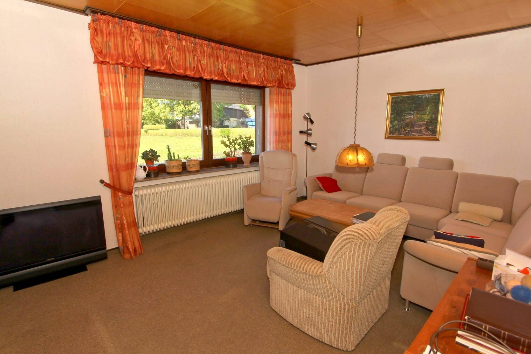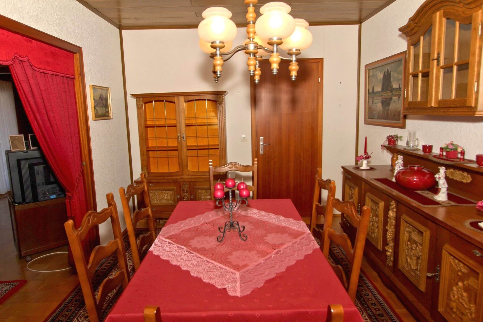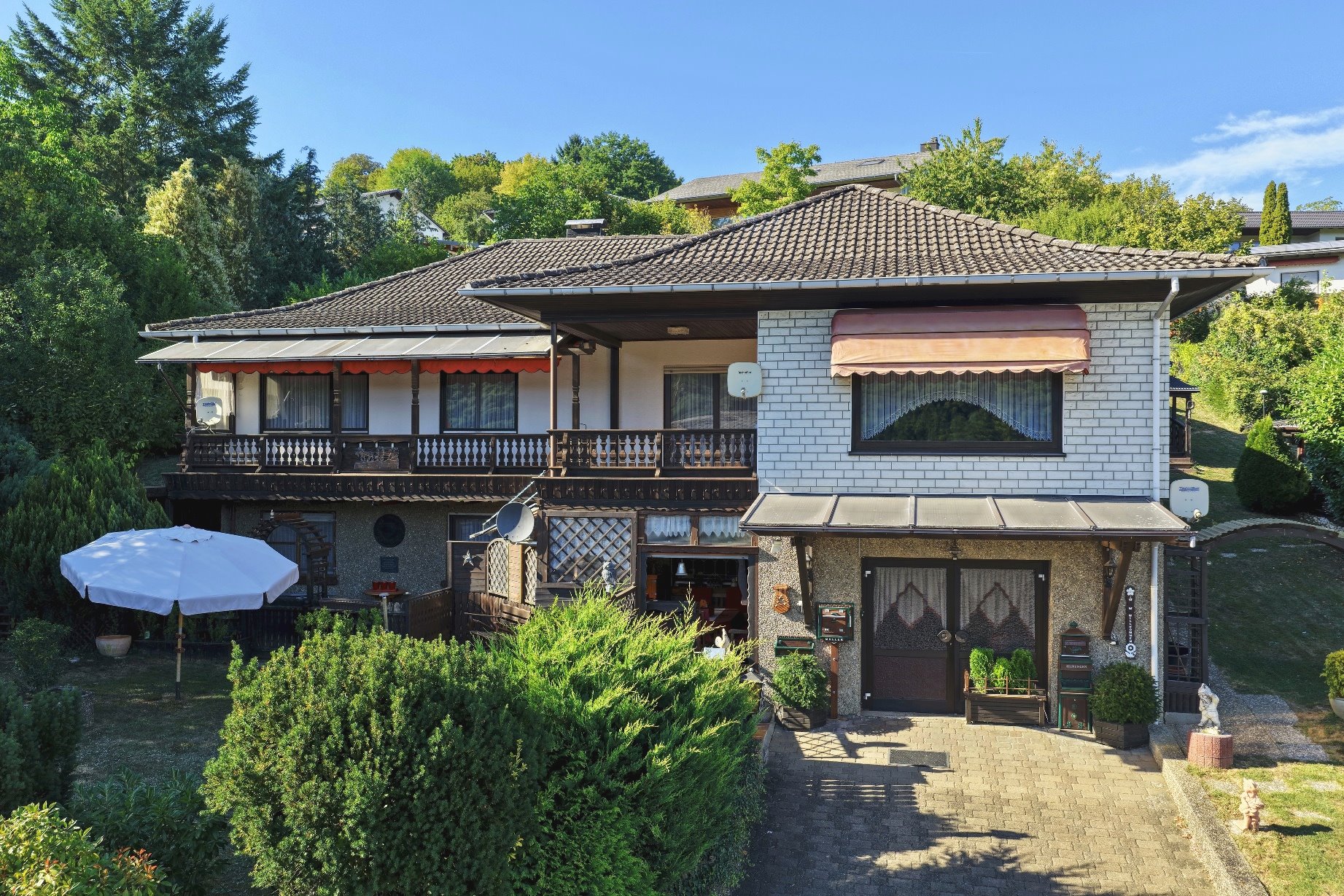 In absolut ruhiger Ortslage wurde im Jahre 1972 das zu verkaufende Wohnhaus in einer Seitenstraße mit erhabener Aussicht erbaut. Das Kellergeschoss ist gemauert und das Erdgeschoss in hochwertiger Fertigbauweise (Fa. Nordhaus) ausgeführt. Die Außenwände des Erdgeschosses sind isoliert. Es verfügt über eine Wohnfläche von ca. 223 m², die sich auf zwei abgeschlossene Wohnungen in Erd- und Kellergeschoss verteilt. Im Erdgeschoss befinden sich der dominierende Wohn-/Essbereich mit Zugang zum geräumigen Balkon, 3 Schlafzimmer, Küche, Bad und WC und im Keller Wohnzimmer, Küche, 2 Schlafzimmer und Bad.