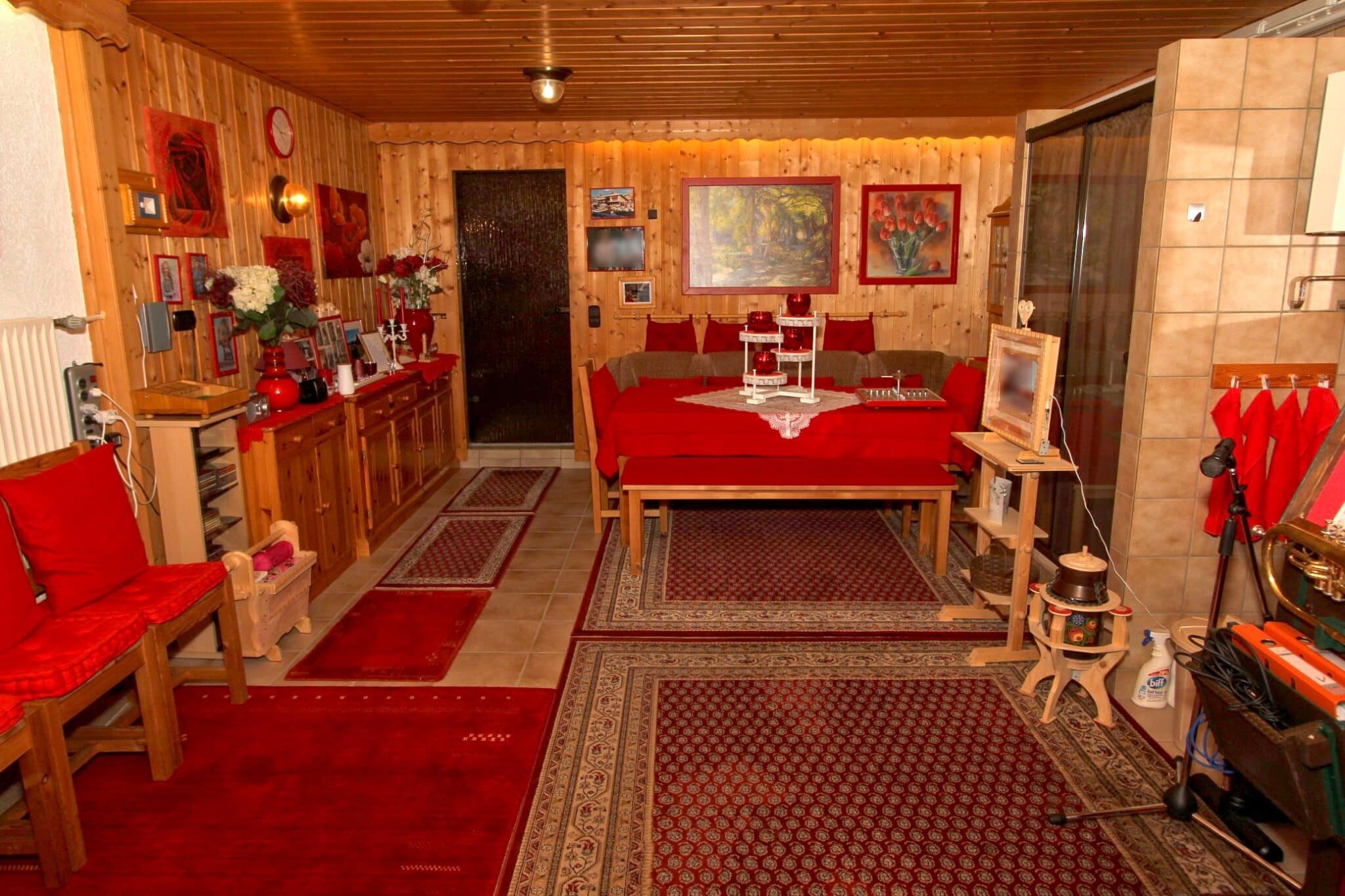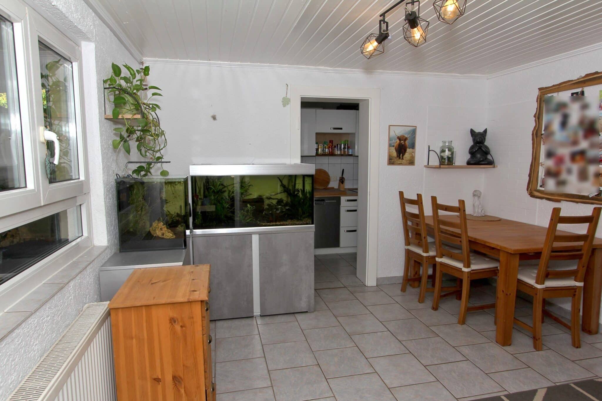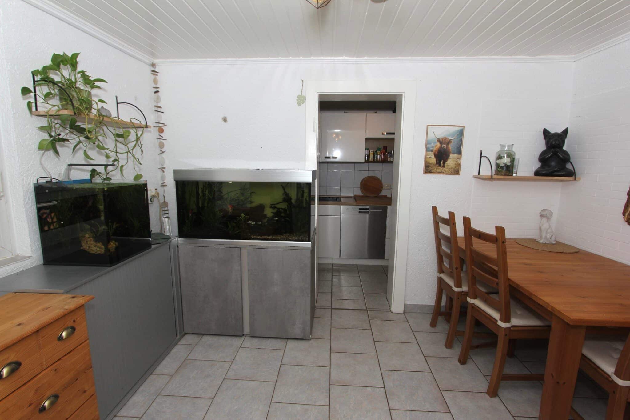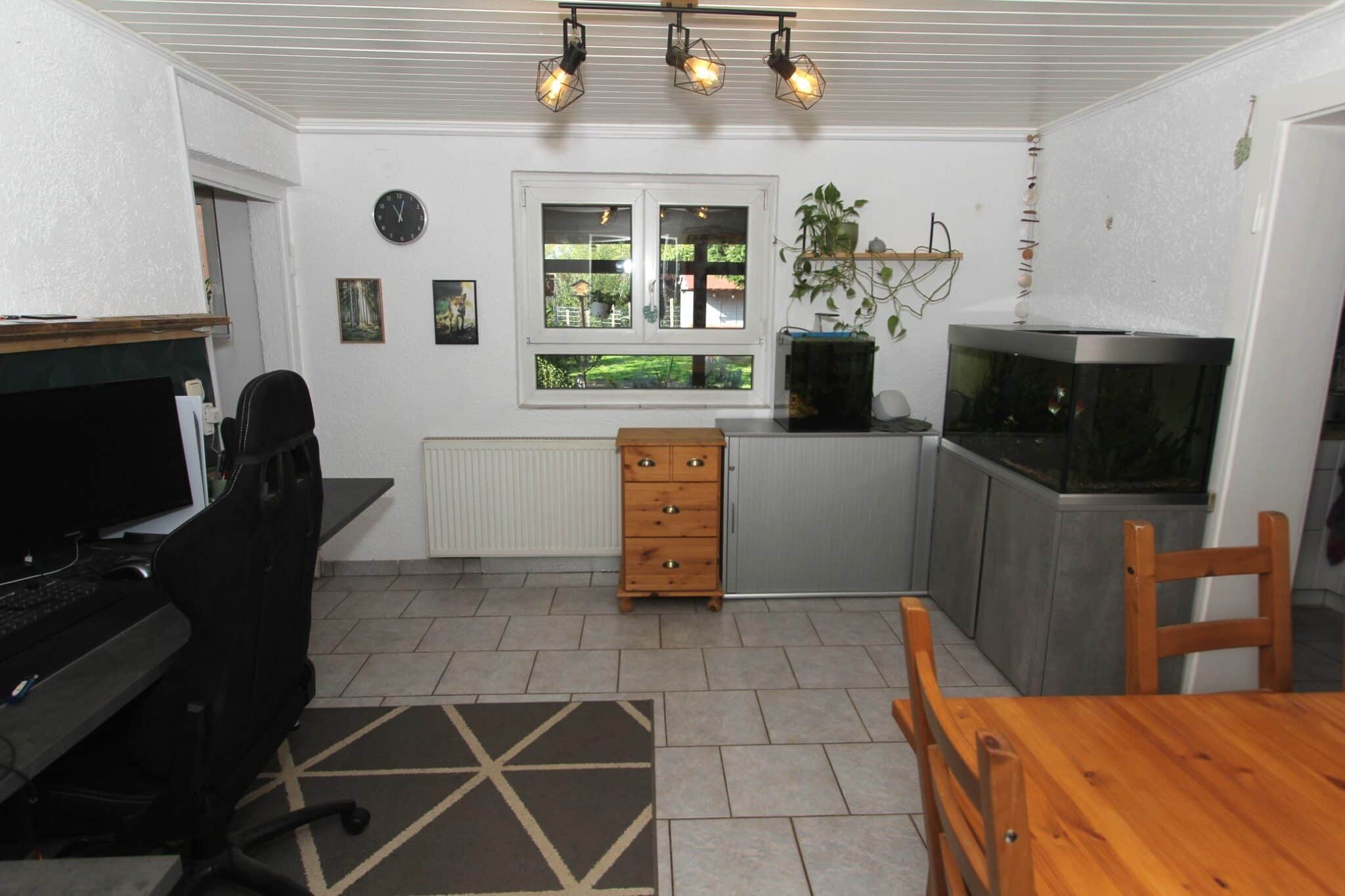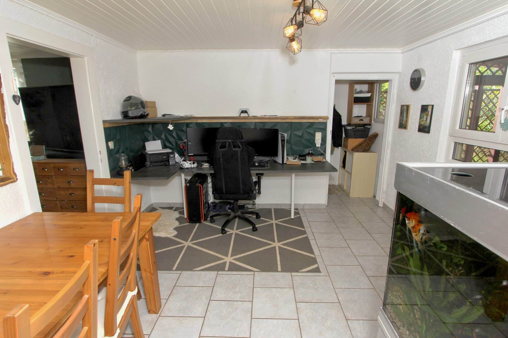 Zusätzlich befinden sich im Kellergeschoss der aus der ehemaligen Garage umgebaute Hobbyraum mit Dusche mit diversen Nutzungsmöglichkeiten, der Vorratsraum sowie der Heizungs- und Tankraum. Rückwärtig angebaut ist die über die gesamte Hausbreite verlaufende überdachte Terrasse. Über eine Bodeneinschubtreppe gelangt man zum gedämmten Dachboden.