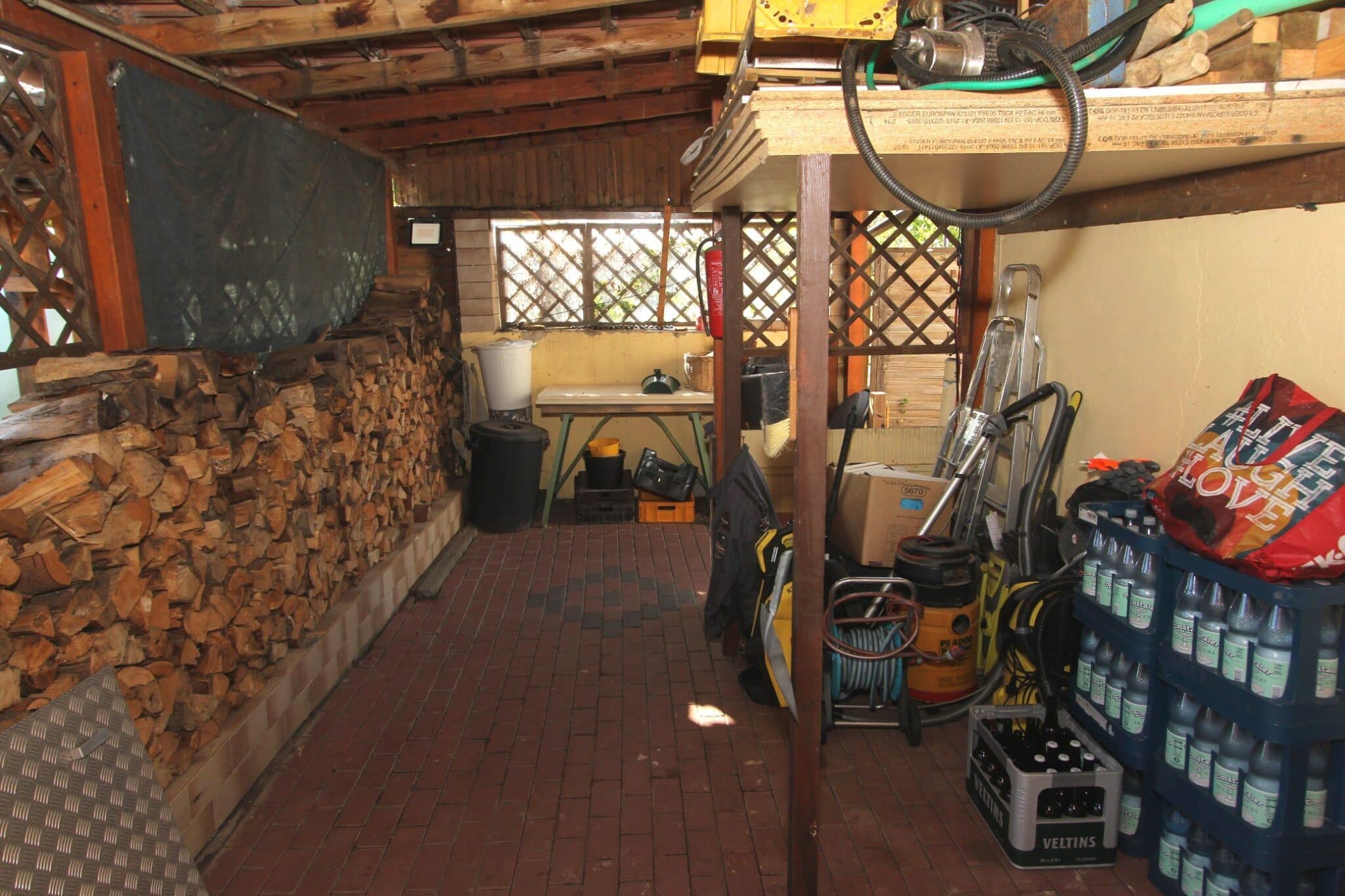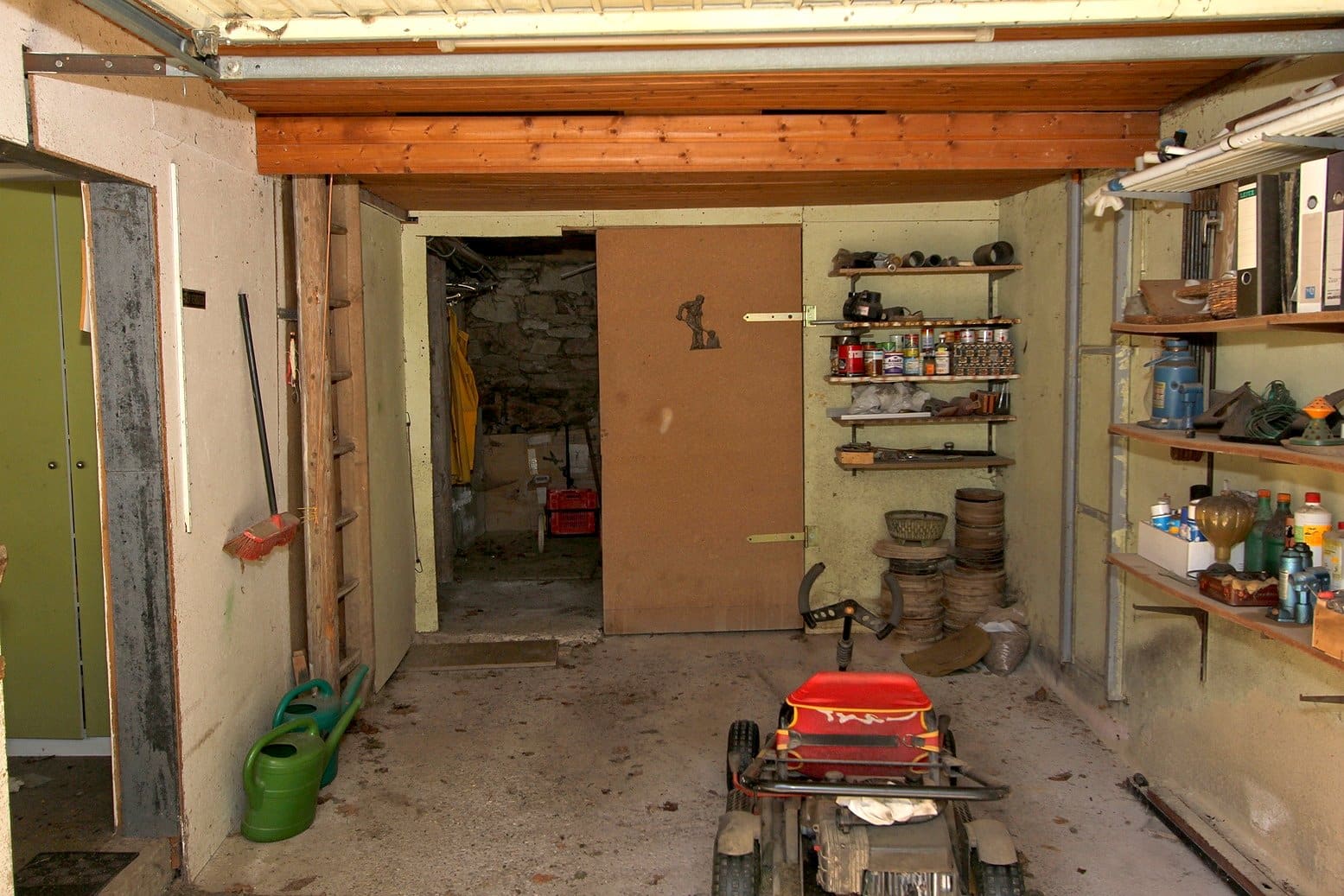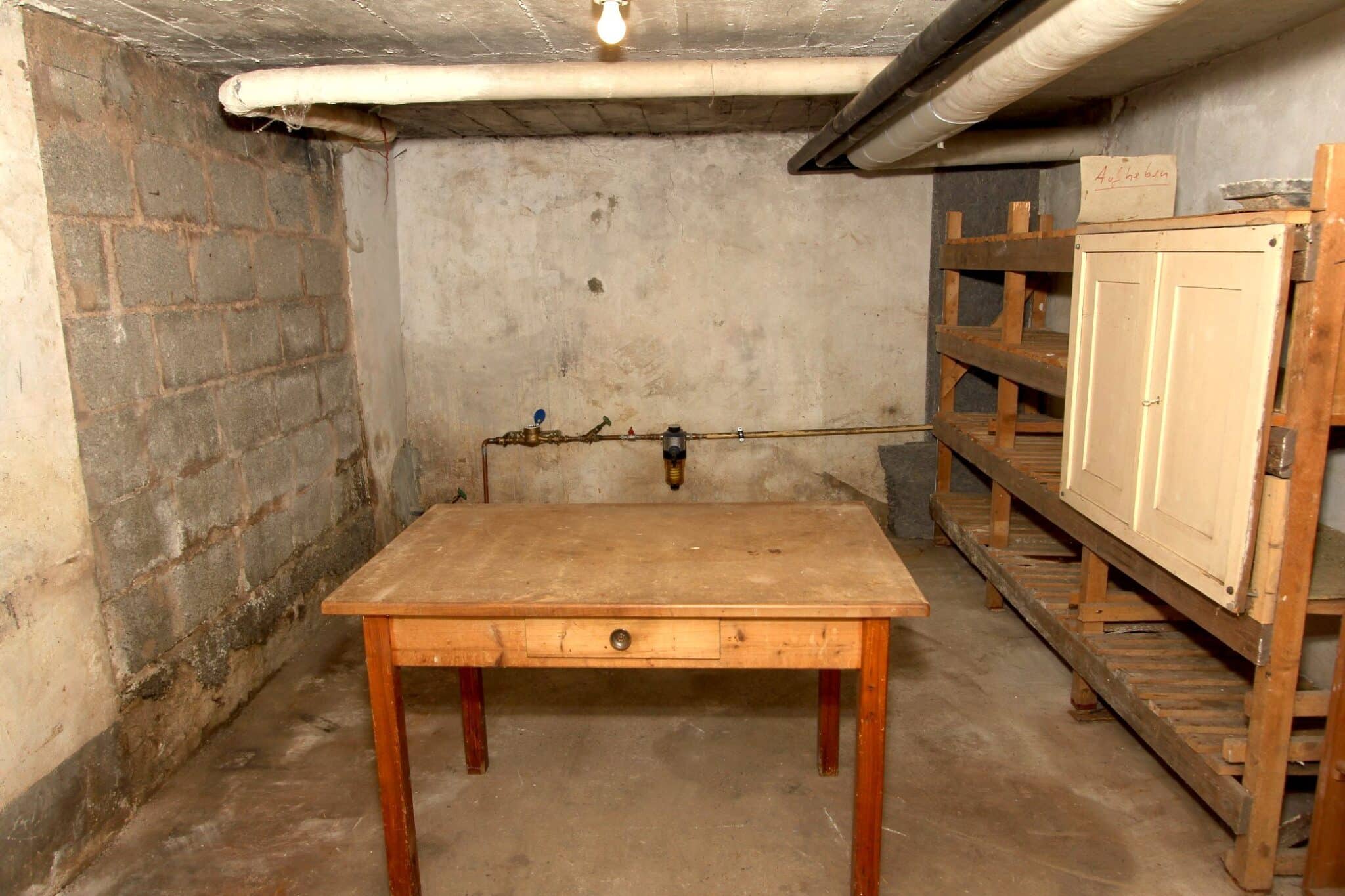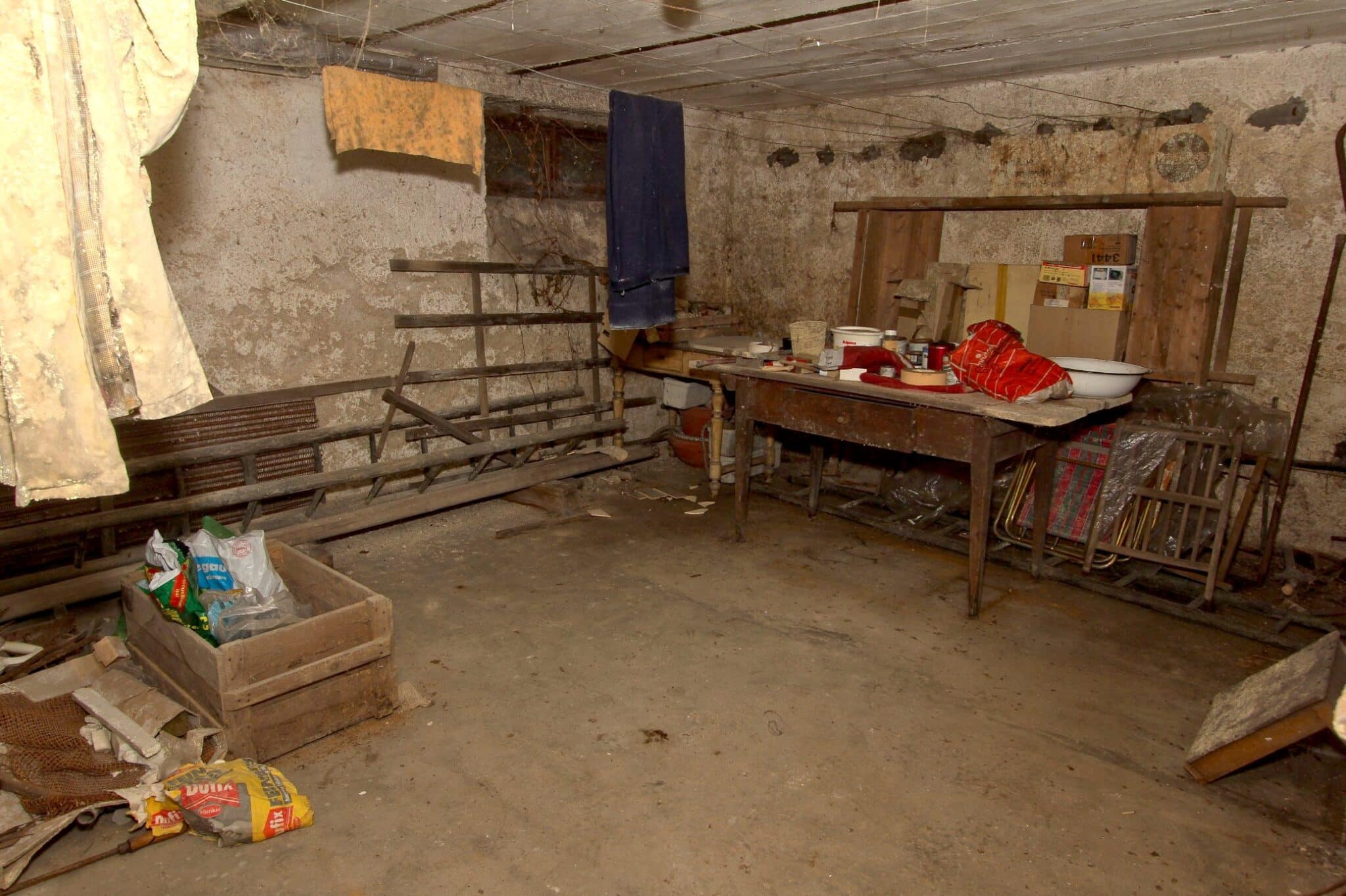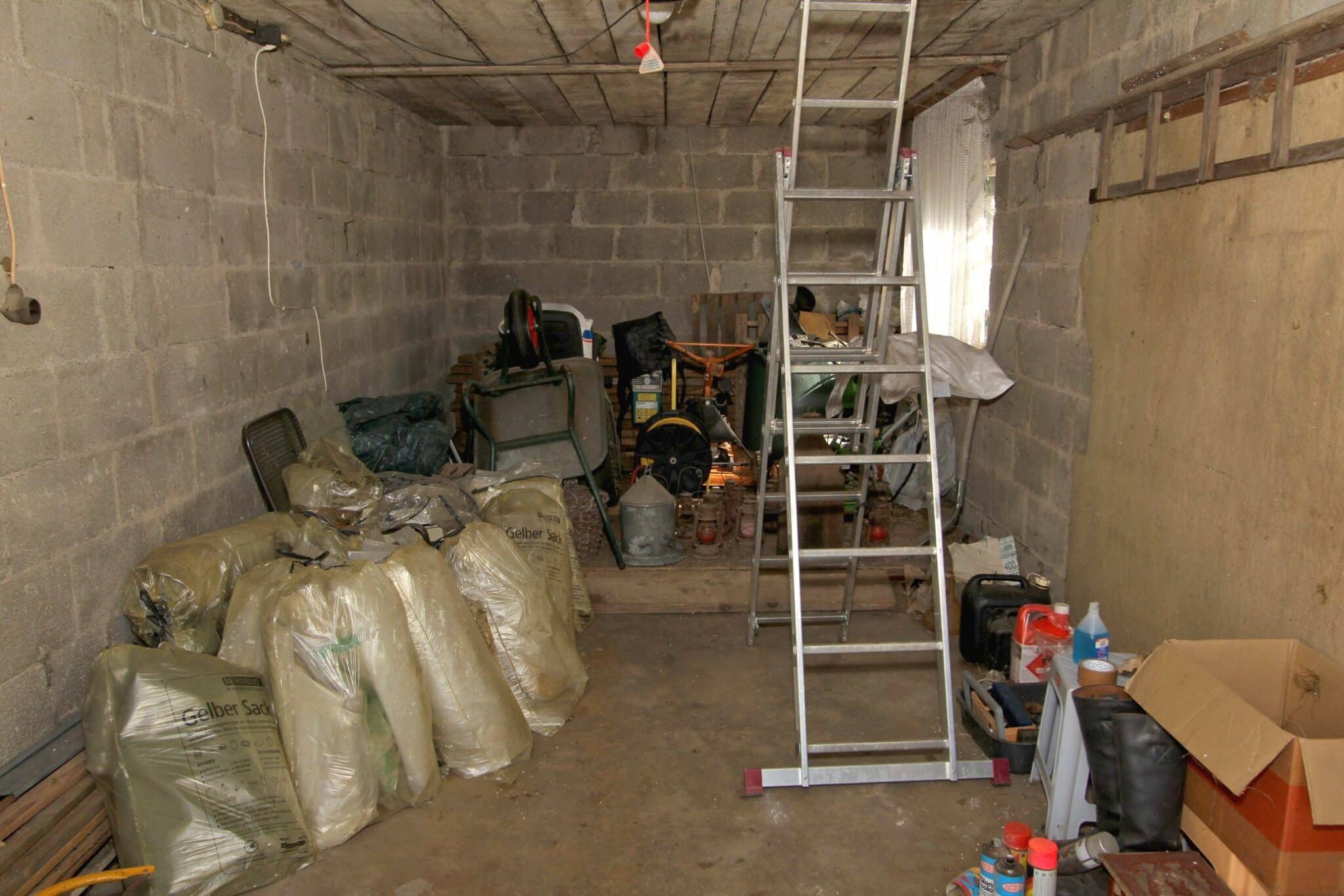 Die Werkstatt ist durch einen separaten Eingang von außen zu betreten, ebenso der Heizungs- und Waschraum. Von der Werkstatt führt eine Bodeneinschubtreppe zum Dachboden, der für Lagerzwecke verwendet werden kann. Das Haus ist teilunterkellert.