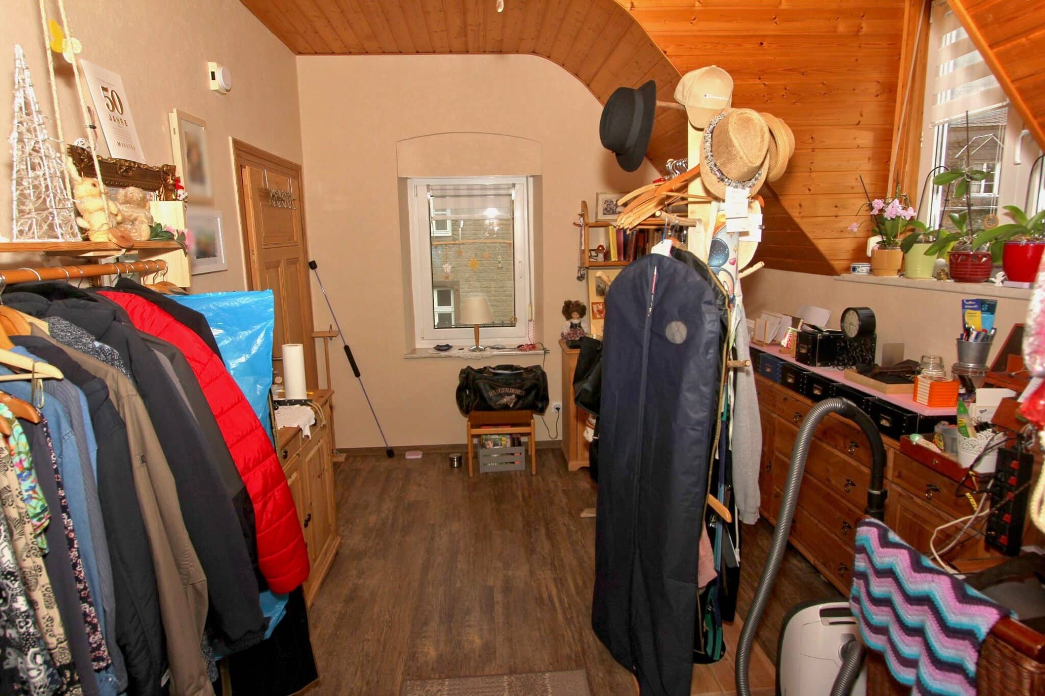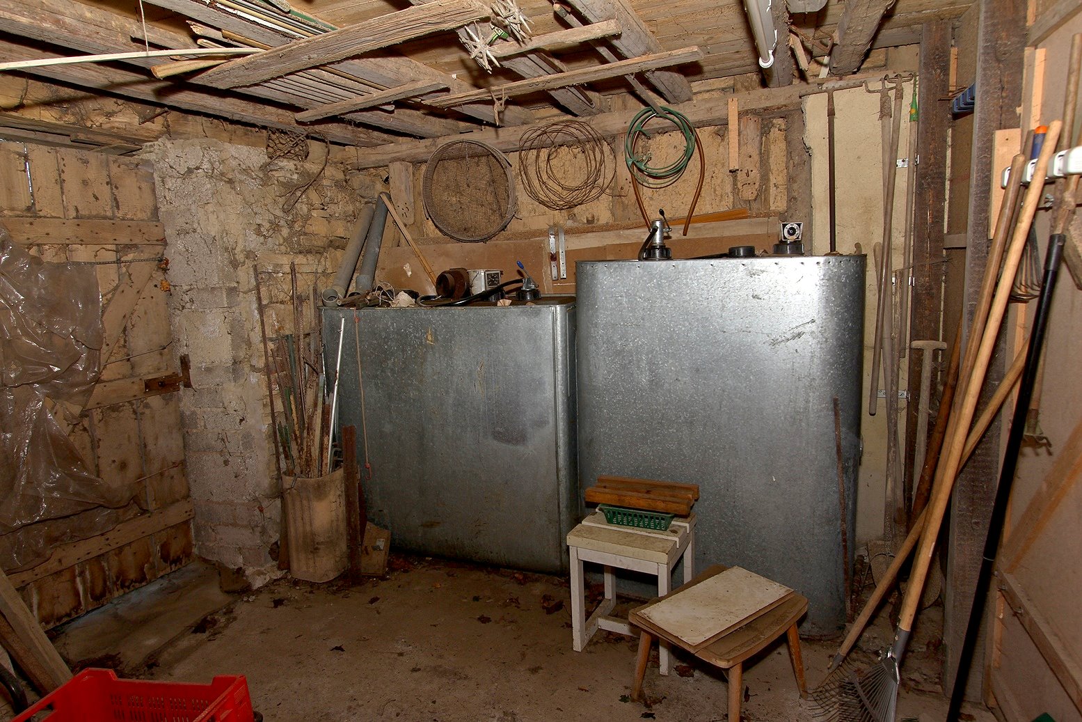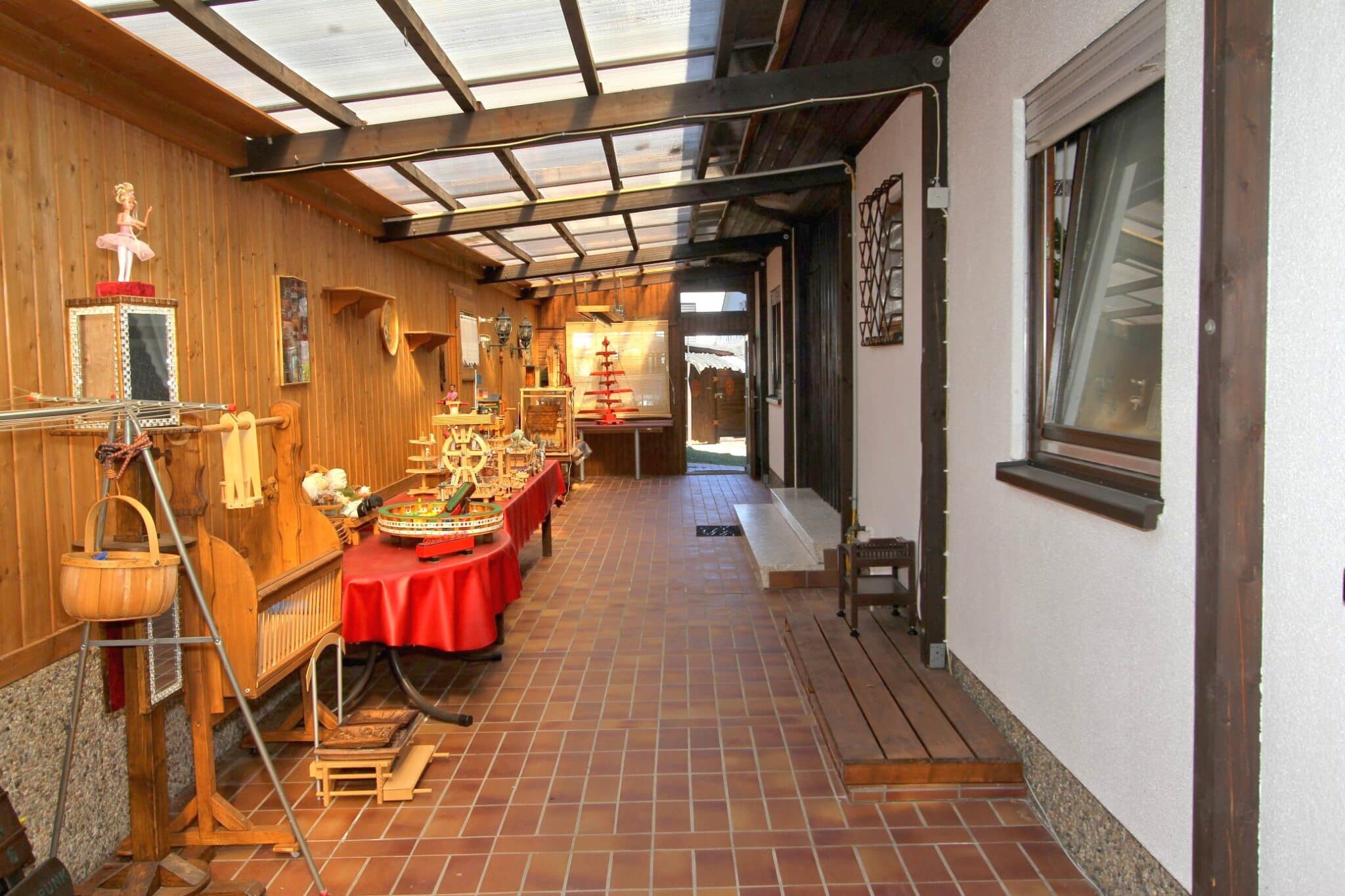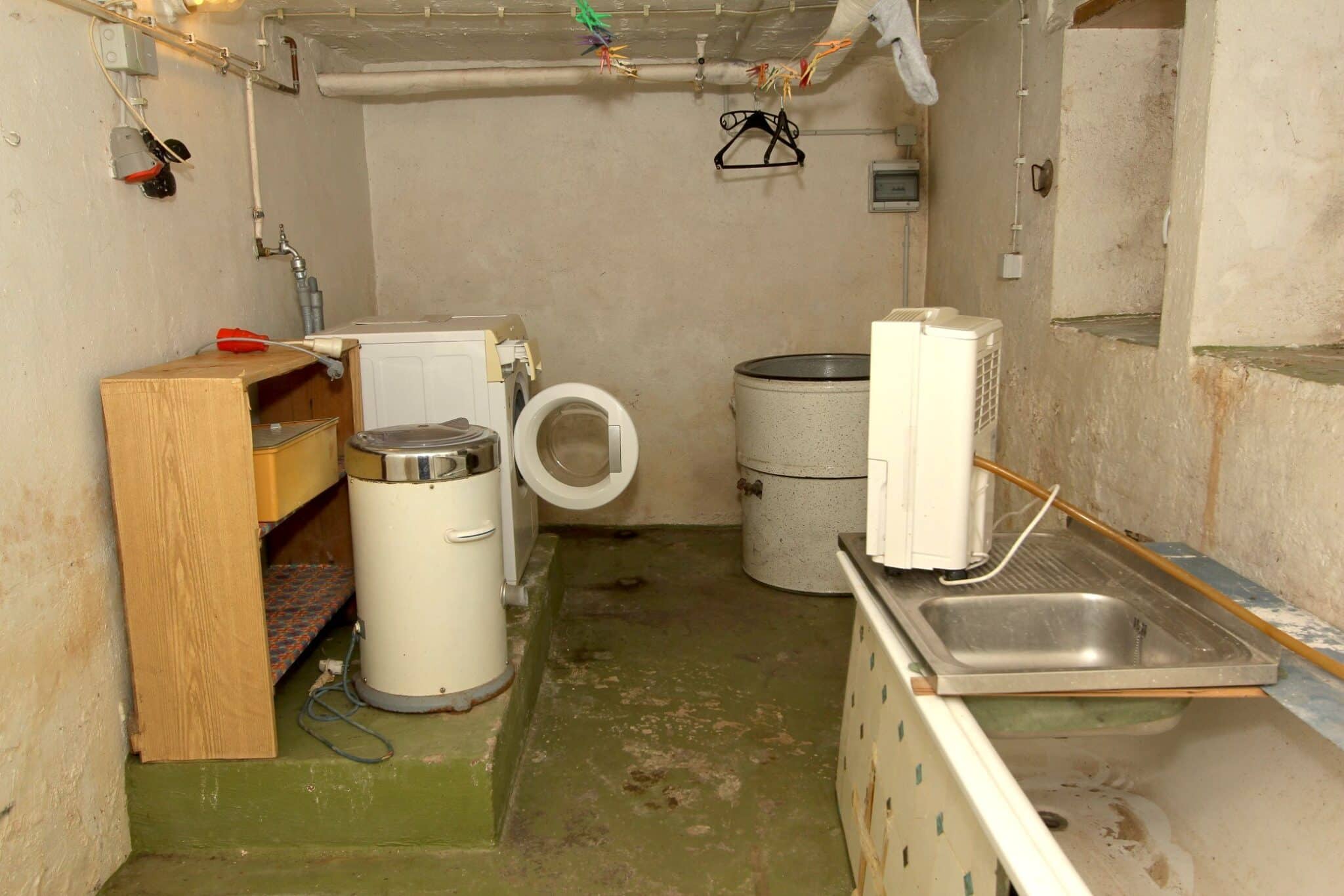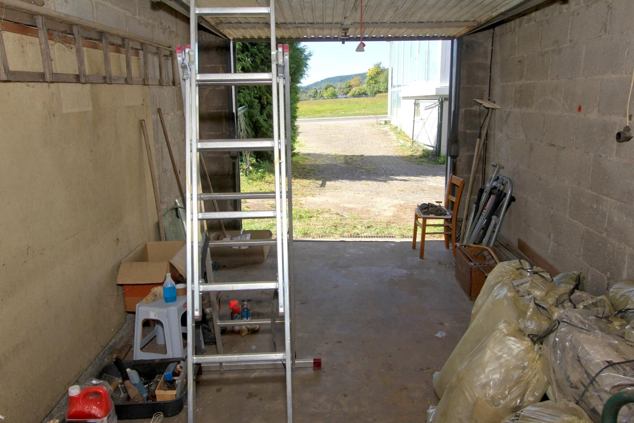 Die Werkstatt ist durch einen separaten Eingang von außen zu betreten, ebenso der Heizungs- und Waschraum. Von der Werkstatt führt eine Bodeneinschubtreppe zum Dachboden, der für Lagerzwecke verwendet werden kann. Das Haus ist teilunterkellert.