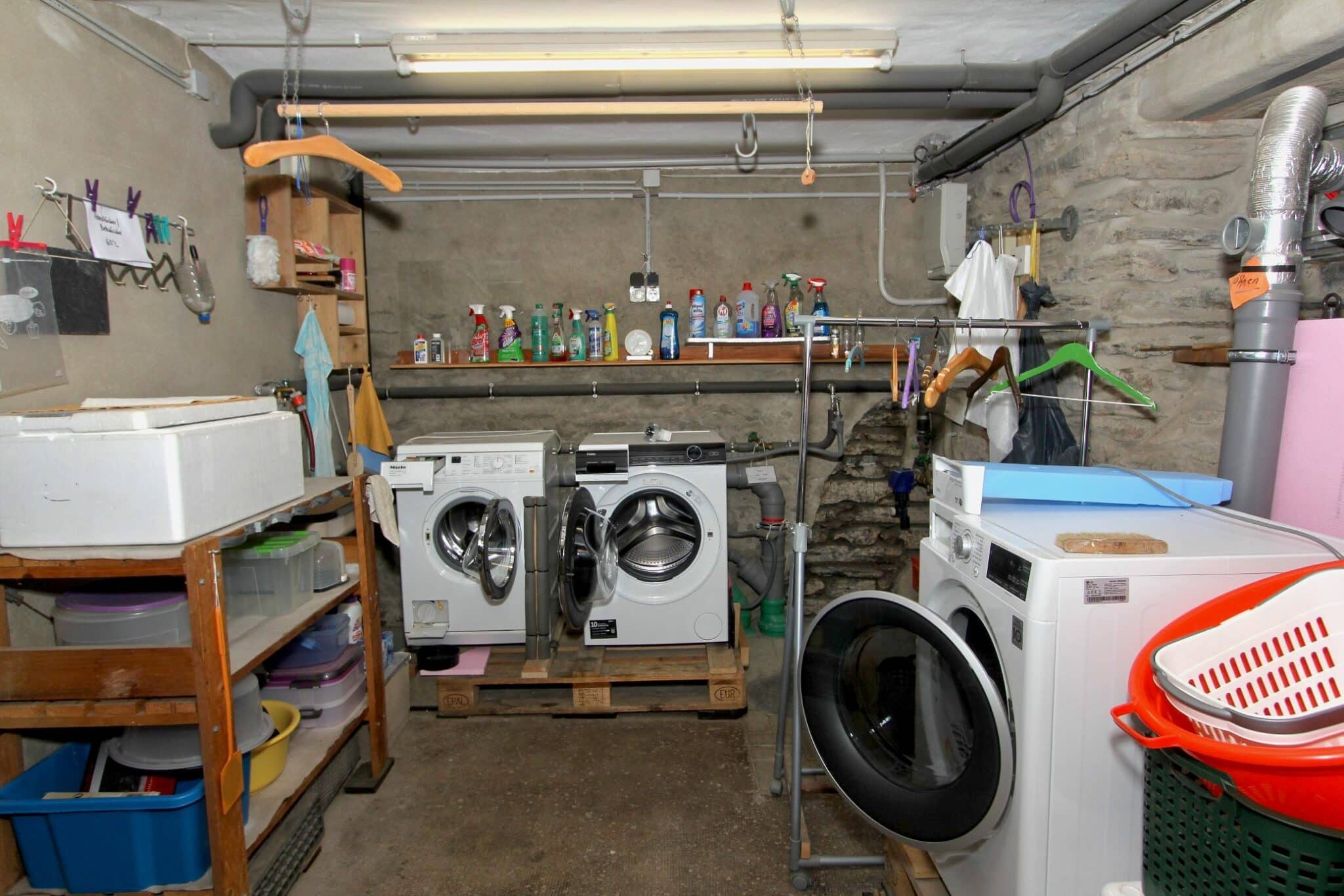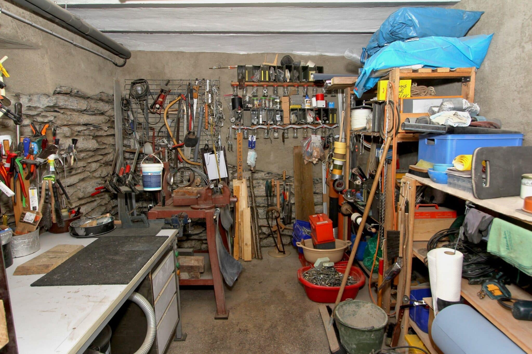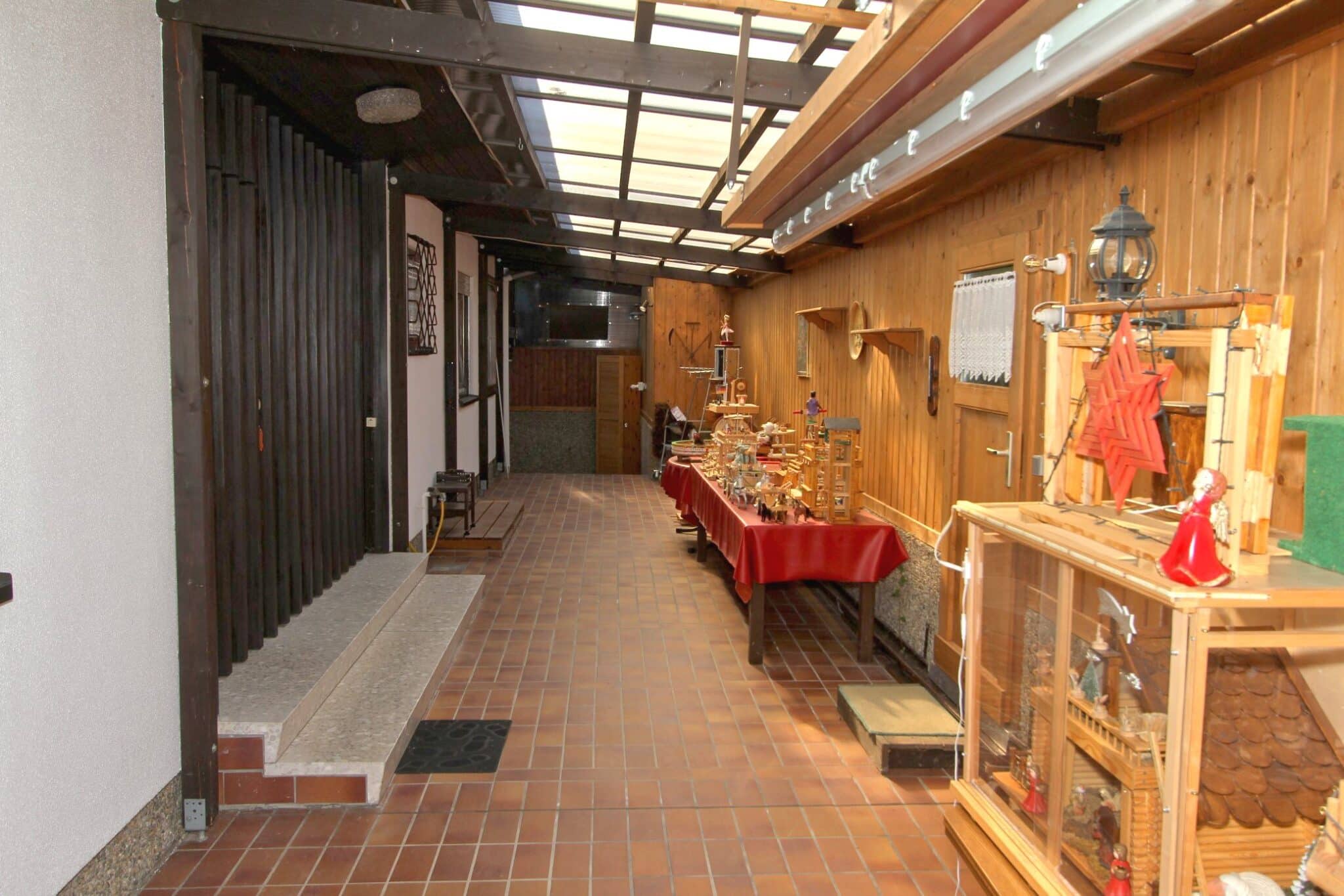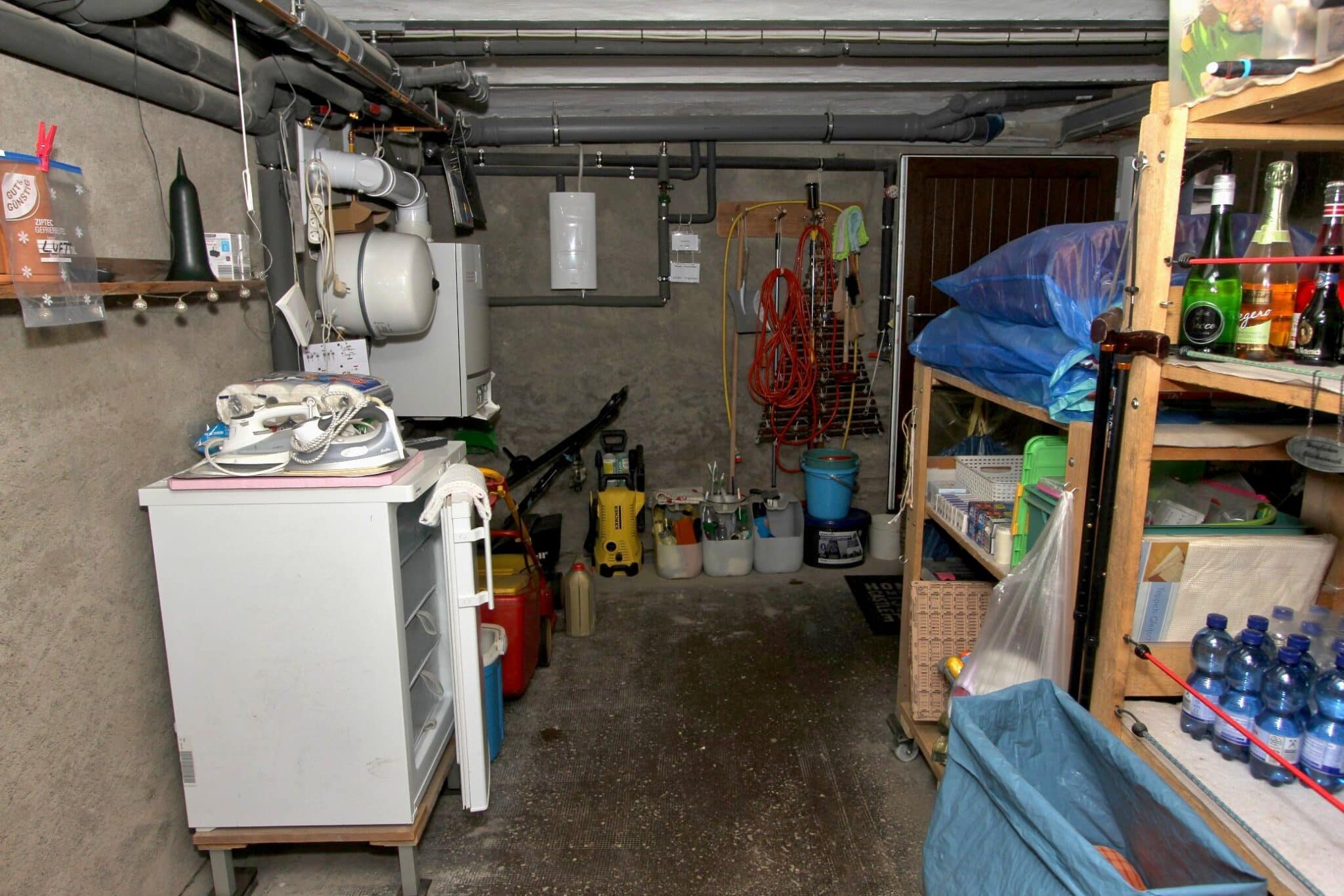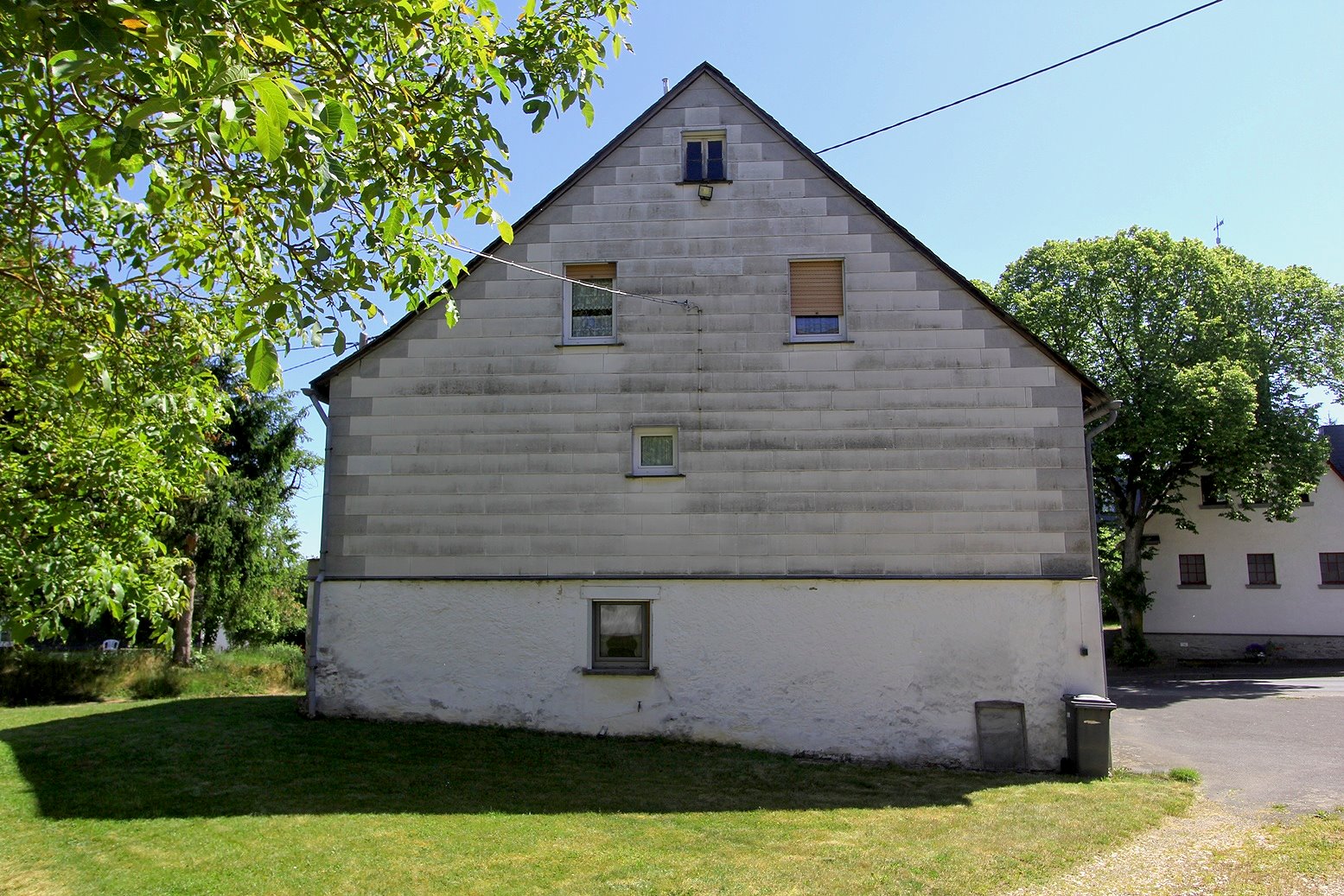 Die Werkstatt ist durch einen separaten Eingang von außen zu betreten, ebenso der Heizungs- und Waschraum. Von der Werkstatt führt eine Bodeneinschubtreppe zum Dachboden, der für Lagerzwecke verwendet werden kann. Das Haus ist teilunterkellert.