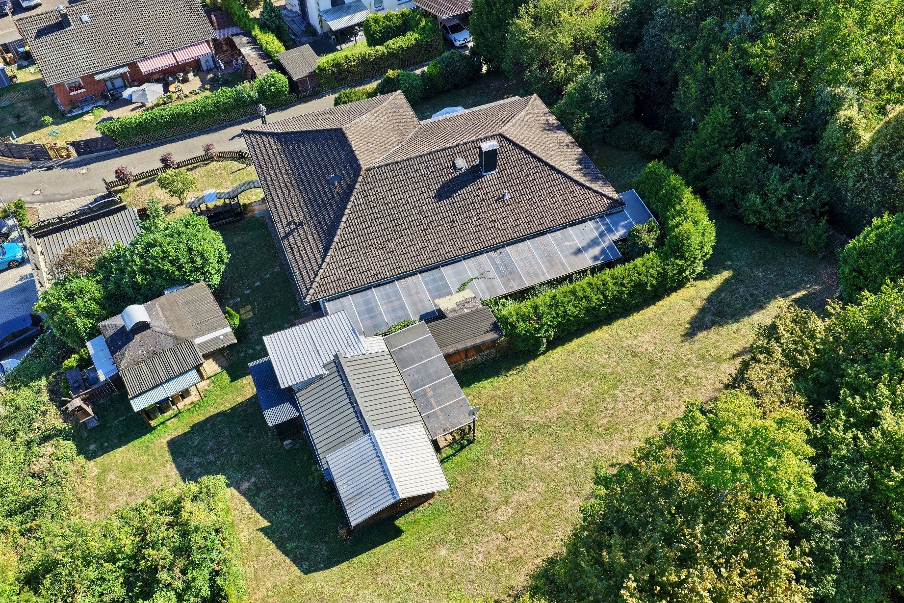 Das großzügige Grundstück bietet eine gelungene Kombination aus Privatsphäre, Weite und vielfältigen Nutzungsmöglichkeiten. Der liebevoll angelegte Garten lädt mit seinen gepflegten Grünflächen und Anpflanzungen zum Entspannen und Verweilen ein. Die weitläufige Rasenfläche schafft Platz für Spiel und Freizeit, während die gemütliche Terrasse den idealen Rückzugsort im Grünen darstellt.