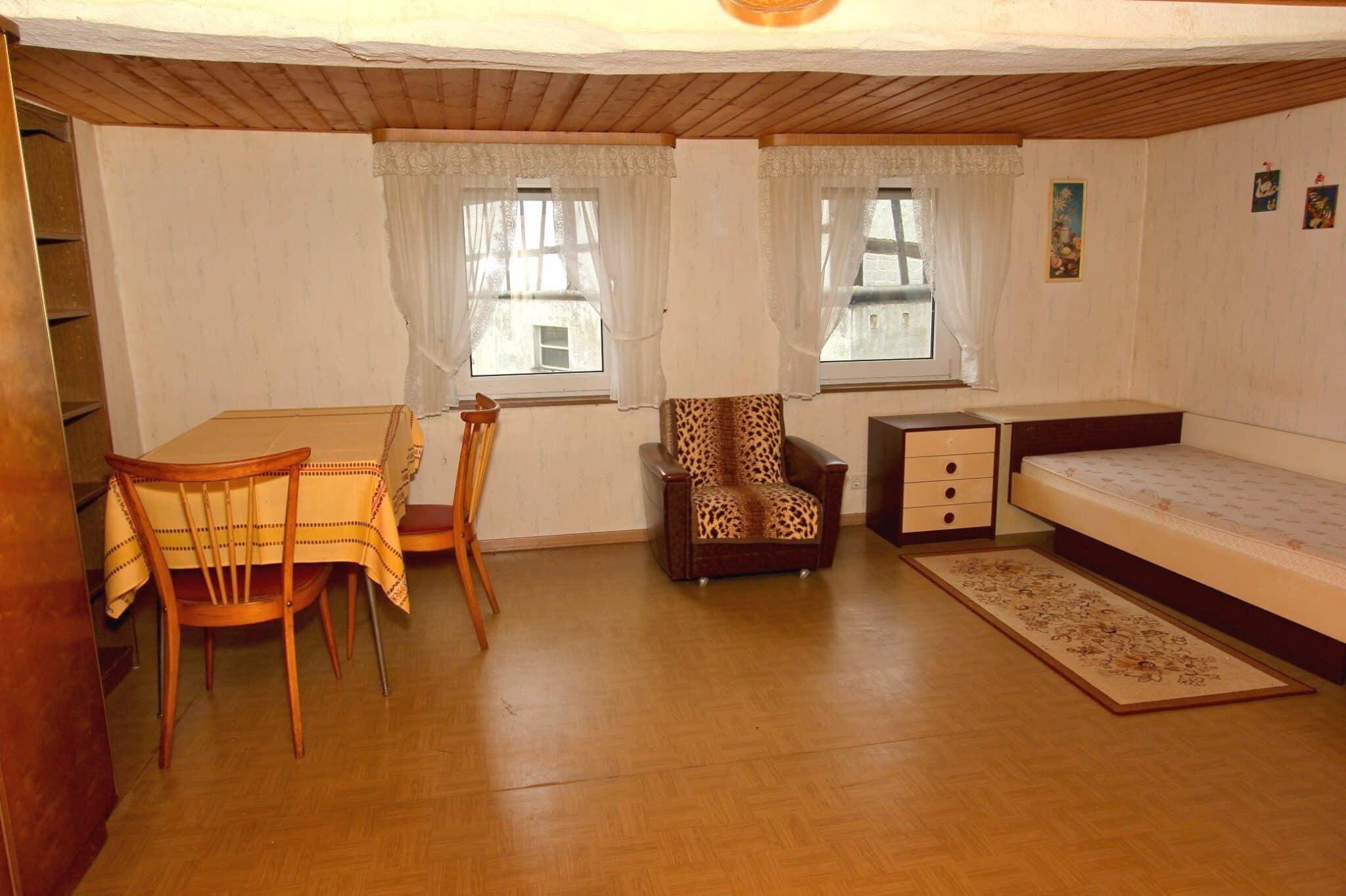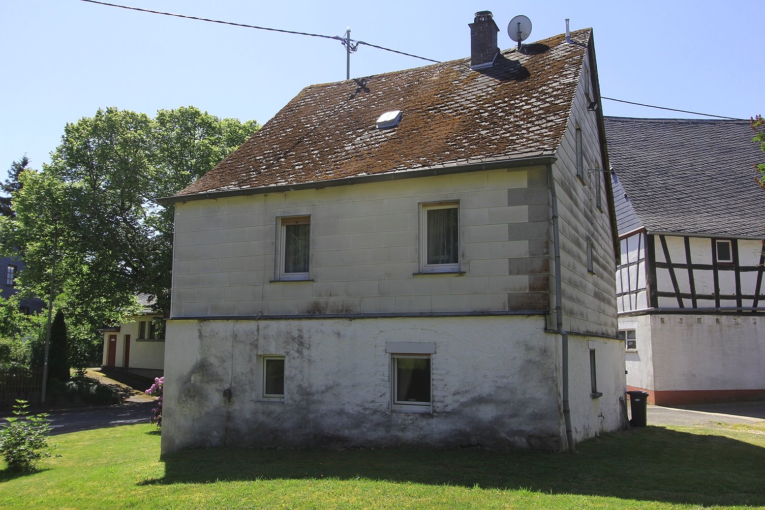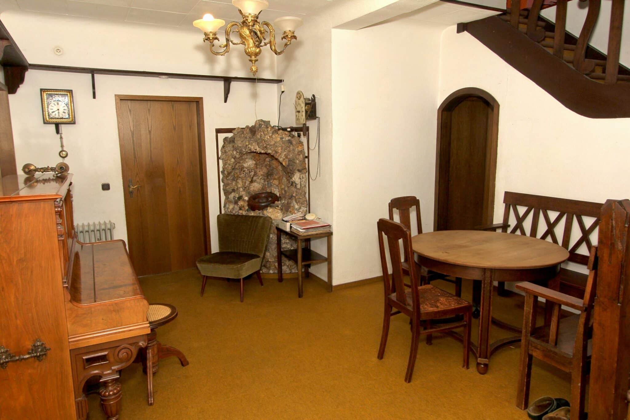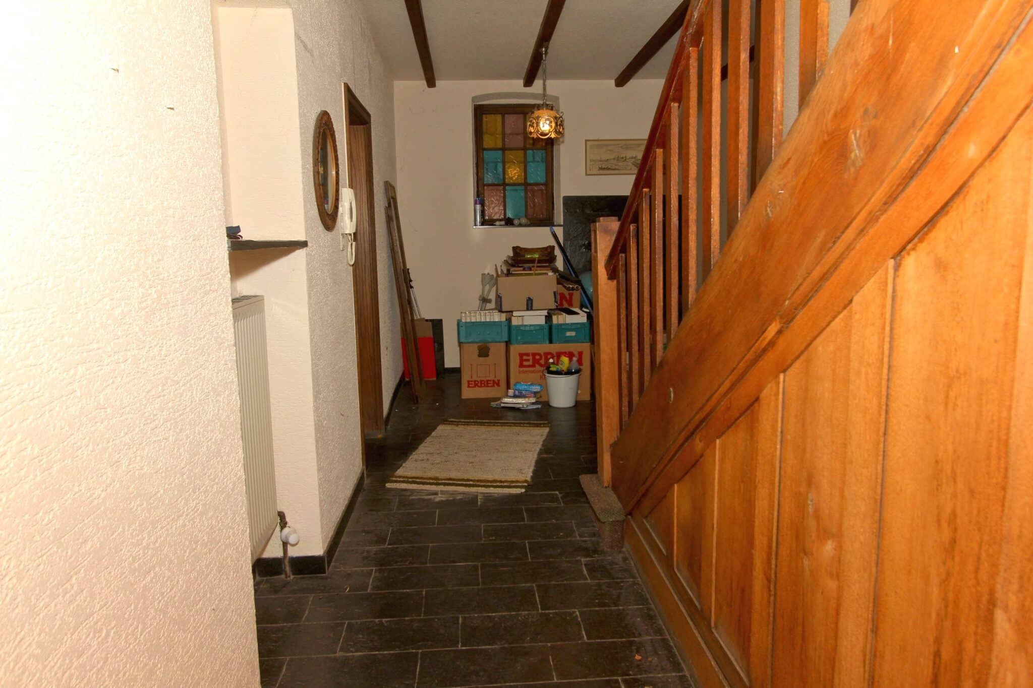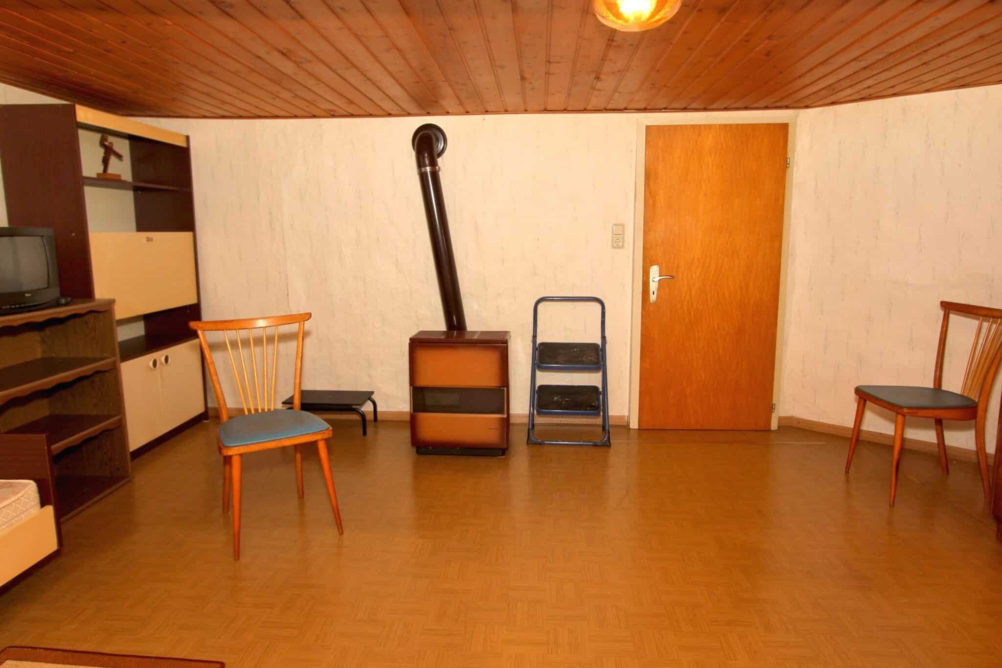 Die Beheizung erfolgt mit drei Einzelöfen (Öl und Kohle). Das Dach ist mit Naturschiefer eingedeckt. Den renovierungsbedürftigen Zustand der Immobilie entnehmen Sie bitte den Beschreibungsfotos.
