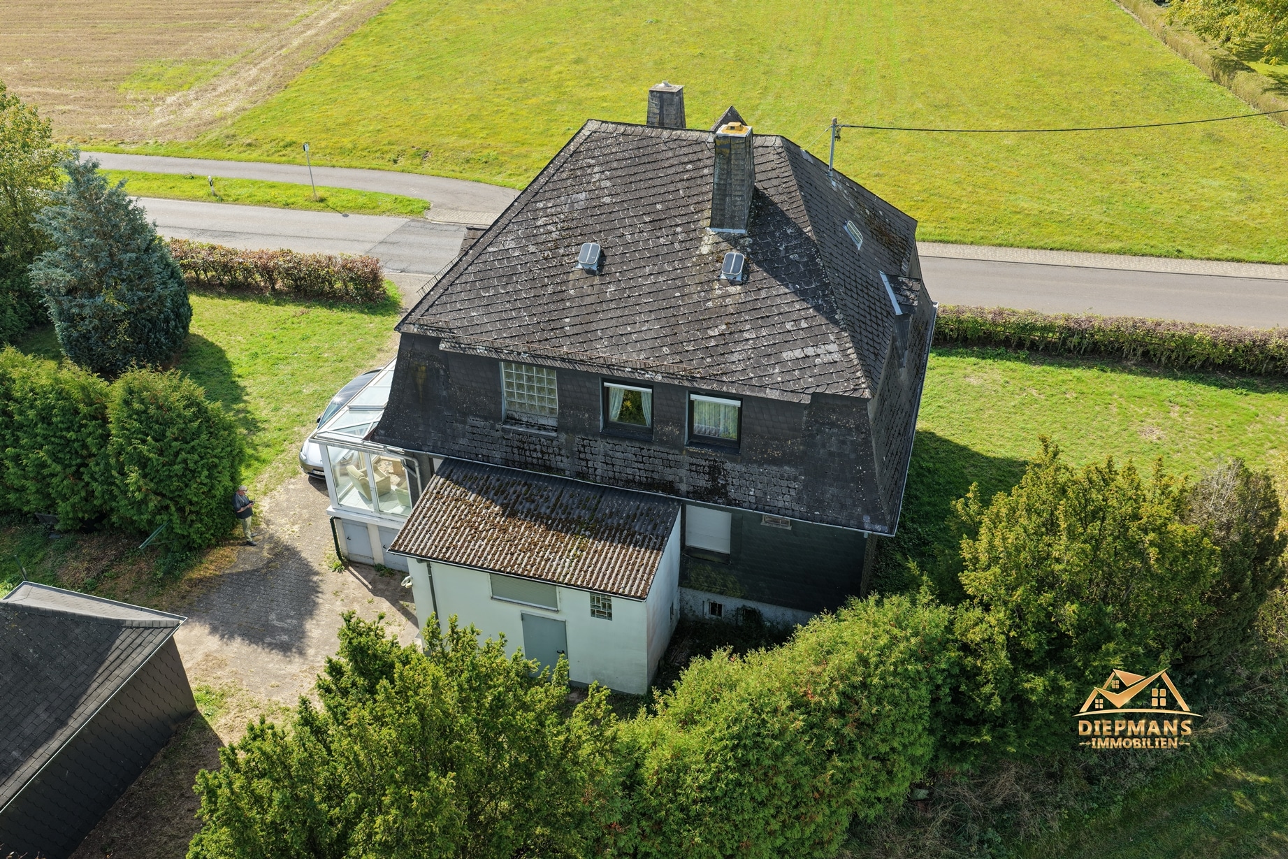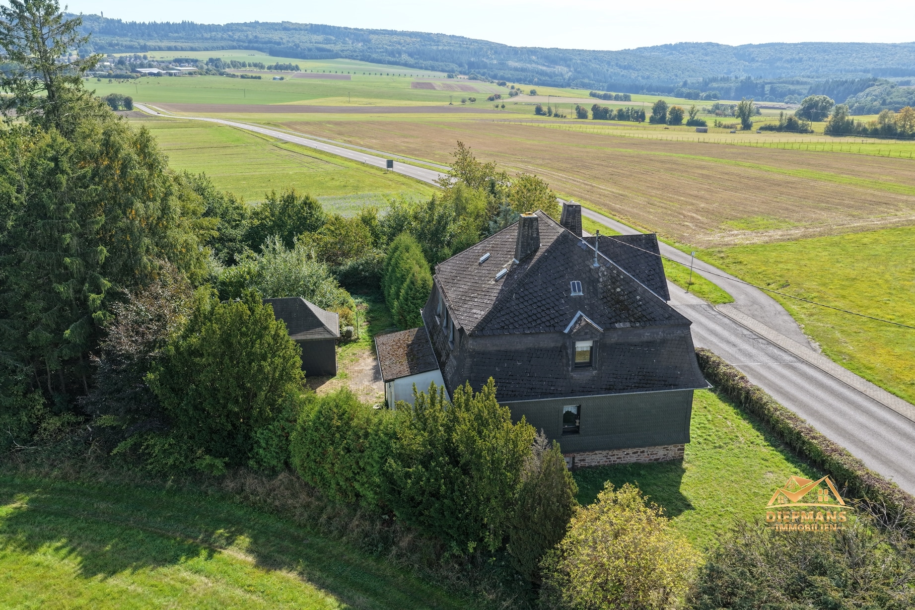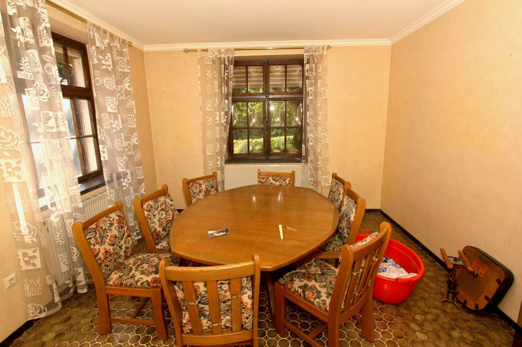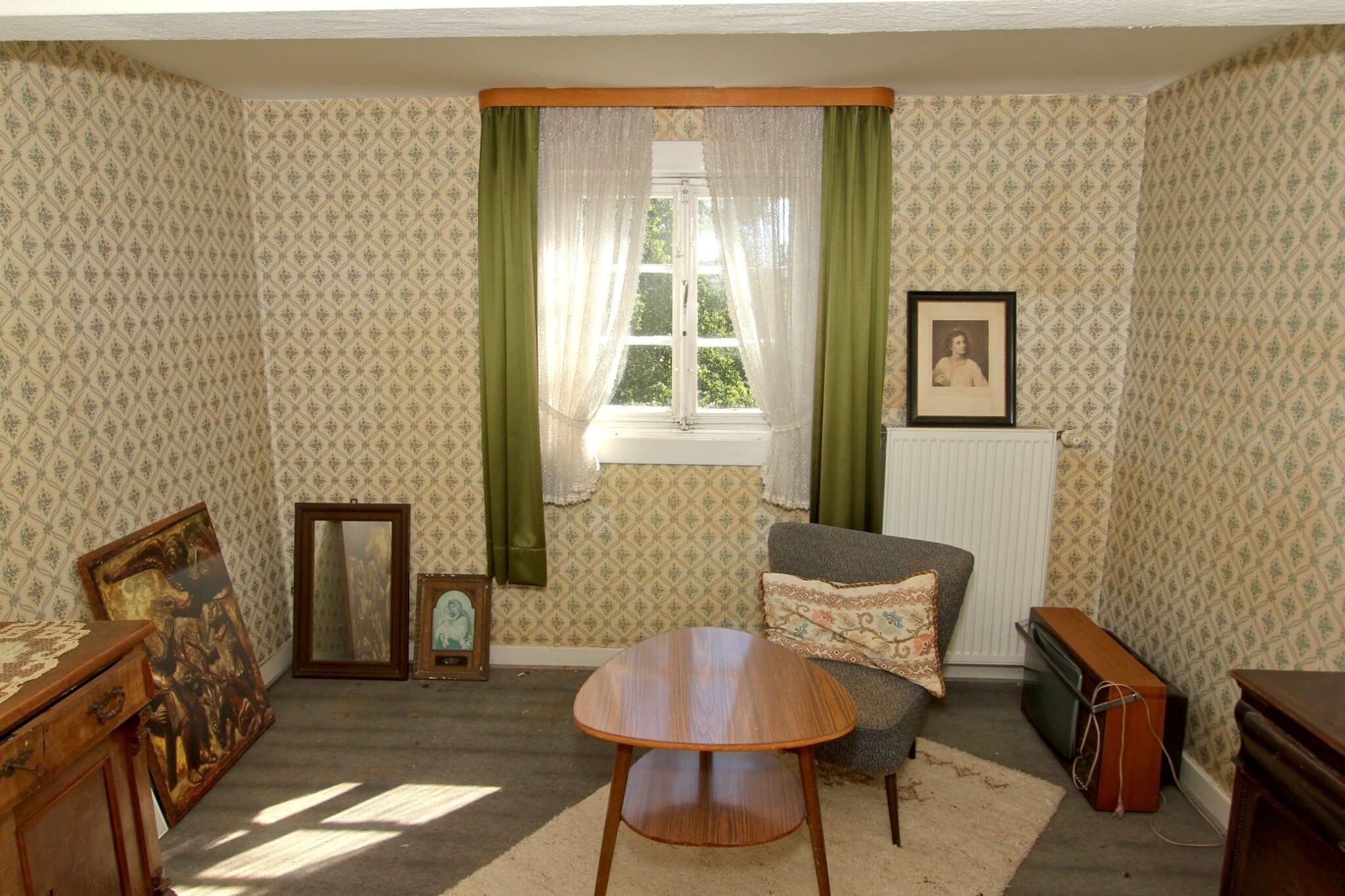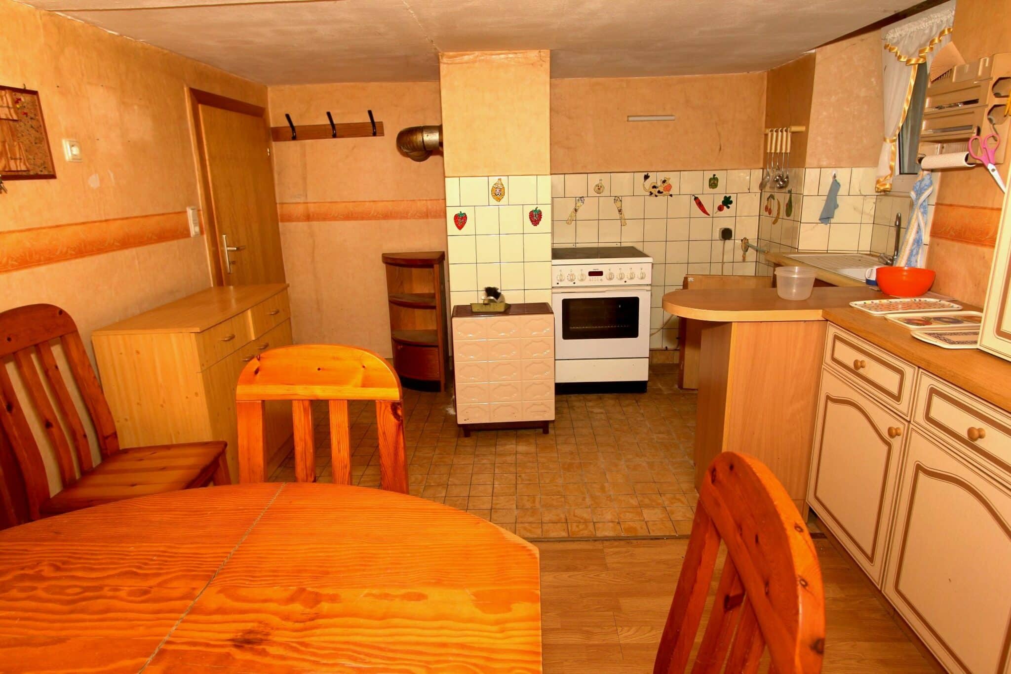 Die Beheizung erfolgt mit drei Einzelöfen (Öl und Kohle). Das Dach ist mit Naturschiefer eingedeckt. Den renovierungsbedürftigen Zustand der Immobilie entnehmen Sie bitte den Beschreibungsfotos.