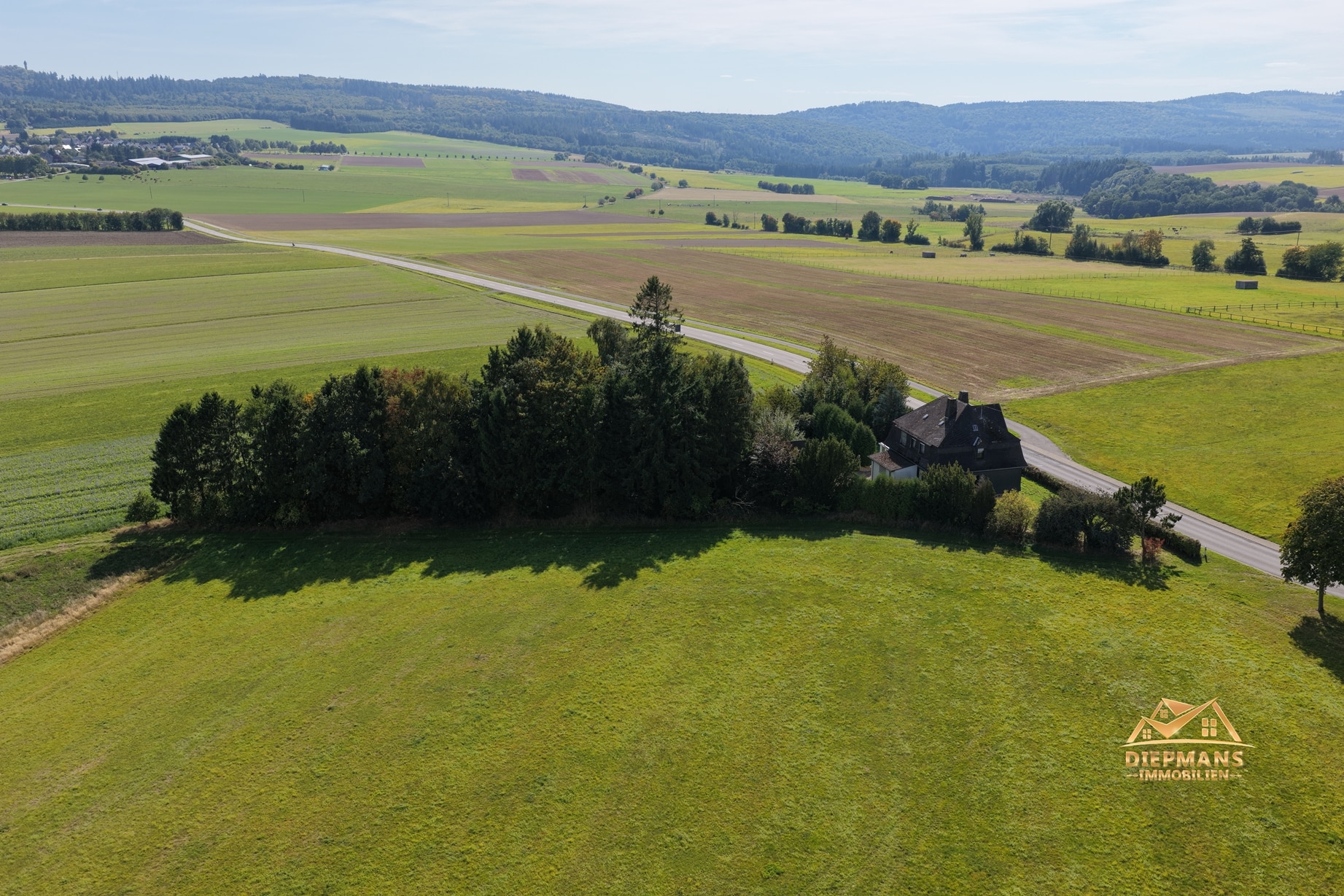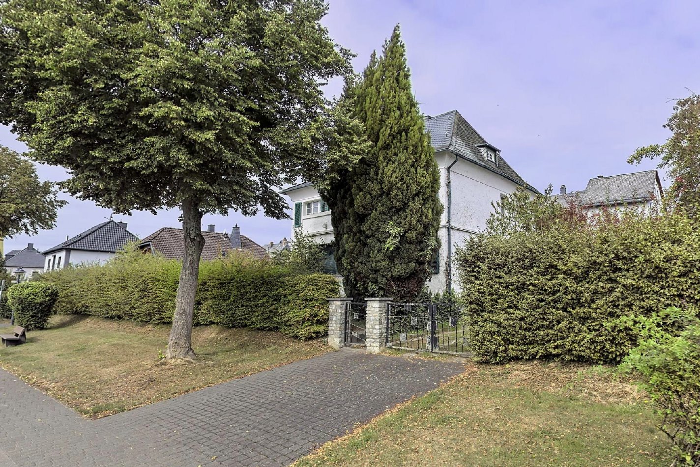 Die Villa liegt auf einem weitläufigen, überwiegend bewaldeten Grundstück, das den Charakter eines kleinen Parks besitzt, jedoch durchforstet werden müsste. Auf einer Fläche von 3038 m² öffnet sich der Weitblick über die faszinierende Naturlandschaft des Hunsrücks. Alte Bäume und Sträucher bilden den grünen Rahmen des Grundstücks – ihre hohen Kronen spenden im Sommer Schatten und lassen im Winter das milde Sonnenlicht hindurch. Der Bestand ist gewachsen, nicht gepflanzt – ein Stück gewachsene Natur, das dem Ort seine besondere Atmosphäre verleiht. Im vorderen Bereich, das Haus umgebend, geht der Baumbestand in eine lichtdurchflutete Wiesenfläche über.