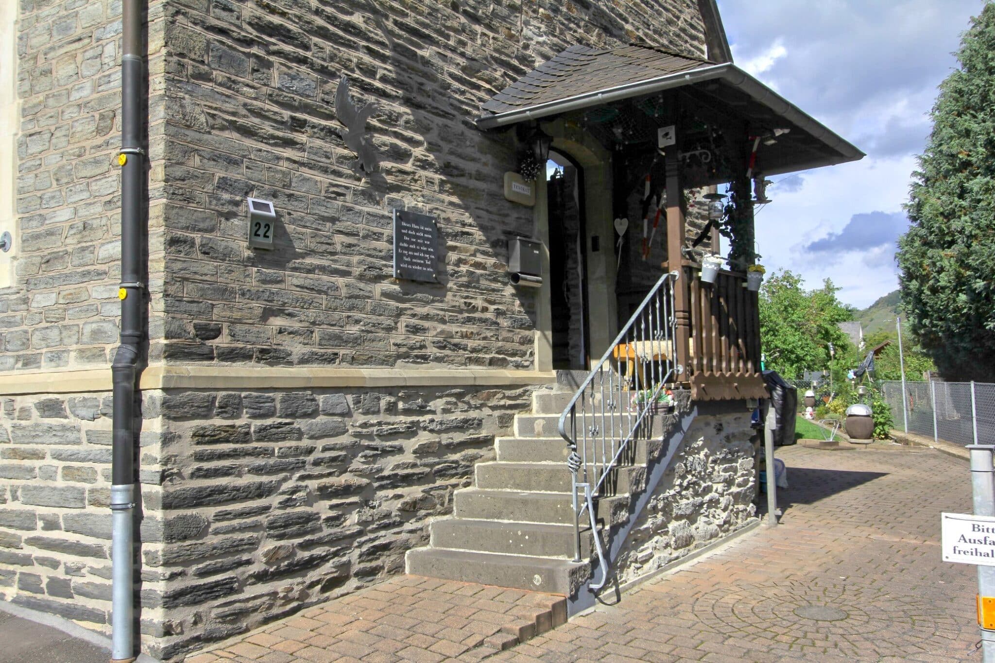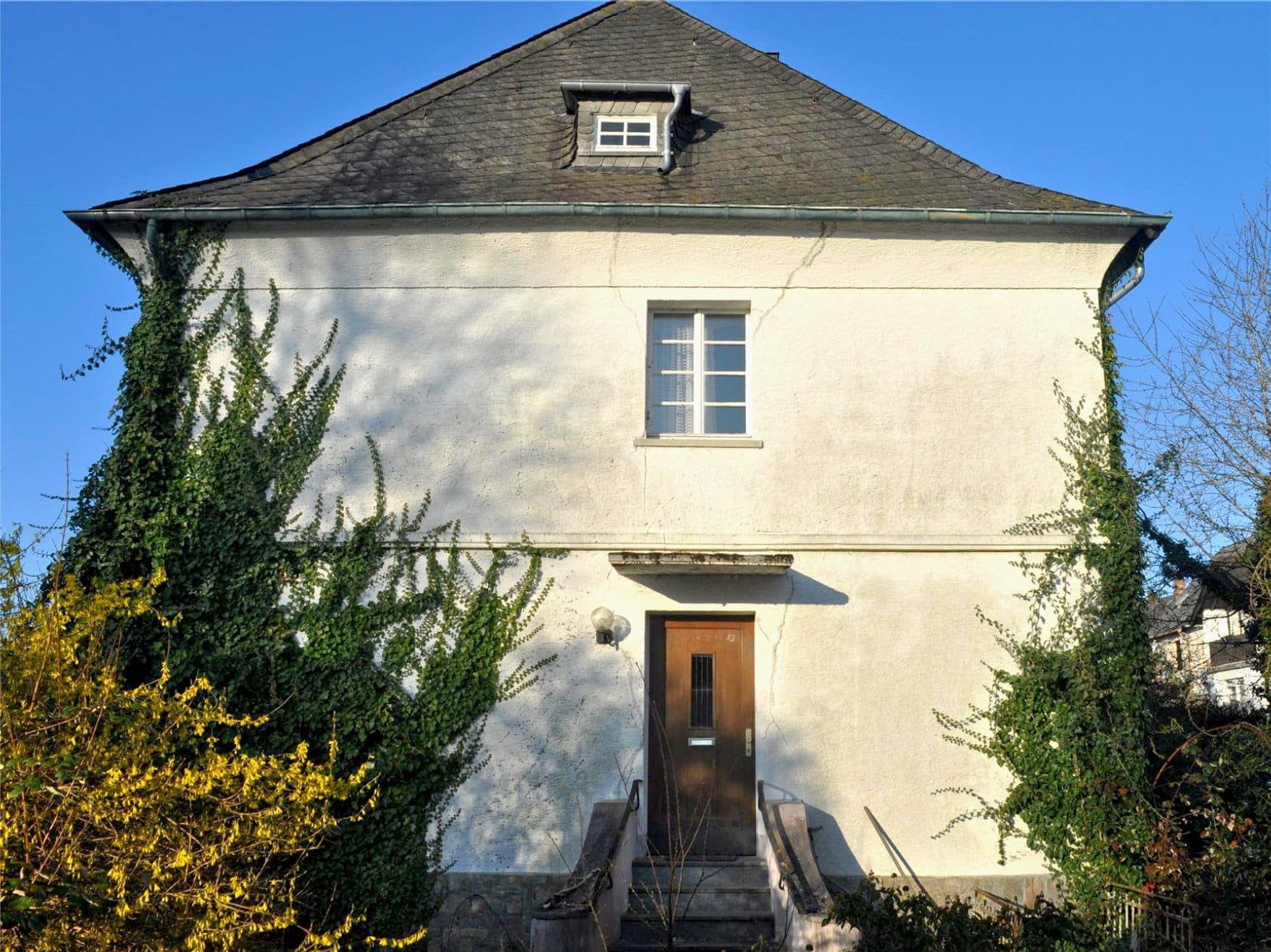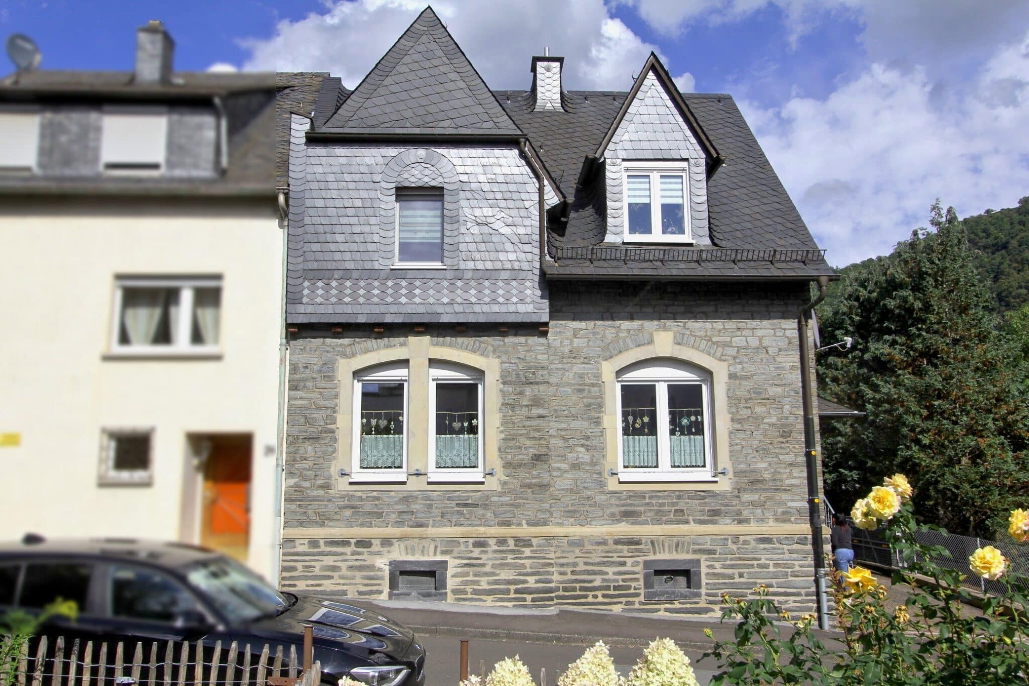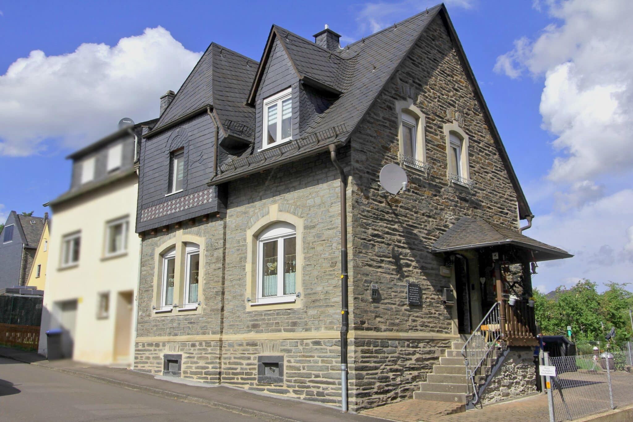 Im Jahre 1904 wurde im Stadtteil Trarbach, ca. 200 Meter von der Mosel entfernt, das zu verkaufende malerische Wohnhaus erbaut. Es handelt sich um ein typisches Moselhaus aus der späten Gründerzeit bzw. frühen Jugendstilzeit. Hier sind die architektonischen Merkmale im Detail: Natursteinfassade (Bruchsteinmauerwerk), Sandsteingewände um die Fenster, die die Öffnungen betonen und einen schönen Kontrast zum grauen Bruchstein bilden, Steildach mit Schieferdeckung und dekorativen Elementen. Ziergiebel und Dachgauben verleihen dem Haus eine repräsentative, leicht verspielte Form. Segmentbogenfenster sind typisch für den Historismus, oft eine Reminiszenz an romanische oder klassizistische Formen. Gesimse und Sockelzone sind sauber gegliedert, was dem Baukörper Struktur und Eleganz verleiht.