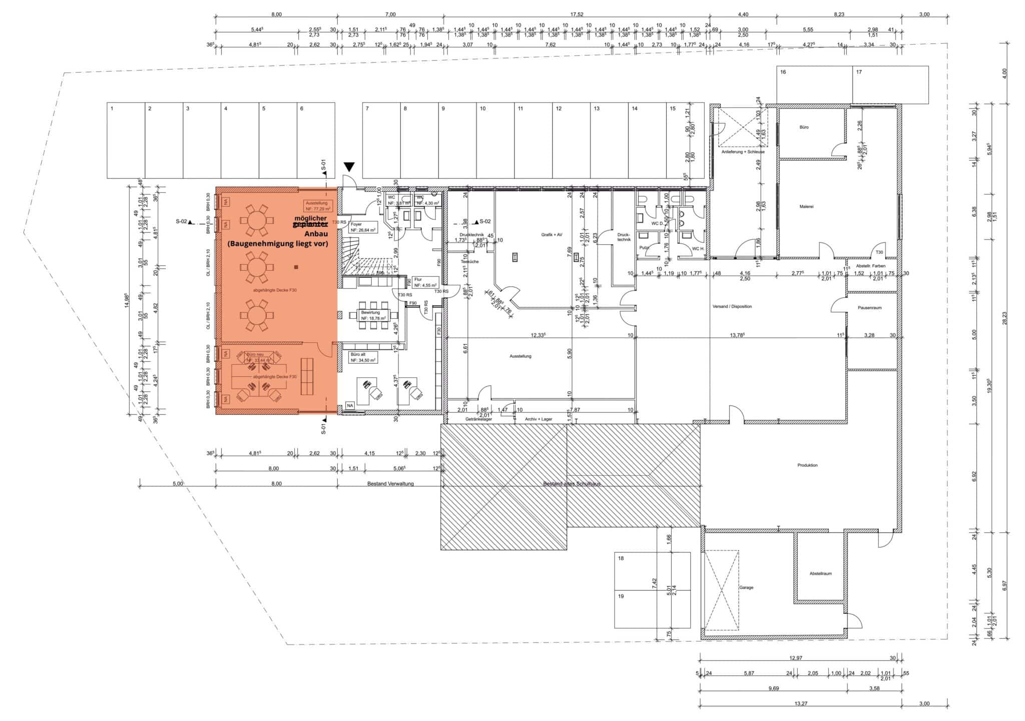 Eine Erweiterung des Bürotraktes wurde bereits baurechtlich genehmigt. Die Unterlagen zur Erweiterungsplanung können bei Bedarf vom Käufer übernommen werden.