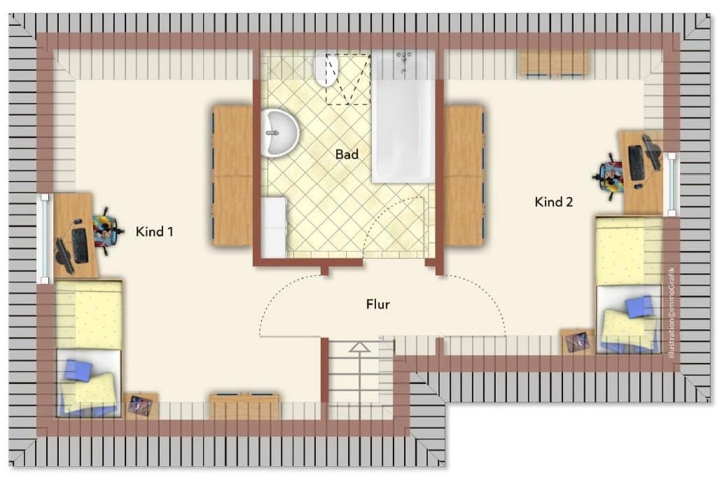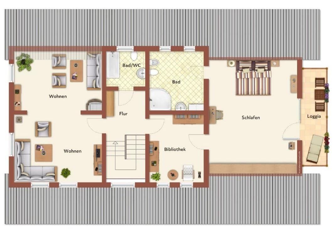 Die durchdachte Grundrissgestaltung ermöglicht fließende Übergänge zwischen den einzelnen Bereichen und lässt Raum für individuelle Wohnideen. Ob für gesellige Stunden mit Gästen oder entspannte Momente im privaten Rückzugsbereich – hier entsteht ein Wohnambiente, das gleichermaßen repräsentativ wie komfortabel ist.