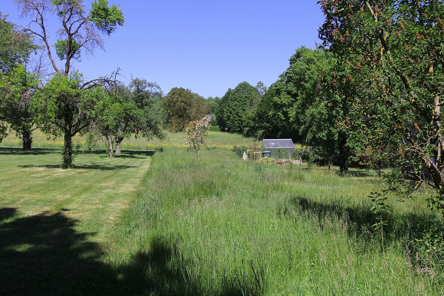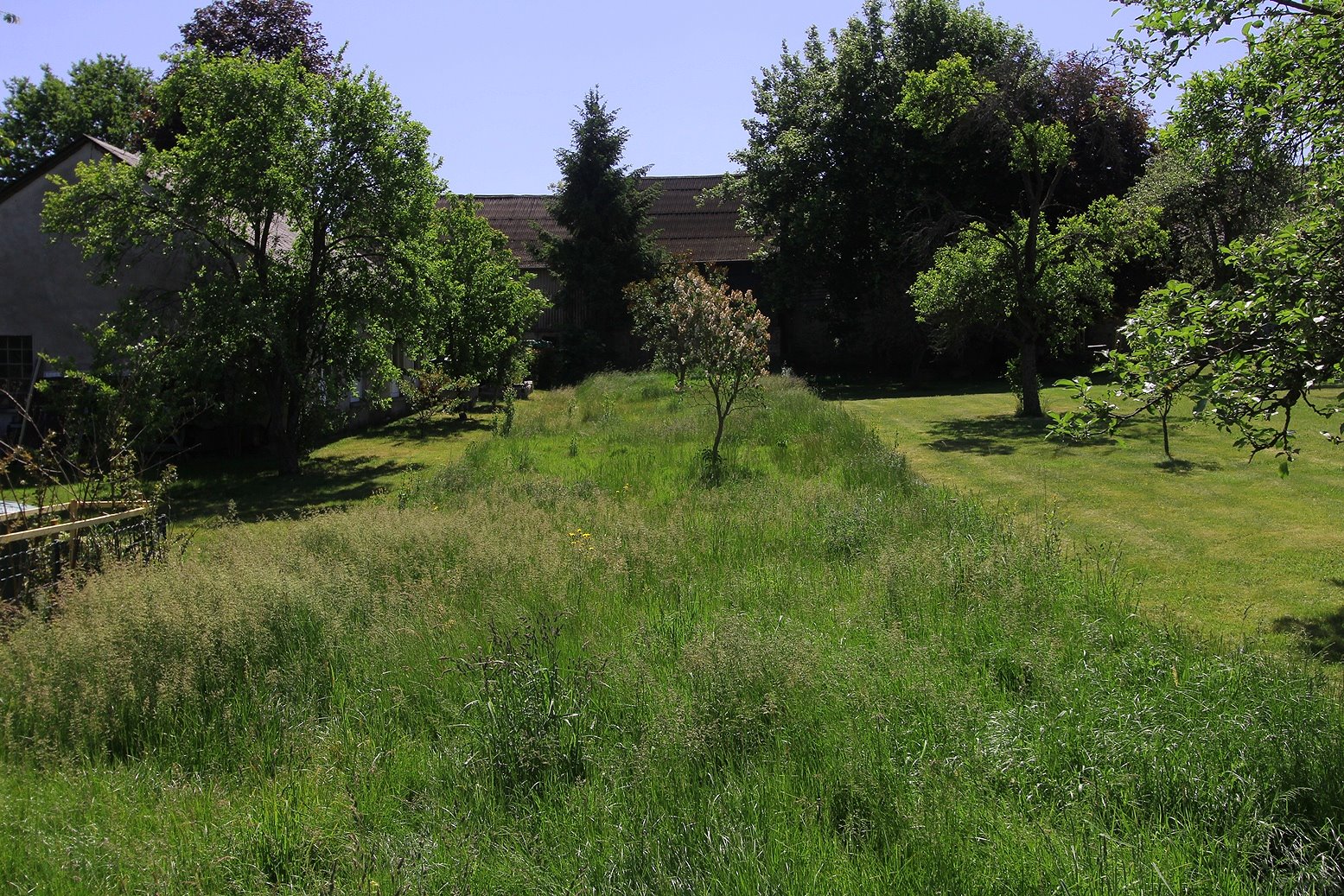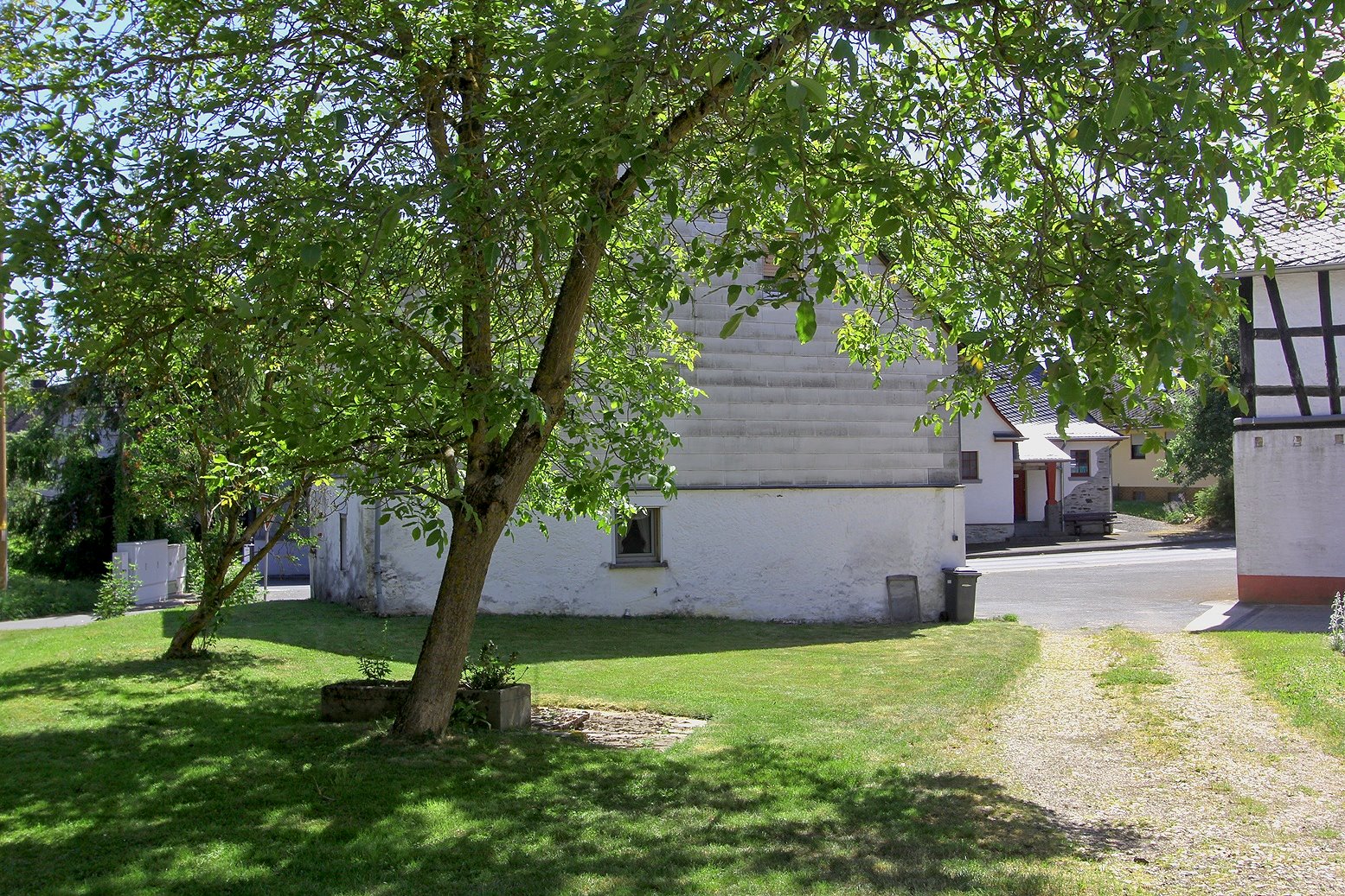 Durch den rückwärtigen Ausgang der Scheune gelangt man zur hauseigenen Wiesen-/Gartenfläche, die an der nordwestlichen Grenze an einem geteerten Wirtschaftsweg endet.