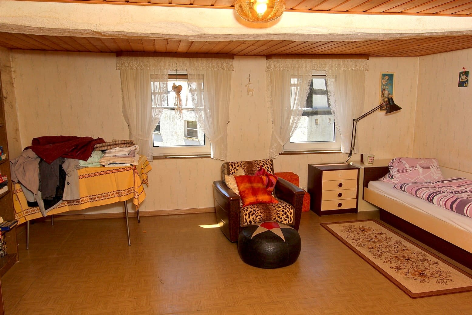 Die Wohnfläche beträgt ca. 120 m². Im Erdgeschoss befinden sich Wohnzimmer, Küche und Vorratsraum, im Obergeschoss Wohn-/Schlafzimmer, Schlafzimmer, Abstellraum und WC und im Dachgeschoss 2 Schlafzimmer (davon 1 Durchgangszimmer) und Bad (Wanne, WC, Waschmaschinenanschluss). Bitte beachten: Die Deckenhöhen betragen im Erdgeschoss 1,93-2,20 m, im Obergeschoss 1,88-2,13 m und im Dachgeschoss 1,82-1,92 m.