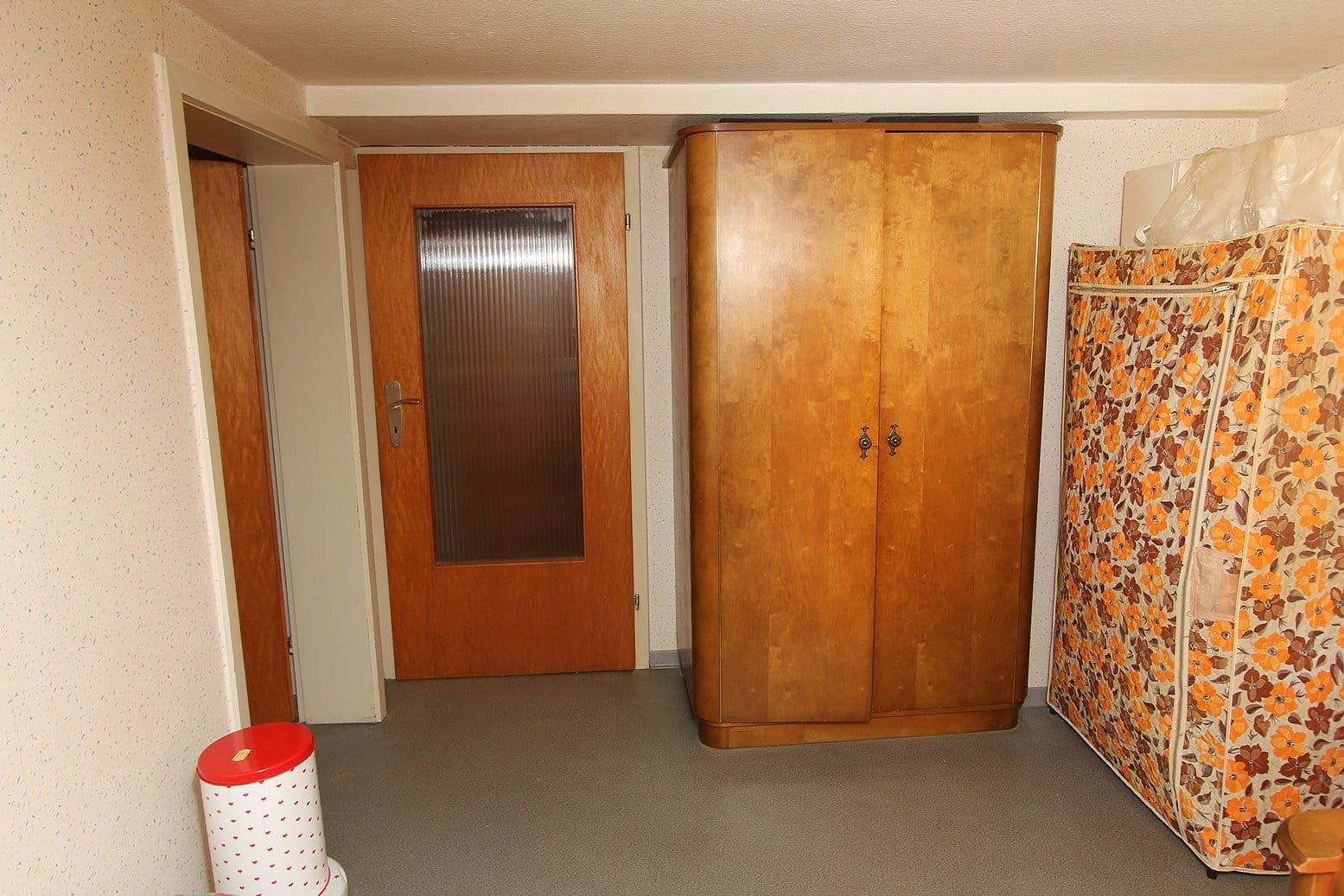 Zu vermieten ist die Obergeschosswohnung im Gebäude Hauptstraße 61 A. Im Erdgeschoss befinden sich zwei überdachte Kfz-Abstellplätze, die üblichen Kellerräume und der Eingang zum Treppenhaus.