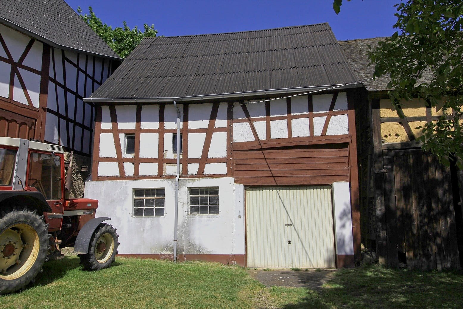 In einer Entfernung von etwa 20 Metern zum Wohnhaus steht die Fachwerkscheune mit Garagentor, die links und rechts von weiteren Wirtschaftsgebäuden umgeben ist. Das Dach der Scheune ist mit Welleternit eingedeckt.