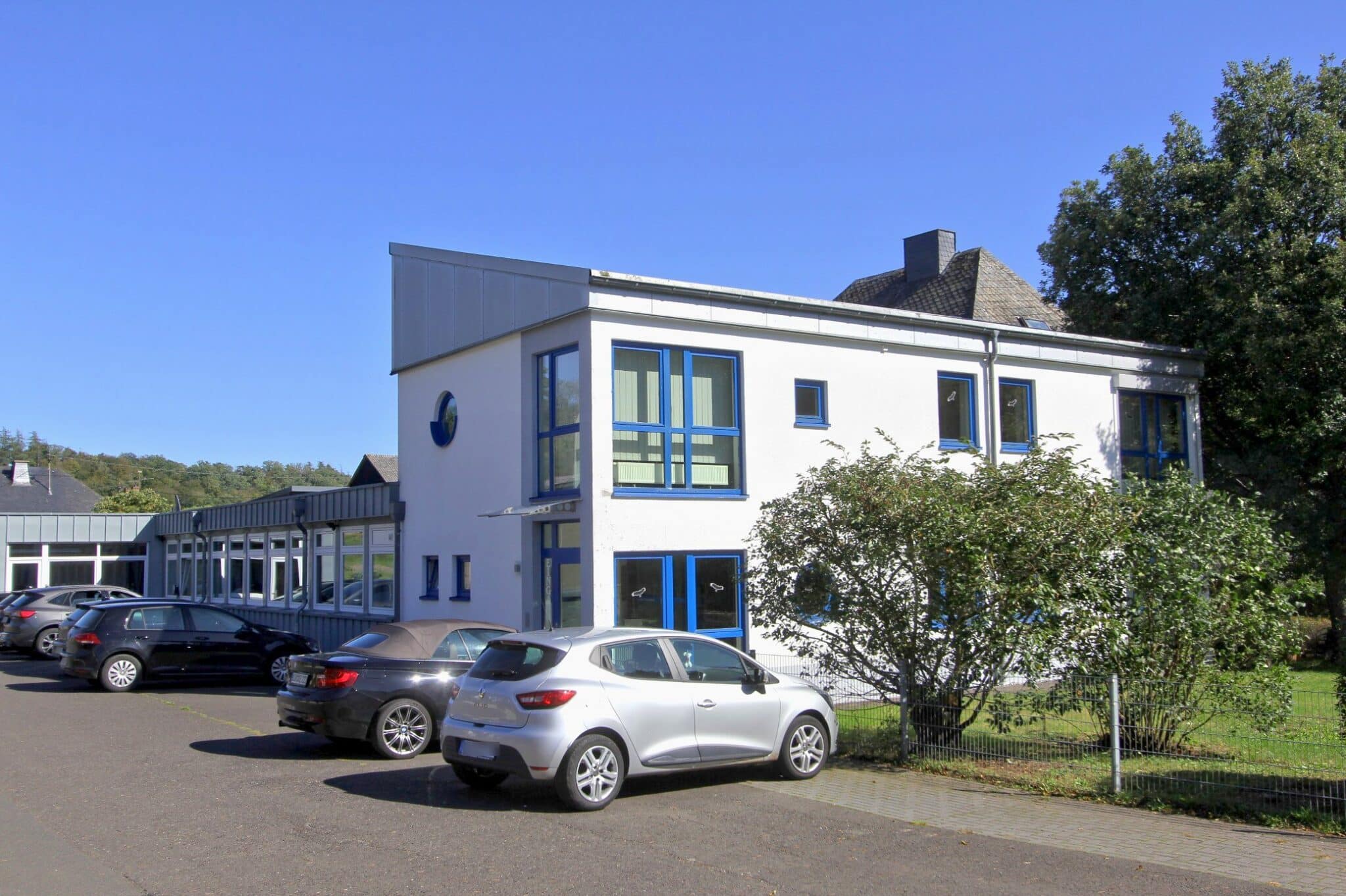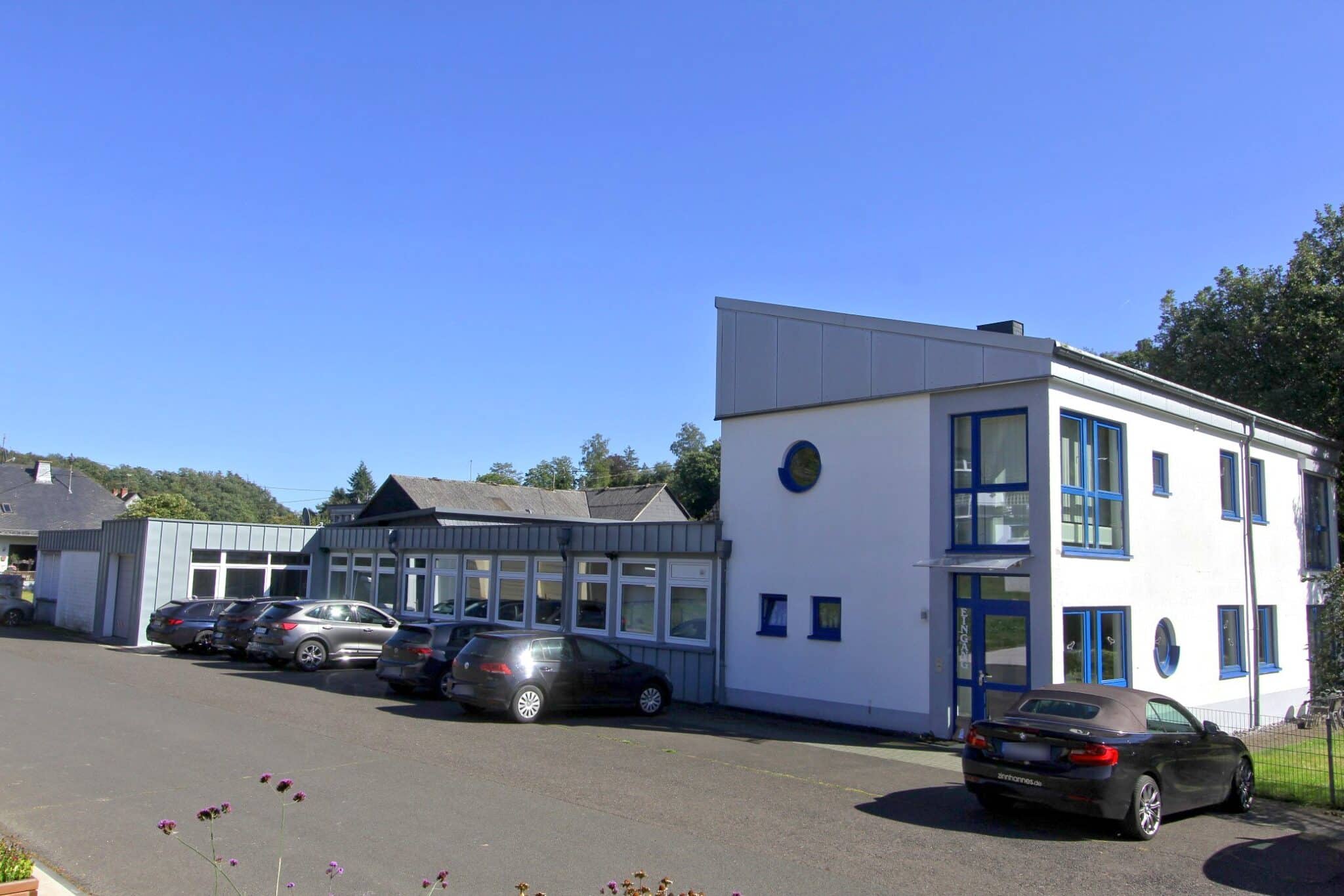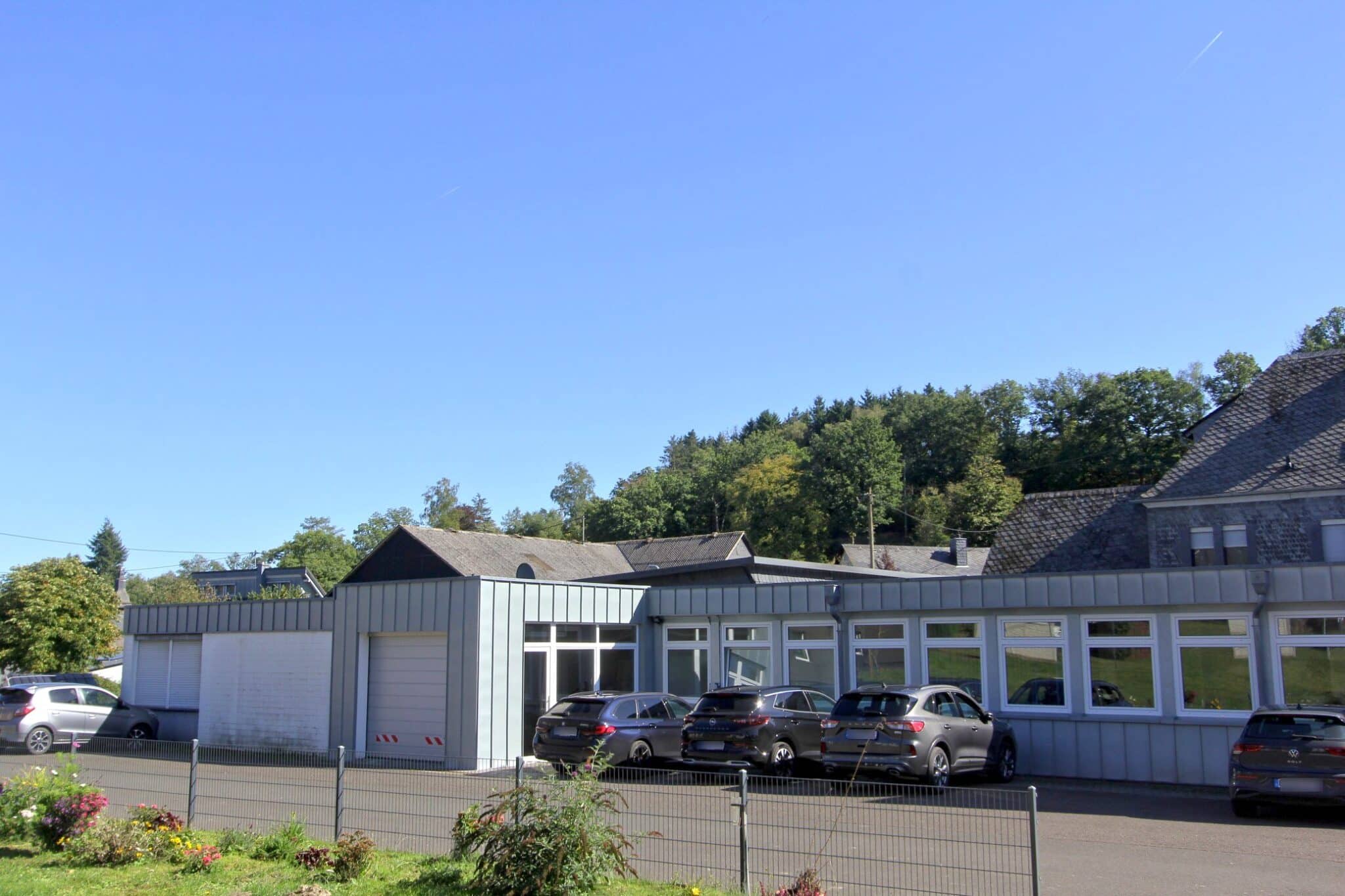 Für Mitarbeiter und Kunden stehen 17 Kfz-Stellplätze sowie 3 Garagen zur Verfügung. Das großzügige Grundstück ermöglicht zudem eine klare Trennung von Verkehrs-, Arbeits- und Grünflächen.