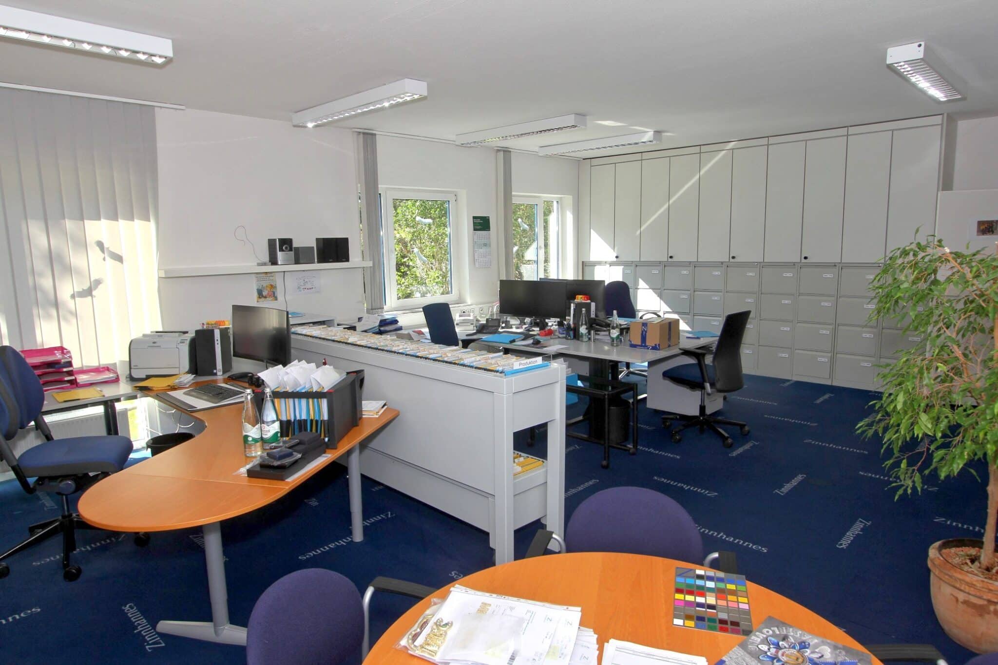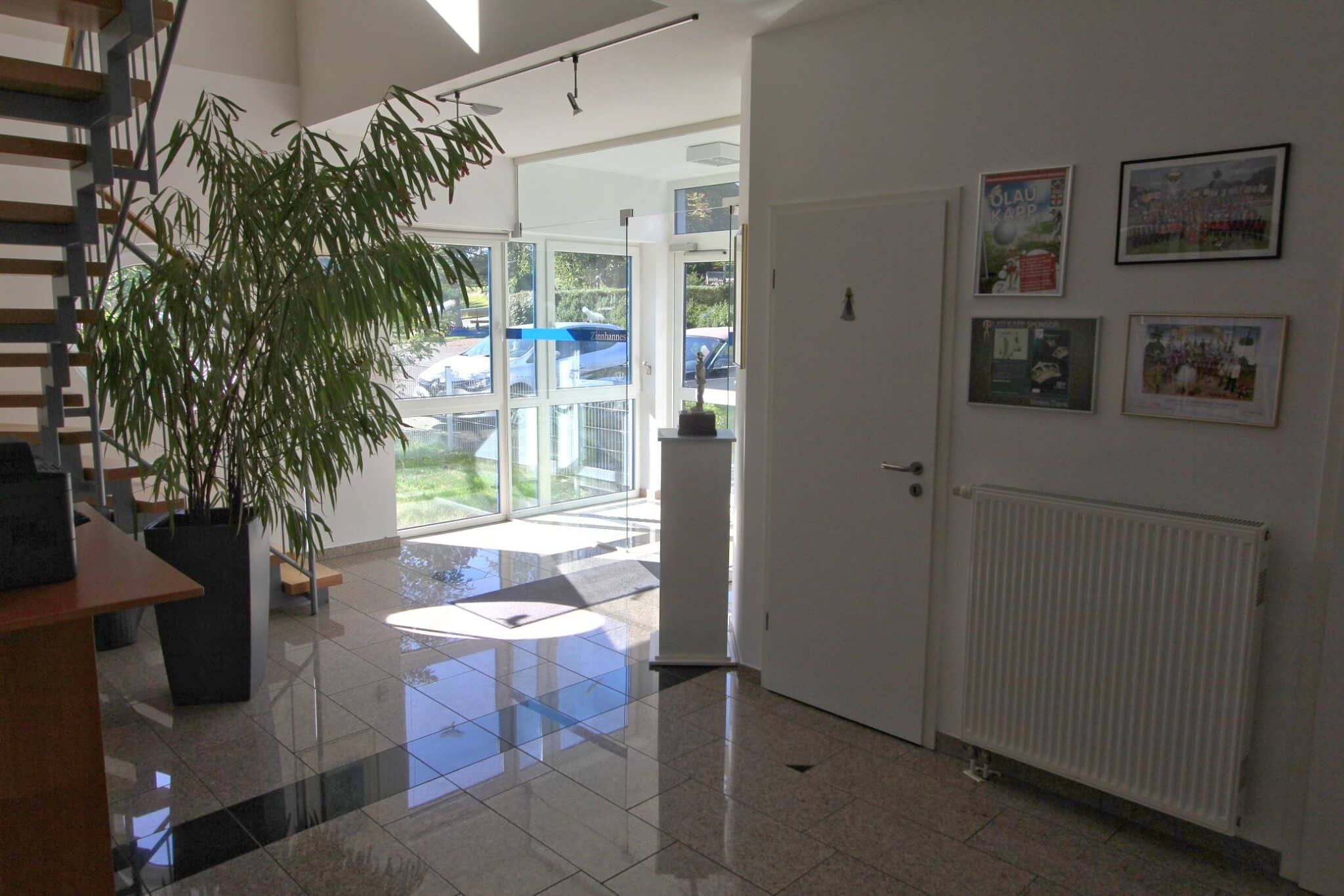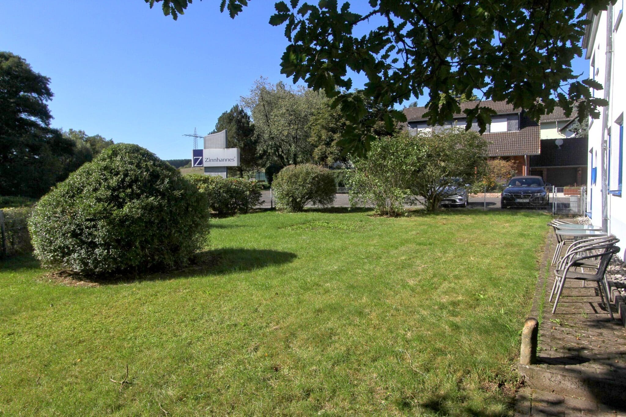 Für Mitarbeiter und Kunden stehen 17 Kfz-Stellplätze sowie 3 Garagen zur Verfügung. Das großzügige Grundstück ermöglicht zudem eine klare Trennung von Verkehrs-, Arbeits- und Grünflächen.